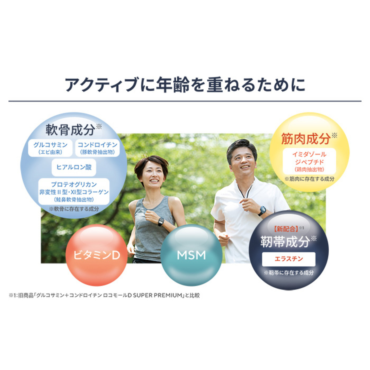 エビ由来のグルコサミン塩酸塩を約1600mg、豚軟骨抽出物(コンドロイチン含有)を約150mg、ヒアルロン酸を約6mg配合(*1)。配合しているヒアルロン酸は低分子のものを使用しています(*2)。鮭鼻軟骨抽出物(非変性II型・XI型コラーゲン、非変性プロテオグリカン含有)は約3.35mg配合(*1)。配合している鮭鼻軟骨抽出物は、北海道で水揚げされた鮭を使用しています