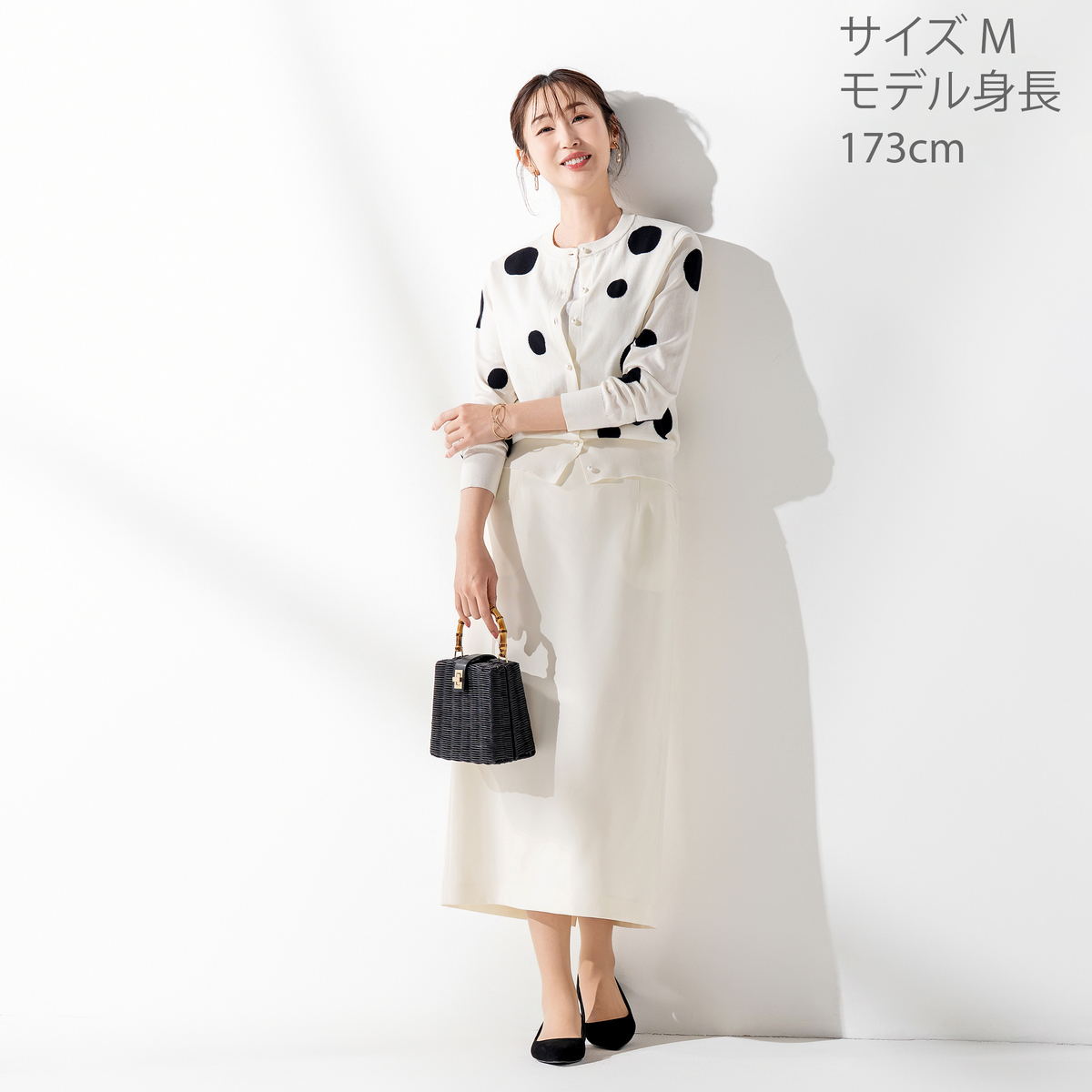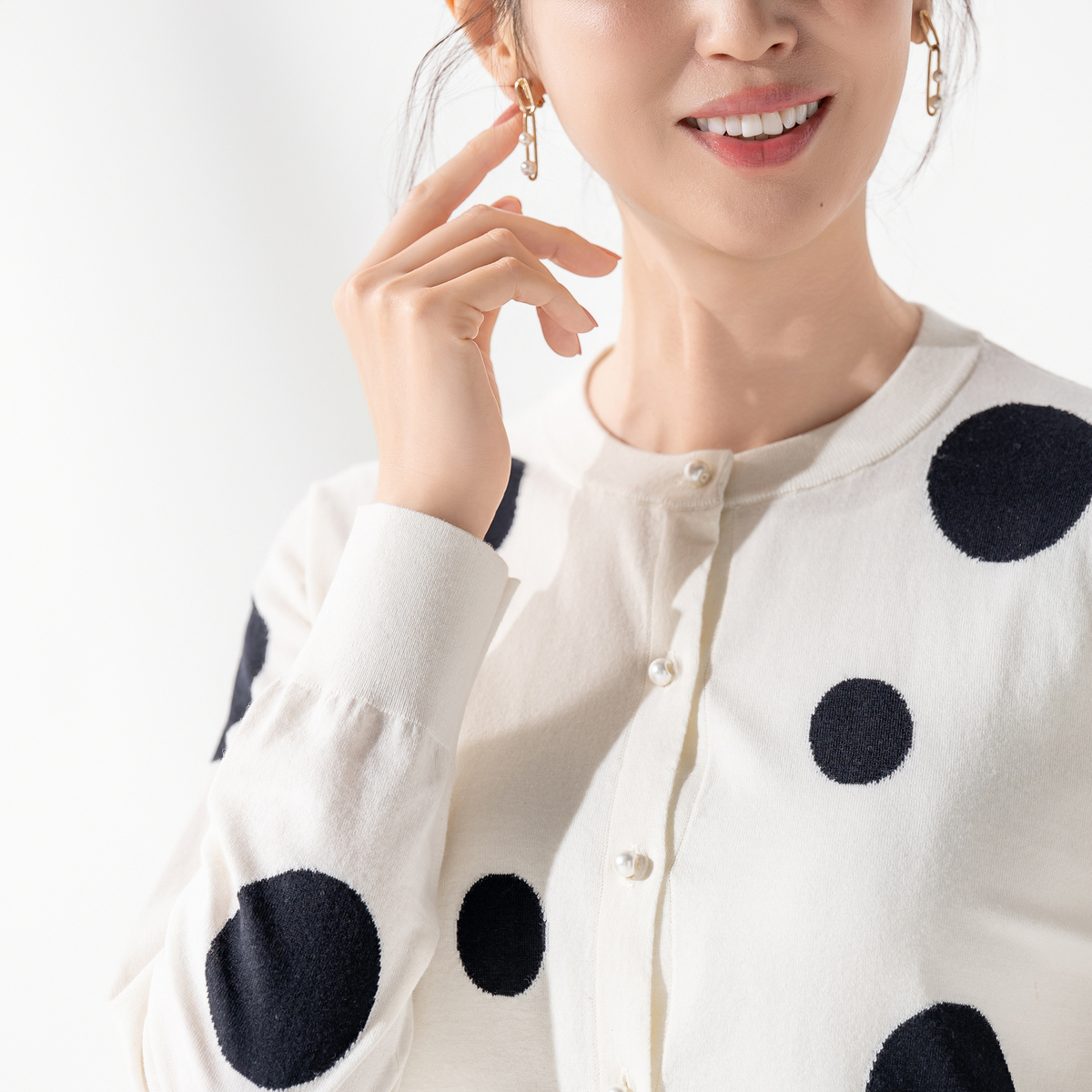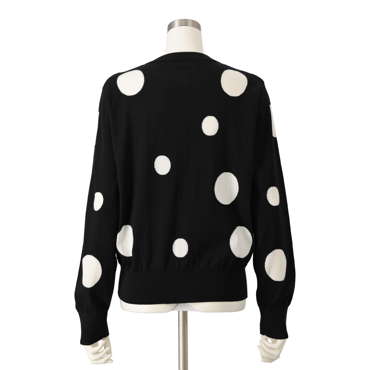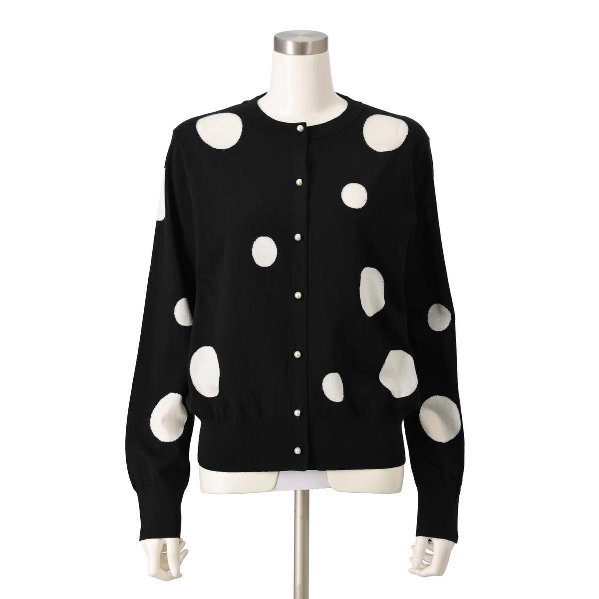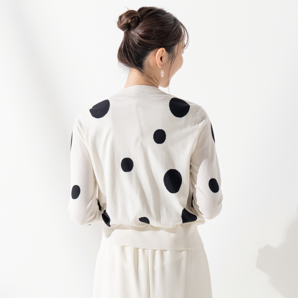 16Gインターシャジャガードで編み上げた大きな水玉模様が目を引くカーディガン。コーディネートの主役として華やかさを添えながら、個性を引き立てます