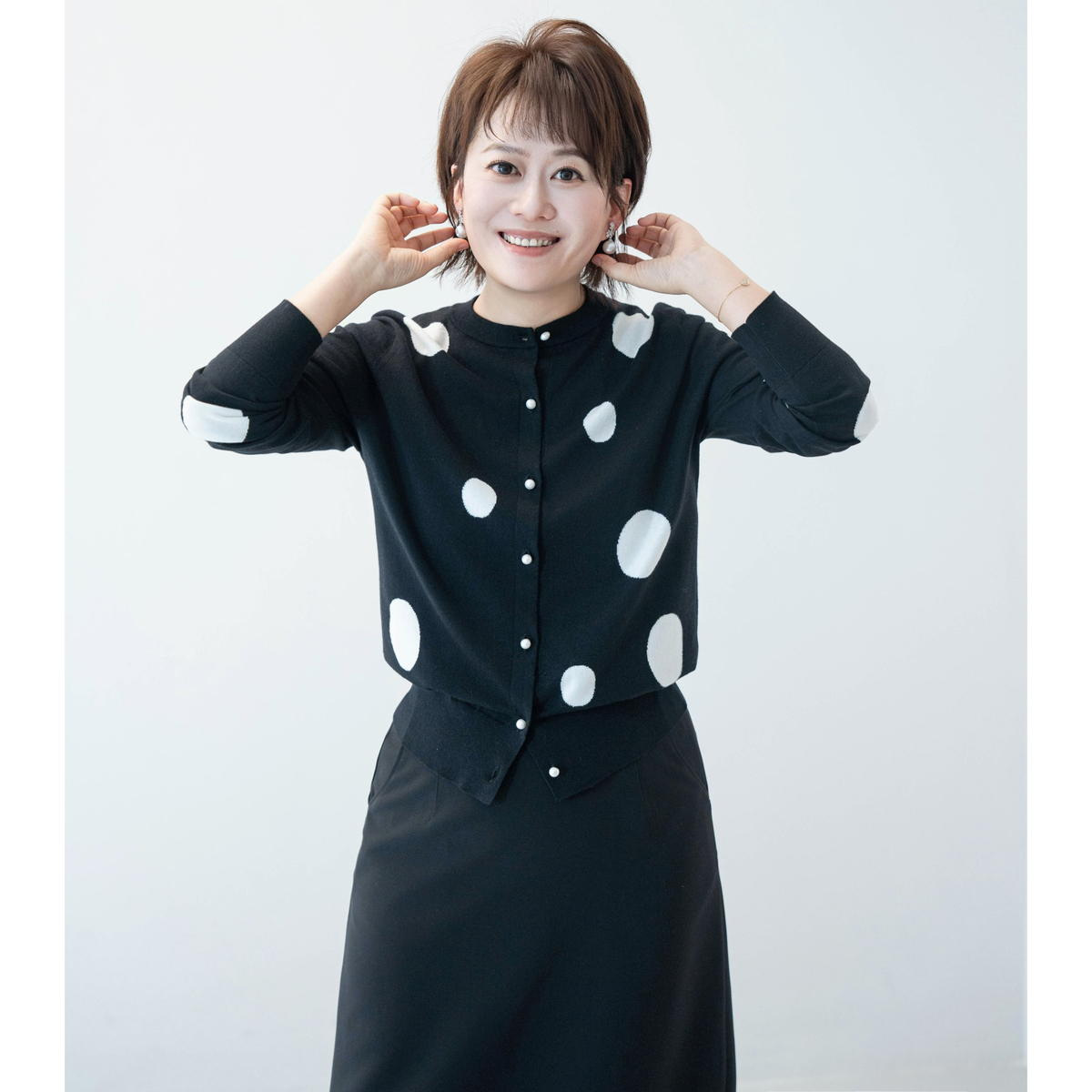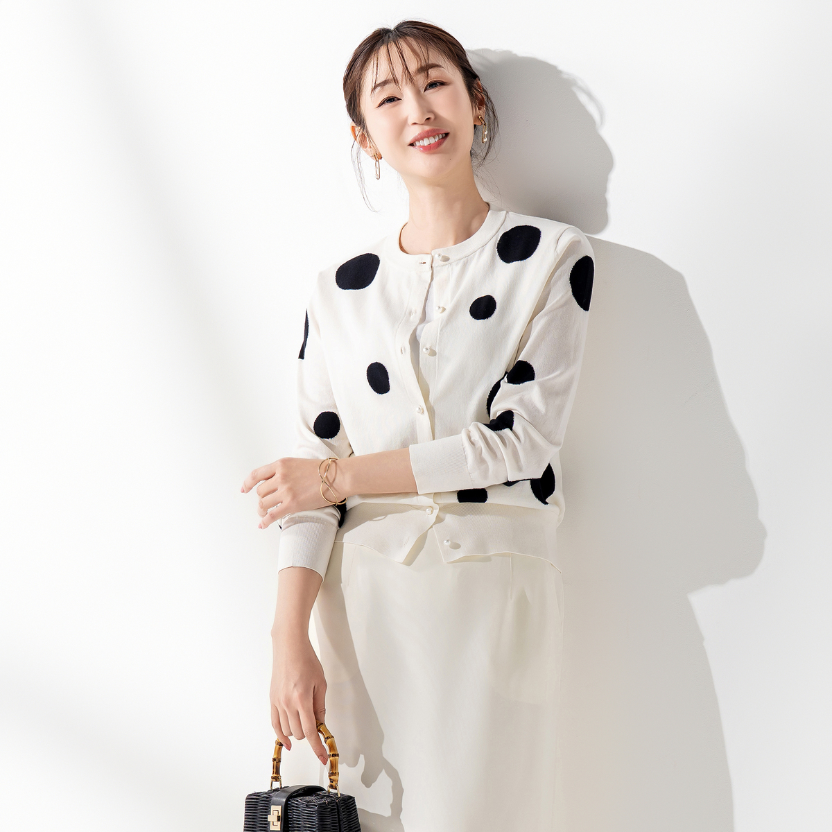 16Gインターシャジャガードで編み上げた大きな水玉模様が目を引くカーディガン。コーディネートの主役として華やかさを添えながら、個性を引き立てます