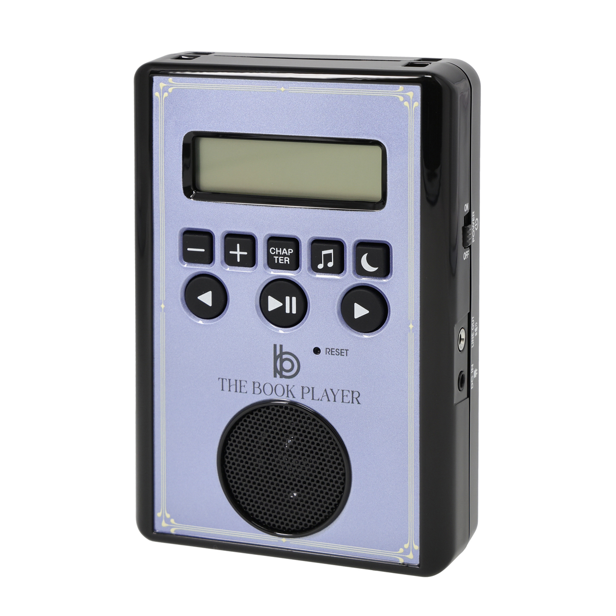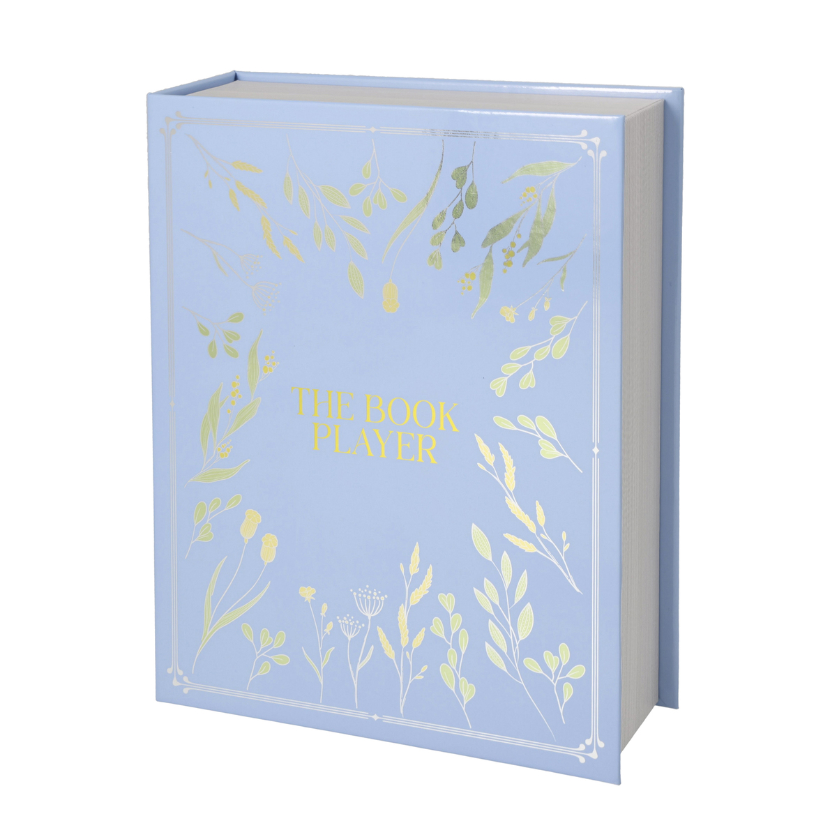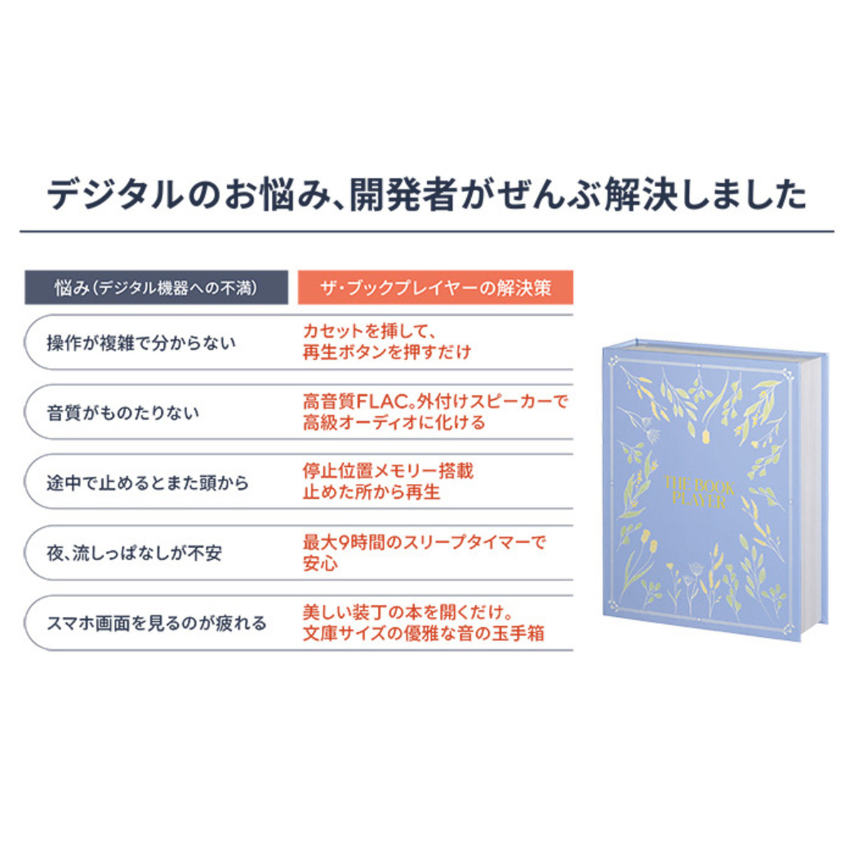 まるで洋書のような見た目のケースに入った軽量小型の音楽プレーヤー。表紙を開ければプレイヤー、電池、ACアダプターがブリスターにすっきり収納されています。音楽を楽しんだ後は本棚にしまってもおしゃれです