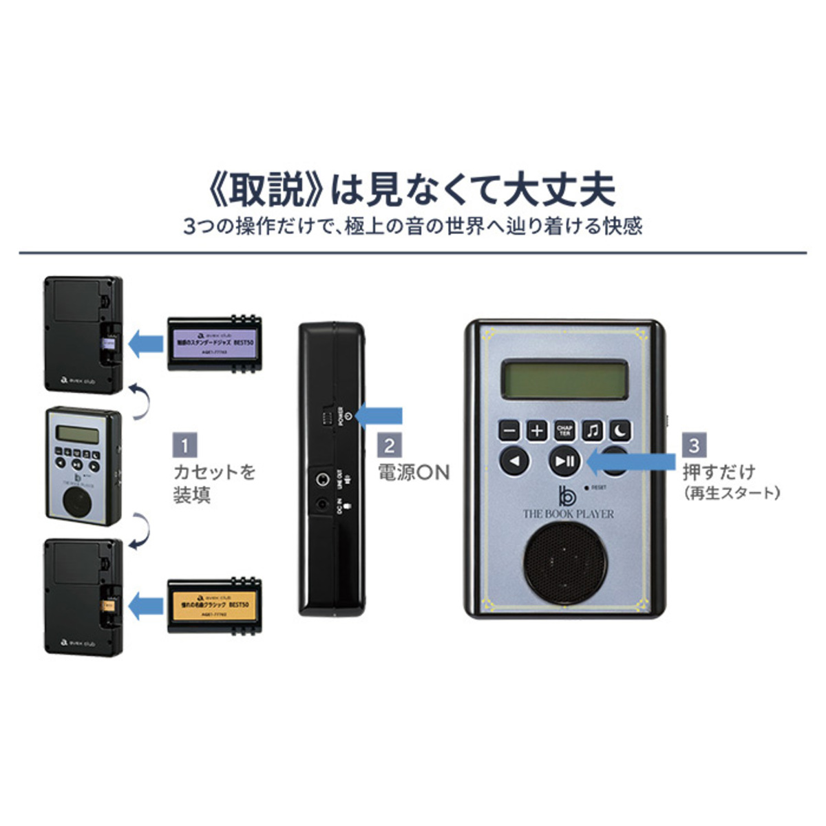 音楽が収録された専用カセットを入れて、音楽再生を楽しむオリジナルな方式。「魅惑のスタンダード・ジャズBEST50(*1)」が装着された状態でお届けします。また、他の専用カセット入れることで様々な音楽が楽しめます