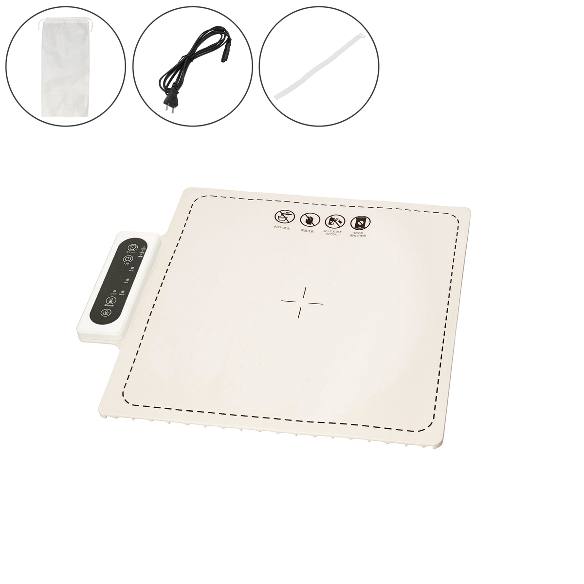 [商品内容] ・本体 ・電源ケーブル ・バンド ・収納袋 [サイズ] 43.8×37.8×2cm [重量] 751g [材質] シリコン、ABS [コード長さ] 約150cm [消費電力] 約120W [使用方法] 1.本体を平らで安全な場所に広げます ※高温に弱い物(耐熱性のないプラスチック製品、ビニール生地等)の上では使用しないでください 2.電源ポートに付属の電源ケーブルを接続し、プラグをコンセントに差し込むと設定温度のランプが点滅します 3.プレート部分に温めたいものをのせます ※密閉した容器、耐熱性のない食器等は使用できません ※金属製の食器は高温になる可能性がありますので使用しないでください 4.電源ボタンを押すと電源が入り、プレートが温かくなっていきます。電源を切るには再度電源ボタンを押してください 5.温度変更ボタンを押すたびに設定温度を変更することができます ※使用する食器、容器の耐熱温度に合わせて温度設定をしてください 6.タイマーボタンを押すたびに自動で電源が切れる時間を変更することができます <使用後> 1.電源を切り、電源ケーブルを外します ※使用直後はプレートが高温になっていますのでご注意ください 2.15分ほど放置してプレートを冷ましてください 3.プレートが汚れた場合は水で濡らした布を硬く絞り、拭いてください ※本製品は水洗いできません。漂白剤など酸性の薬剤は使用しないでください 4.プレートが冷めたことを確認し、プレートを巻いて付属のバンドで留めて保管してください ■取り扱い説明を充分にご確認の上、ご使用下さい 【中国製】