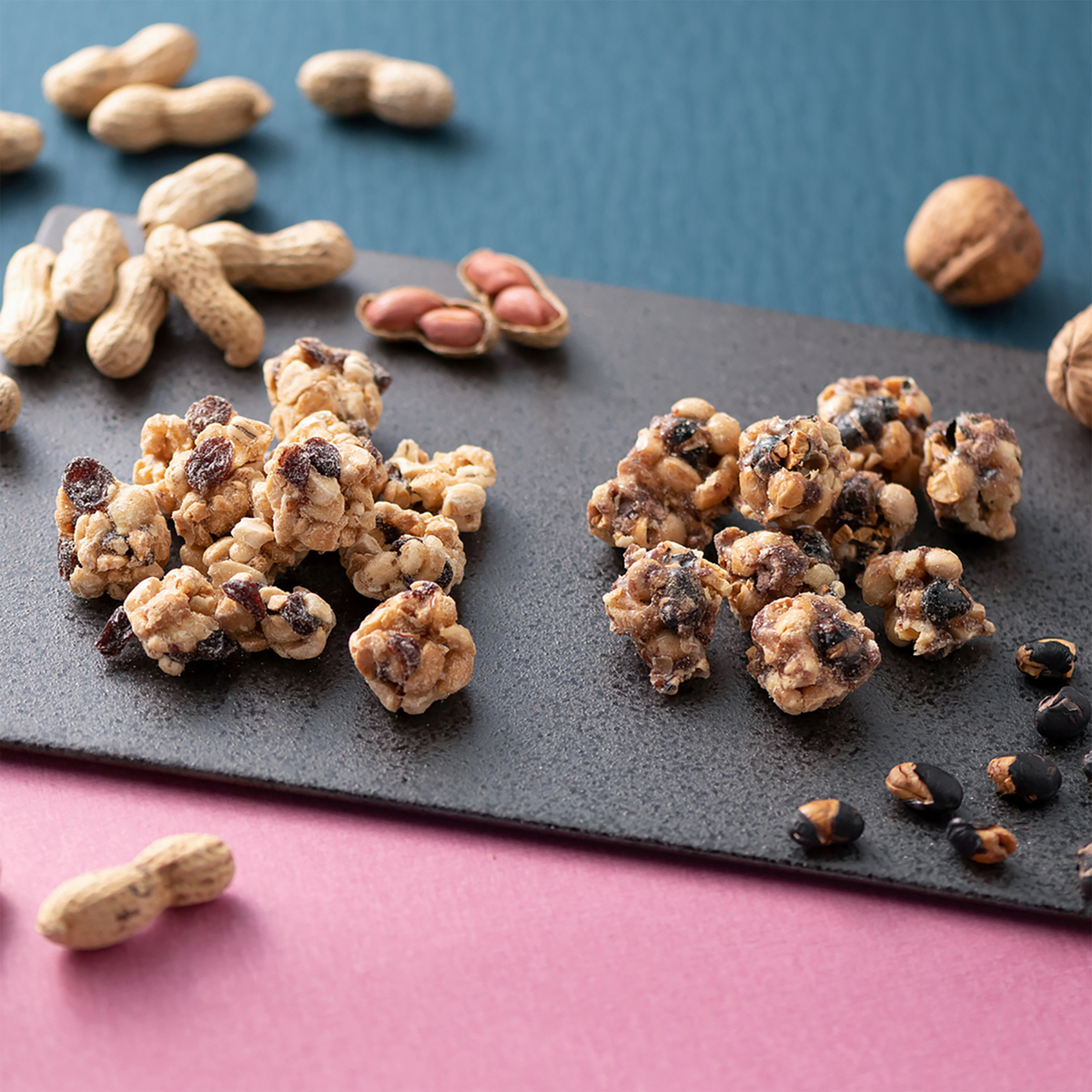 レーズンや黒豆、小豆*などを落花生と一緒に蜜で固め、ひと口サイズに仕上げました。2種の味が楽しめます