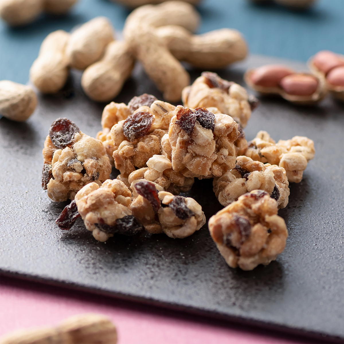 レーズンの酸味と大麦パフの香ばしさ、落花生のコクが三位一体に。一度食べたら止まらなくなるような美味しさです