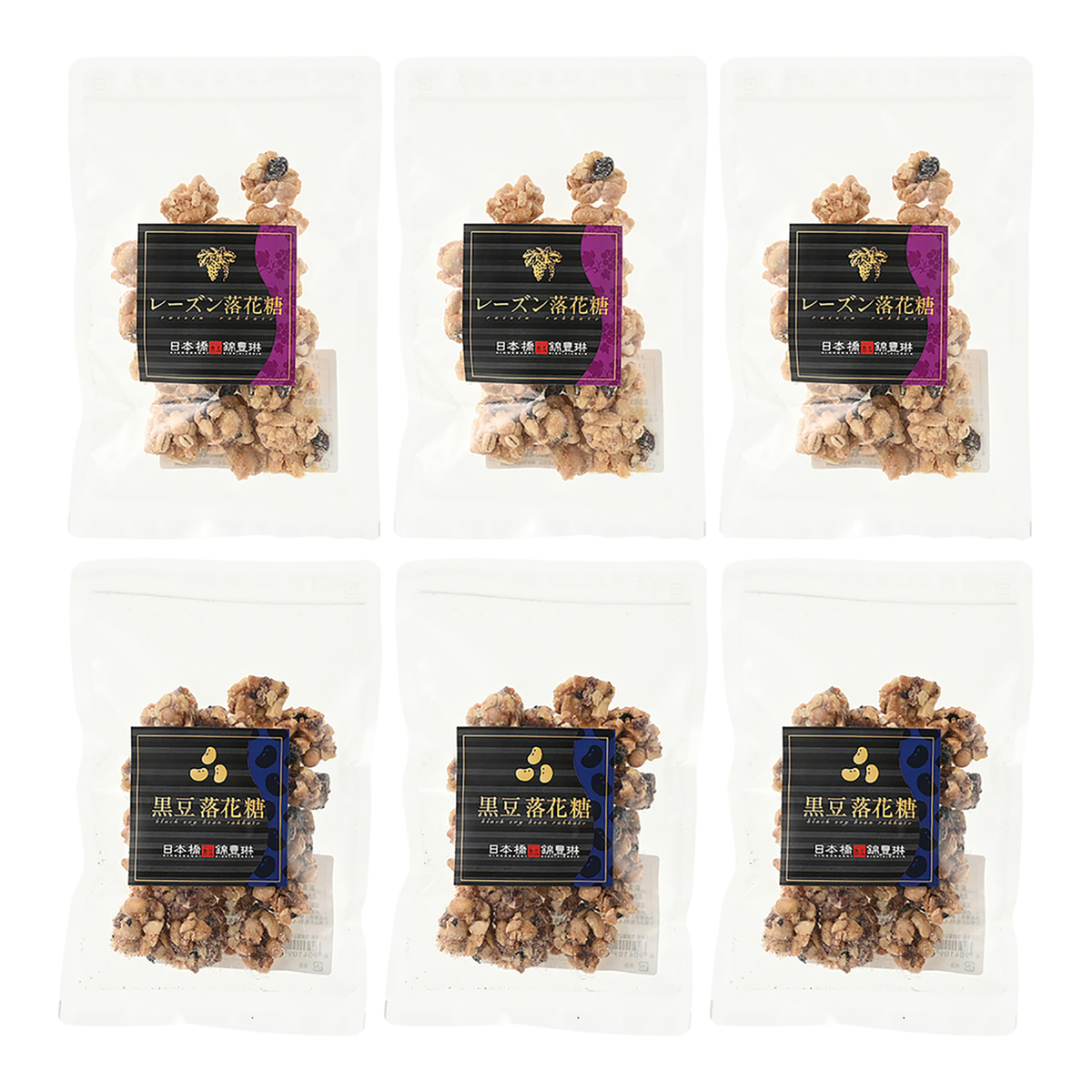 [アレルギー物質特定原材料8品目] 落花生、くるみ [商品内容] ・レーズン落花糖100g×3袋 ・黒豆落花糖100g×3袋 計2種/6袋 [賞味期限] 出荷時点で賞味期限まで40日以上ある商品をお届けします [保存方法] 開封前:直射日光、高温多湿をさけて保存してください 開封後:開封後はお早めにお召し上がりください [原料原産地] レーズン落花糖:落花生(アルゼンチン又はブラジル) 黒豆落花糖:還元水飴(国内製造) [原産国] 日本 [原材料] レーズン落花糖:落花生(アルゼンチン又はブラジル)、砂糖、水あめ、レーズン、大麦パフ、植物油脂、加工黒糖、食塩 黒豆落花糖:還元水飴(国内製造)、大豆、落花生、砂糖、麦芽糖、黒大豆、乾燥小豆甘納豆(小豆、砂糖)、くるみ