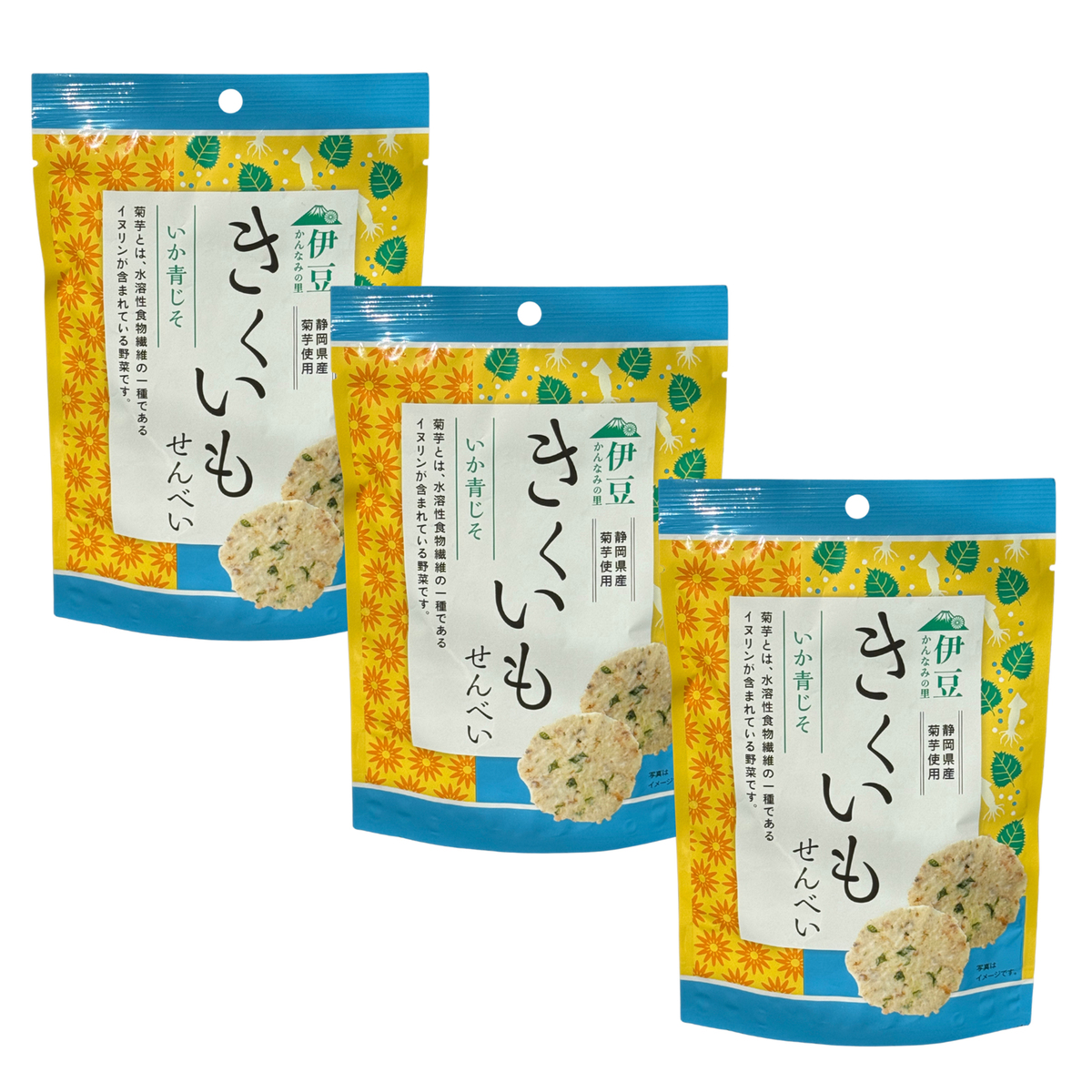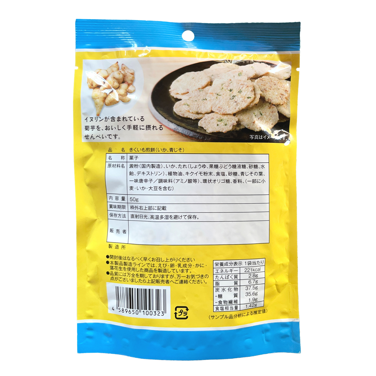 菊芋の粉末を練り込んだ甘辛煎餅。青じその風味とイカの旨味が楽しめます。おやつやおつまみとして、手軽に美味しく菊芋を摂取できます