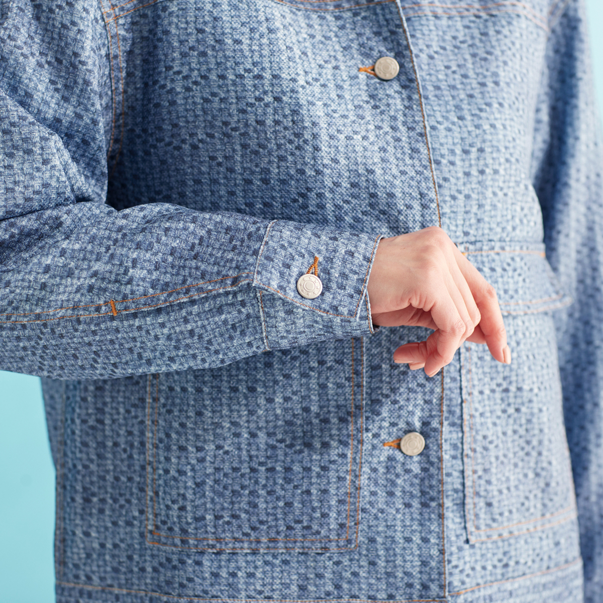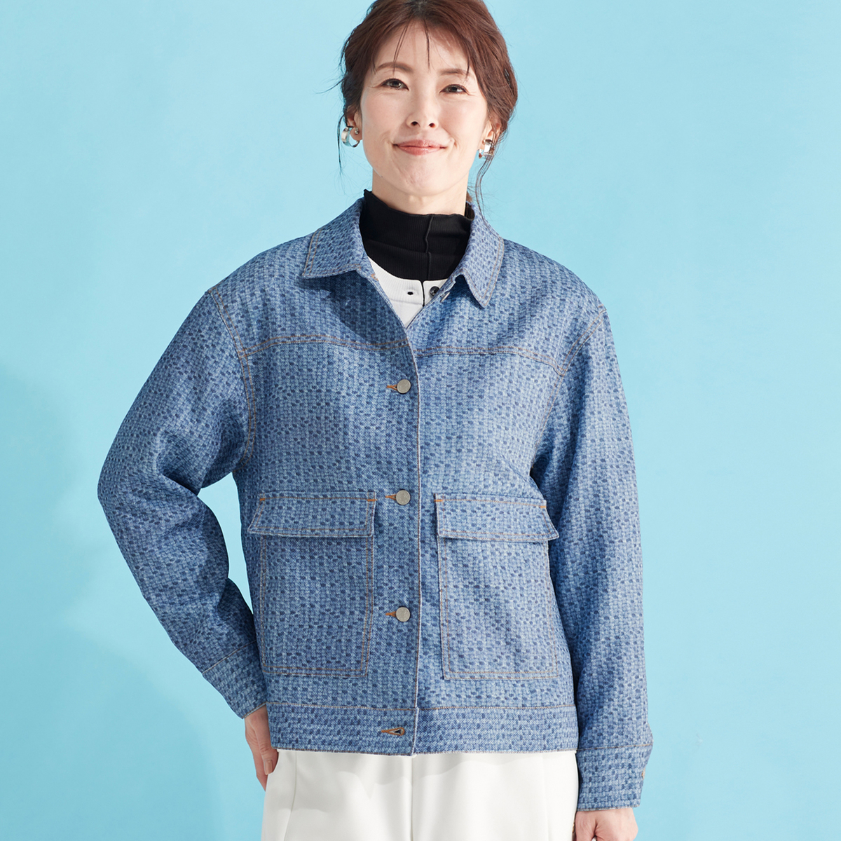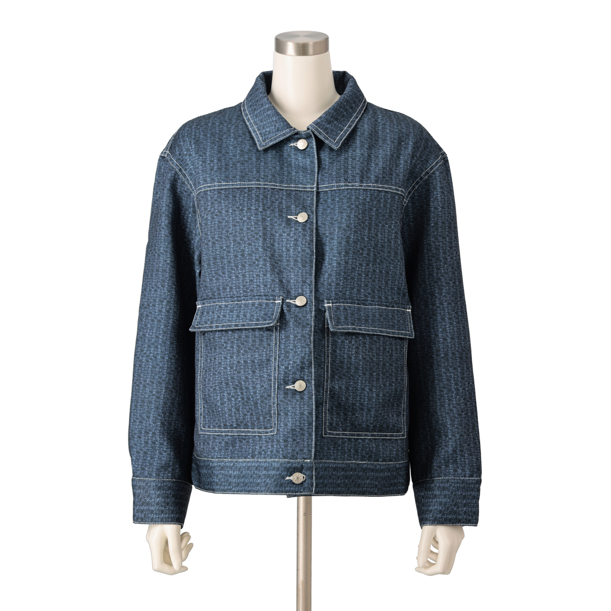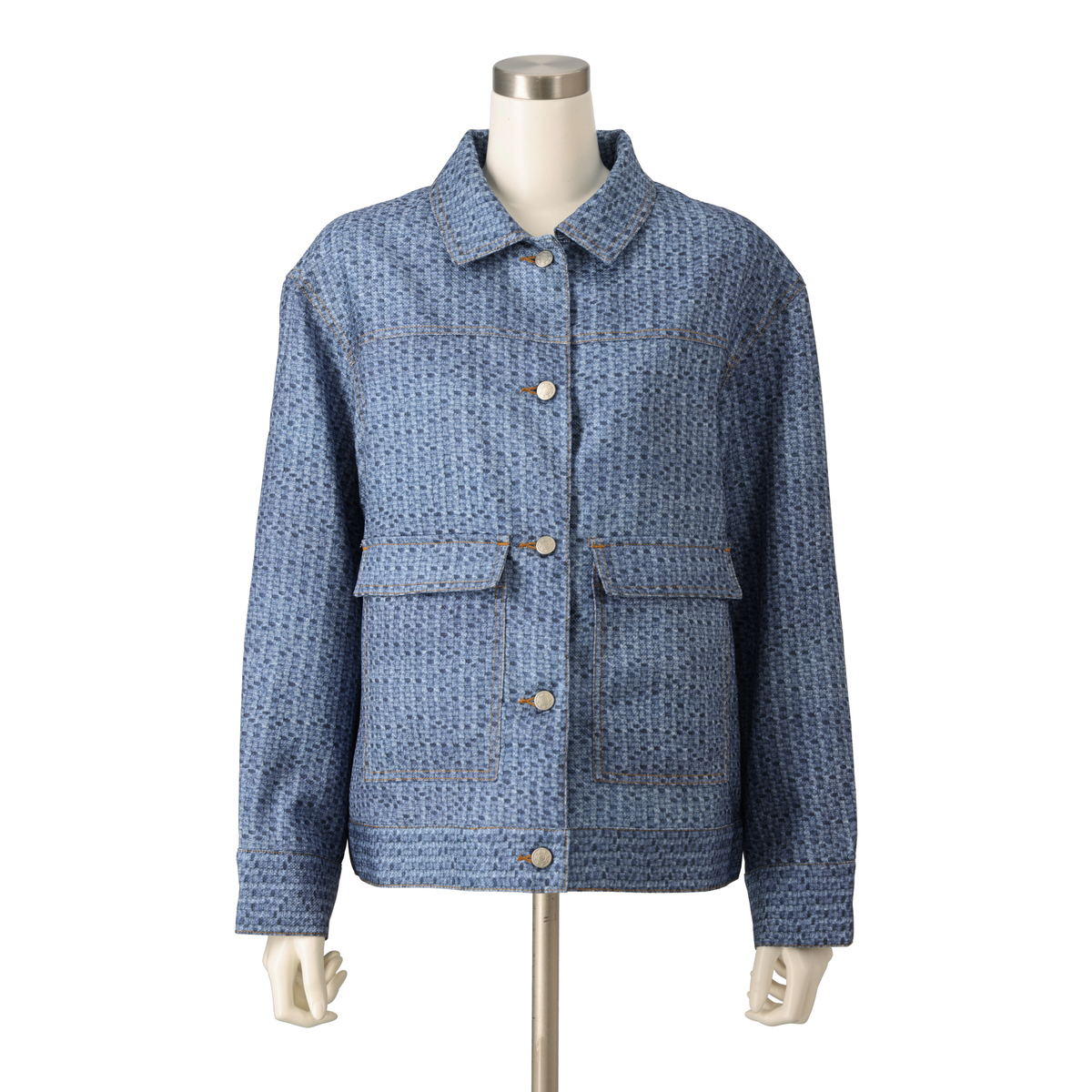 デニム風のプリントを施したオリジナル生地で仕立てたジャケット。デニムジャケットらしい配色ステッチやボタンが特徴です