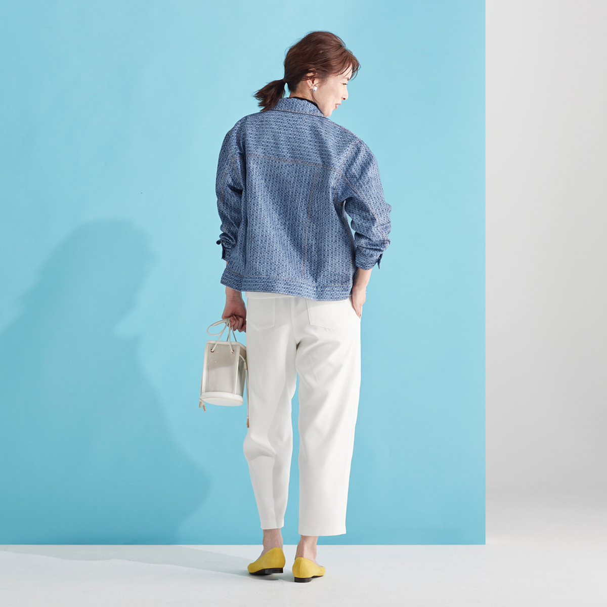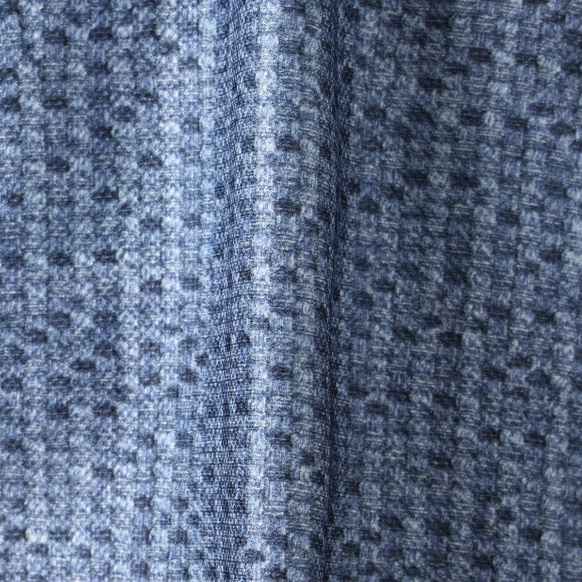横糸を引き揃えた表面感のある生地に、ポコポコした変わり織りデニム風のプリントを施しています。デニム特有の重さや硬さがなく、軽やかで程良く柔らかな素材感です