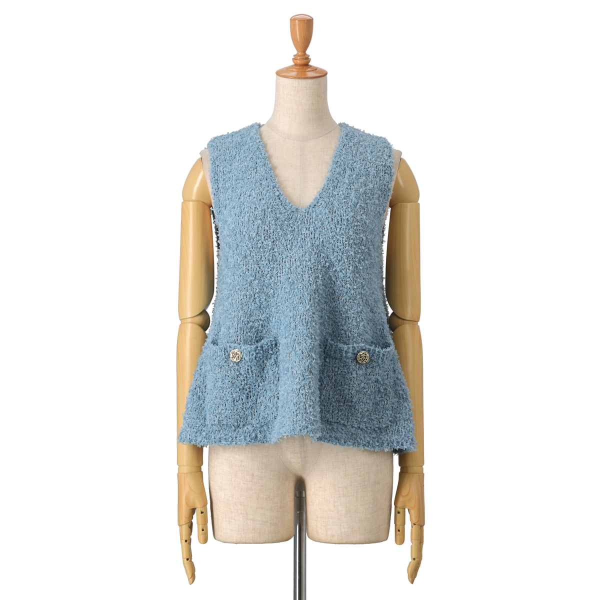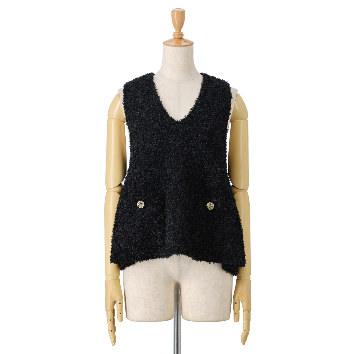 首元をスッキリ見せるVネックとペプラムデザインの美しいシルエットに拘りました。フロントポケットには金調のボタンを付けてクラッシックな要素をプラス。カットソーなどの上に着るだけで映えるレイヤードの着こなしになります