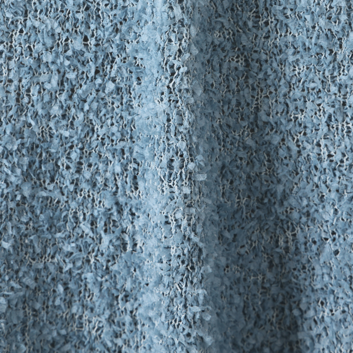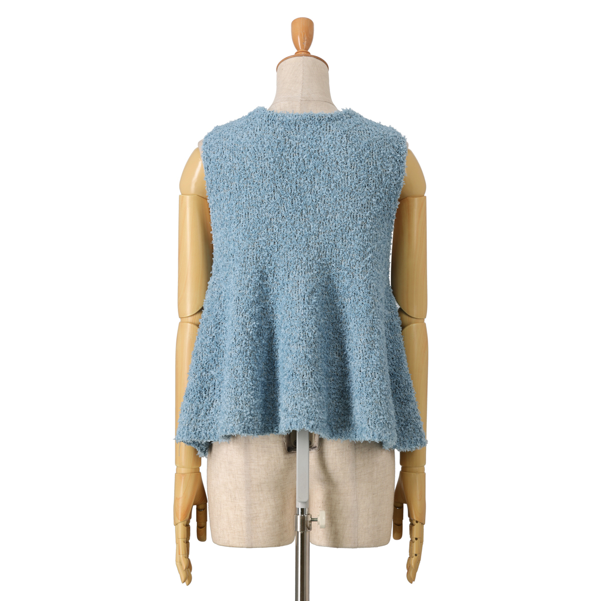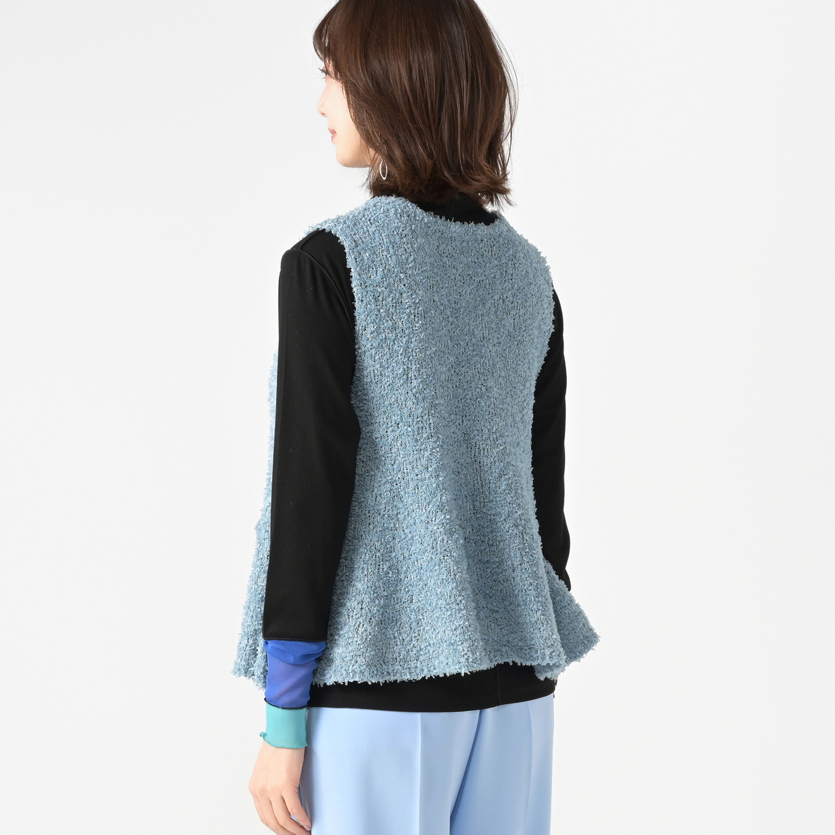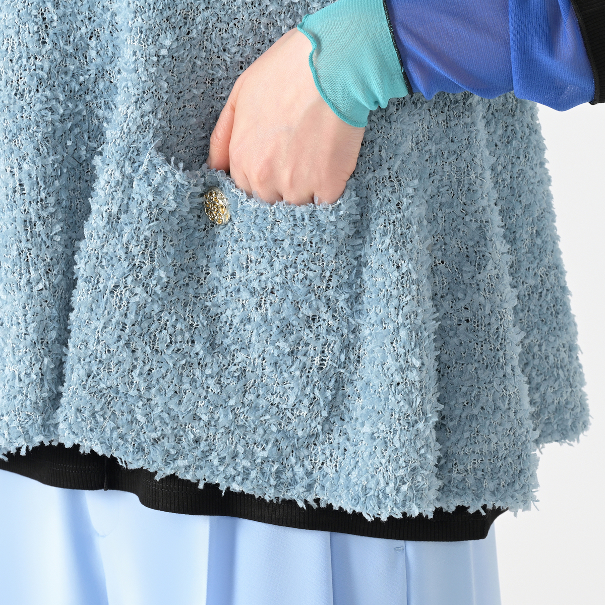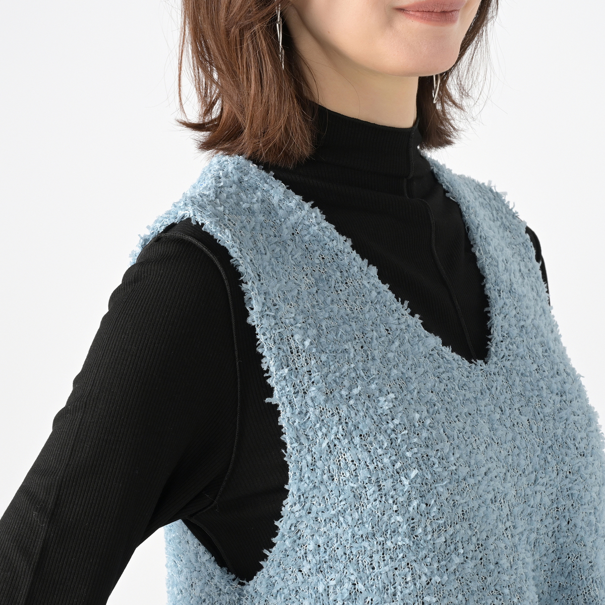 小さなリボンのような表面変化のあるテープヤーンを使ったニットのジレ。5ゲージのリボンヤーンを天竺編みしました。ウエスト付近からフレアーをきれいに出すことで、お腹や腰回りを上手くカバーしてくれます