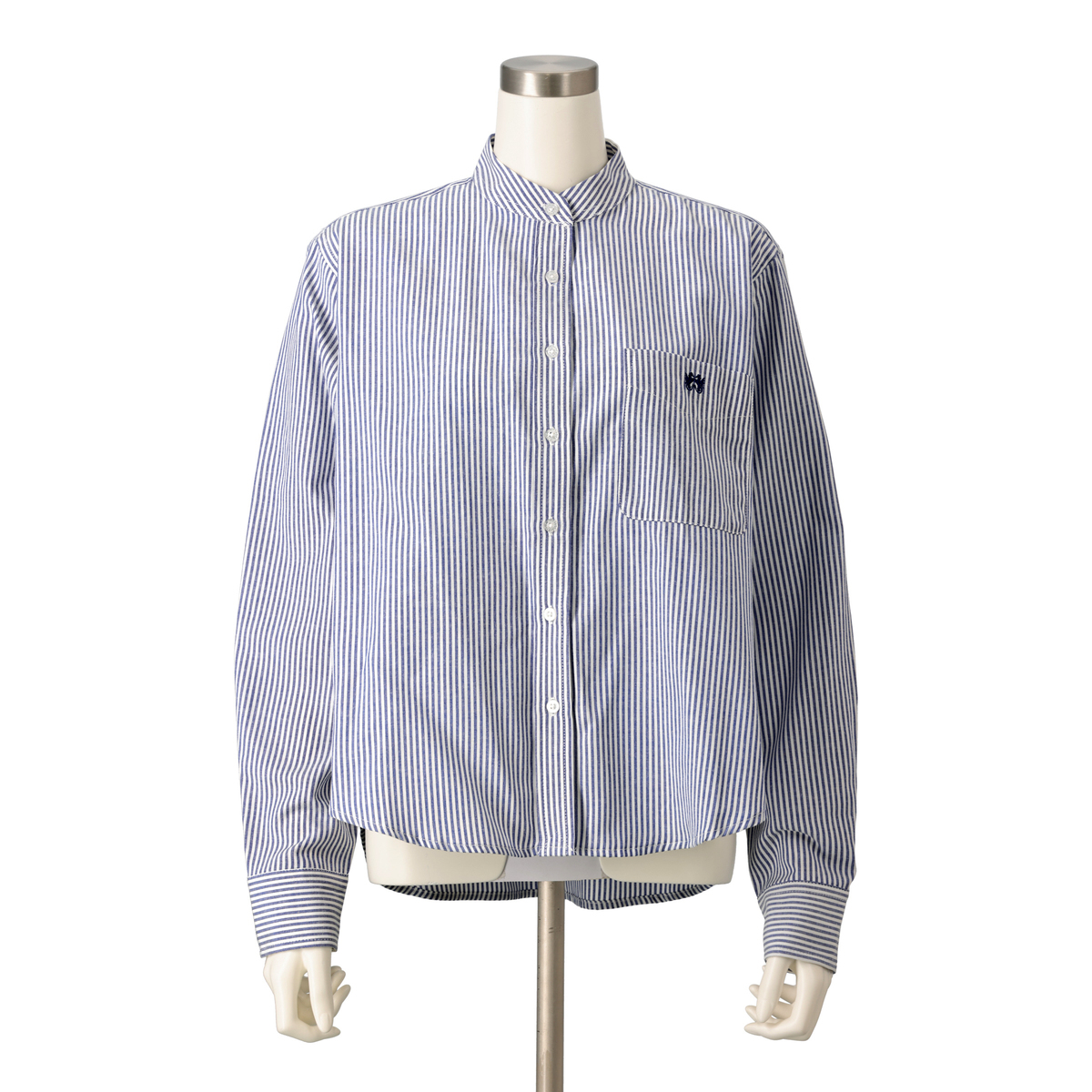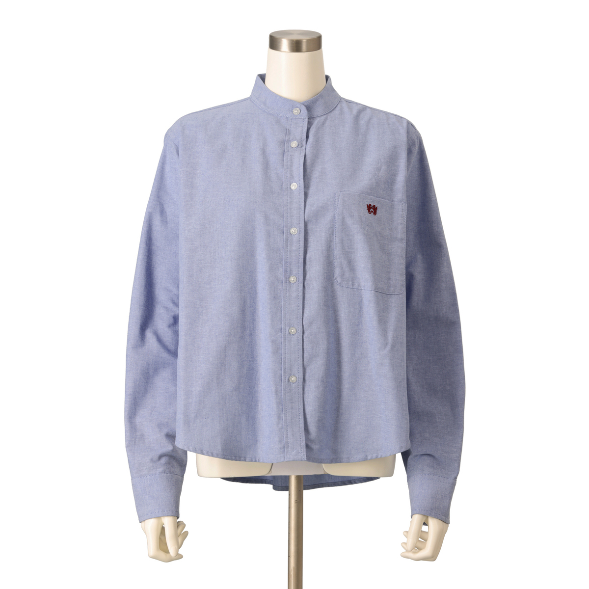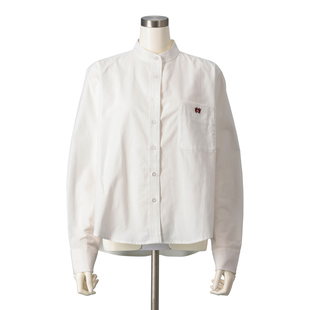 首元をすっきり見せてくれるバンドカラーシャツ。トラッドな印象を残しつつ、軽やかで洗練された雰囲気に仕上げました