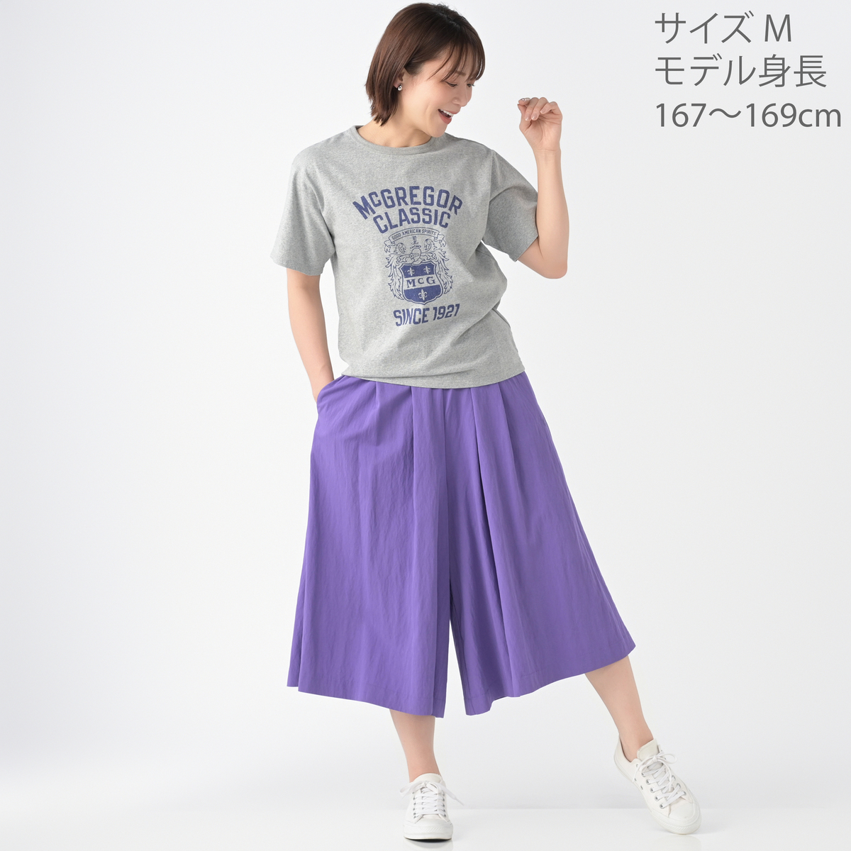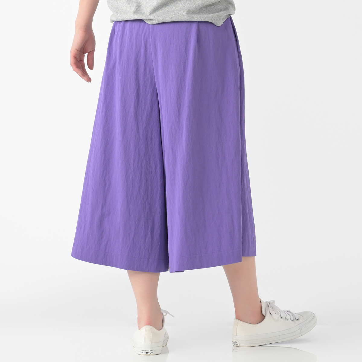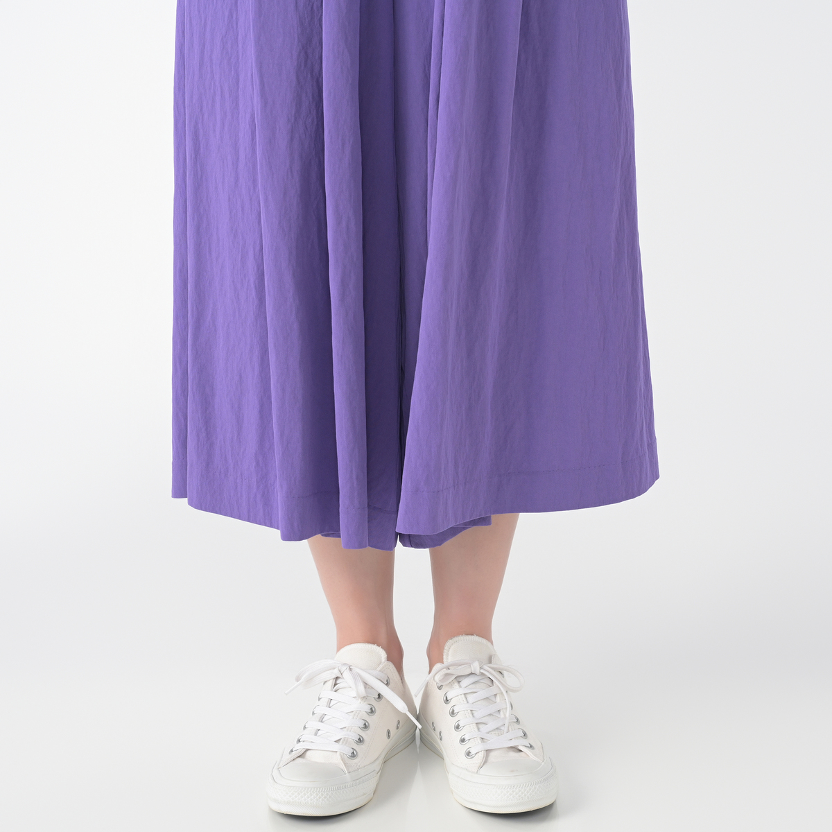 スカートのような優雅さとパンツの動きやすさを両立したスカーチョ。たっぷりとした分量感ながら、裾にかけてすっきりと落ちるフレアシルエットが特徴です