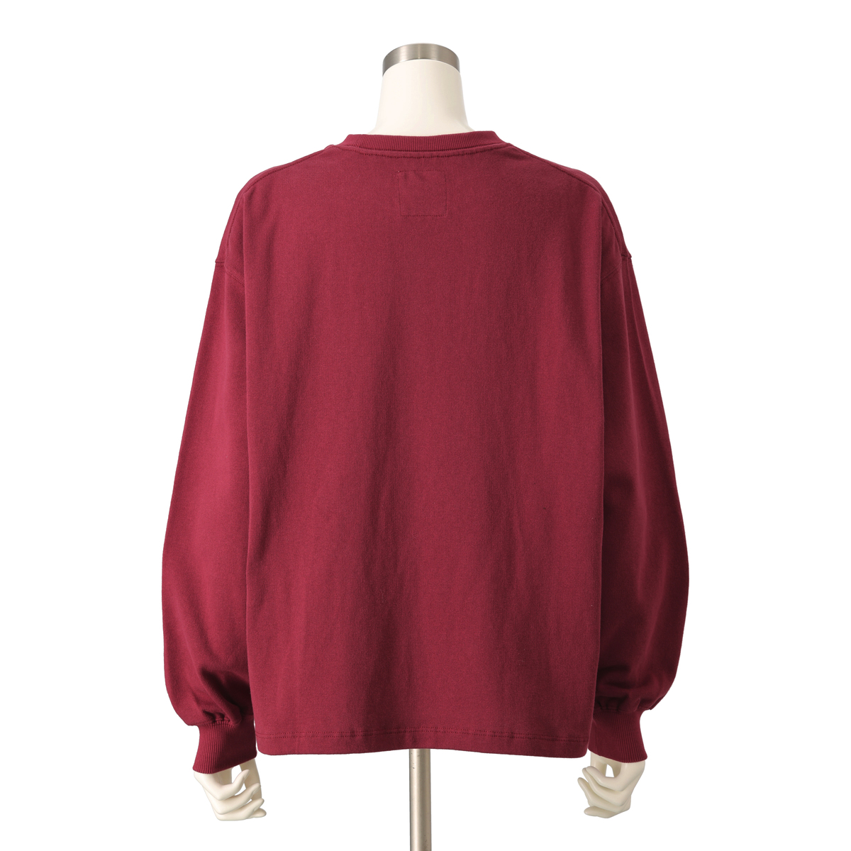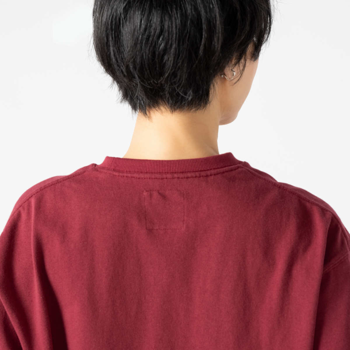 太番手の糸を2本撚り合わせた、コシのあるヘビー天竺素材を使用。程よいハリがあり、身体のラインを拾いにくいデザインです。一枚でサマになる上品な質感で、Tシャツ感覚で着られるのに、どこか洗練された印象を与えます
