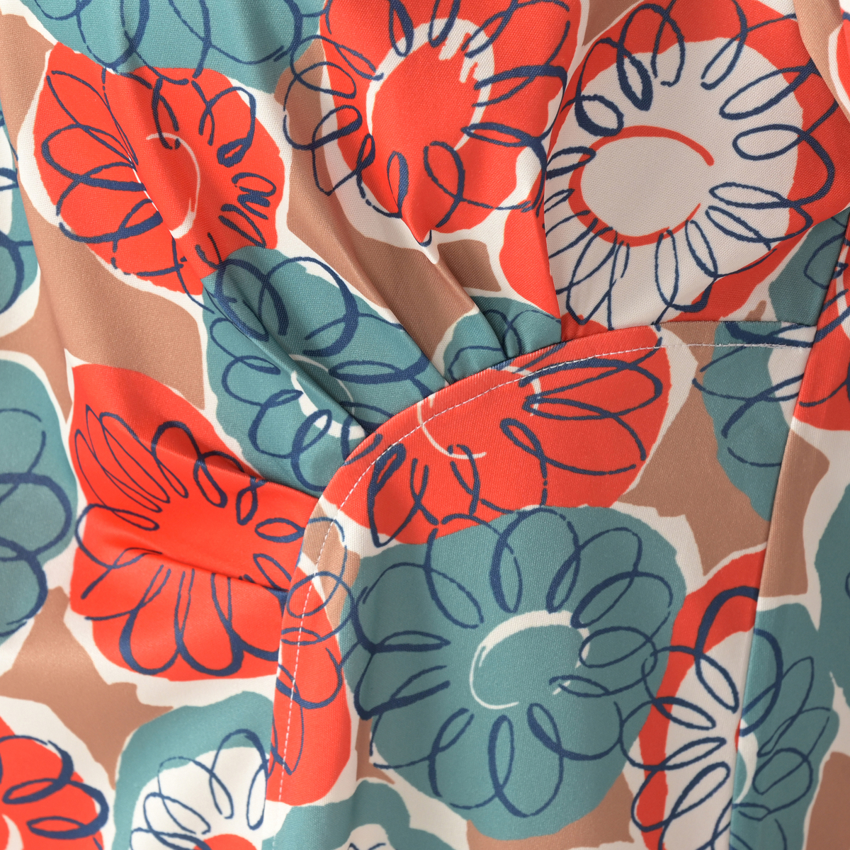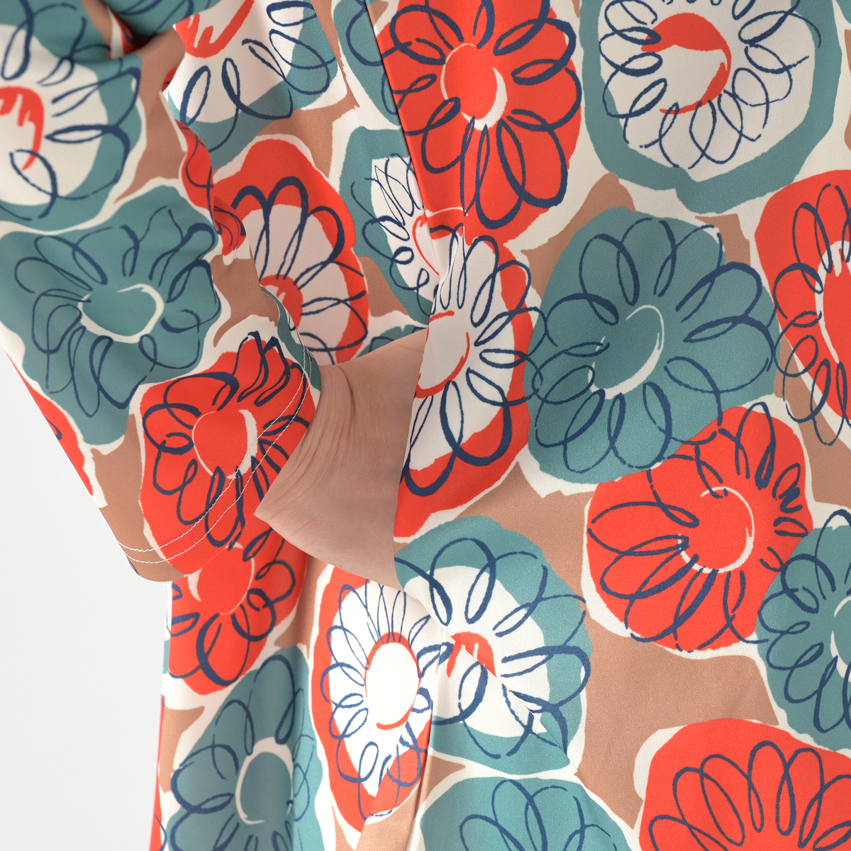モダンアート風に仕上げたオリジナルプリントのトップス。フランスのオールドコレクション本をもとに、春の庭に咲くフレンチマリーゴールドをイメージした図案を、着やすい色合いへ配色で現代的に整えました