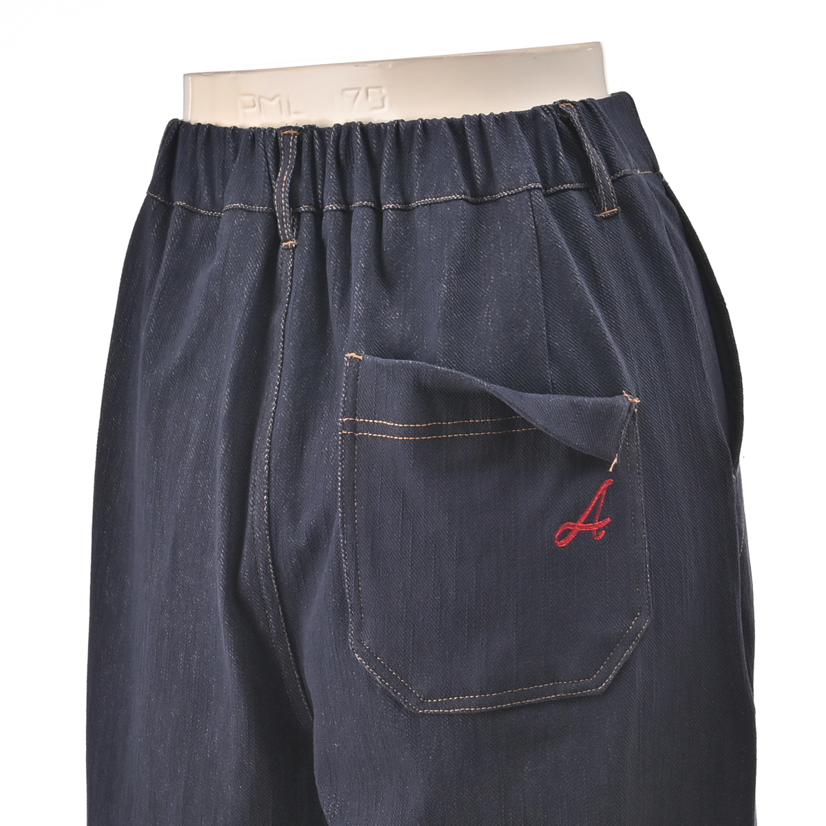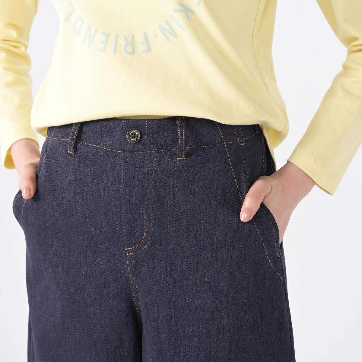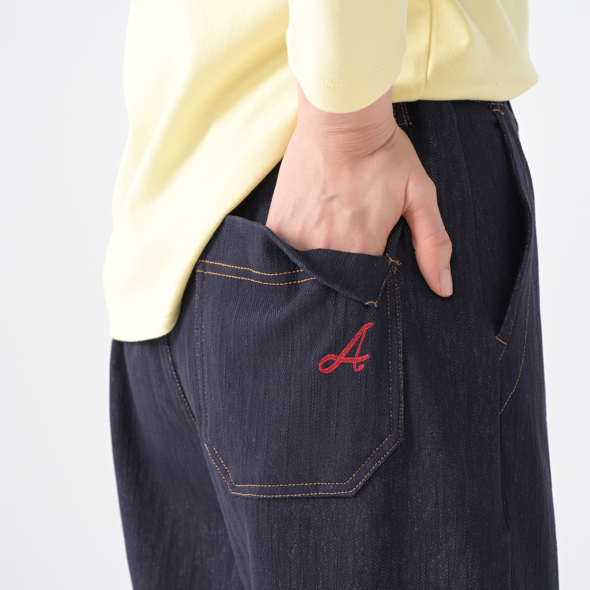 エニワイズ加工を施したニットデニムパンツ。エニワイズ加工は繊維中に油脂分が含まれているので、しっとりなめらかな穿き心地です