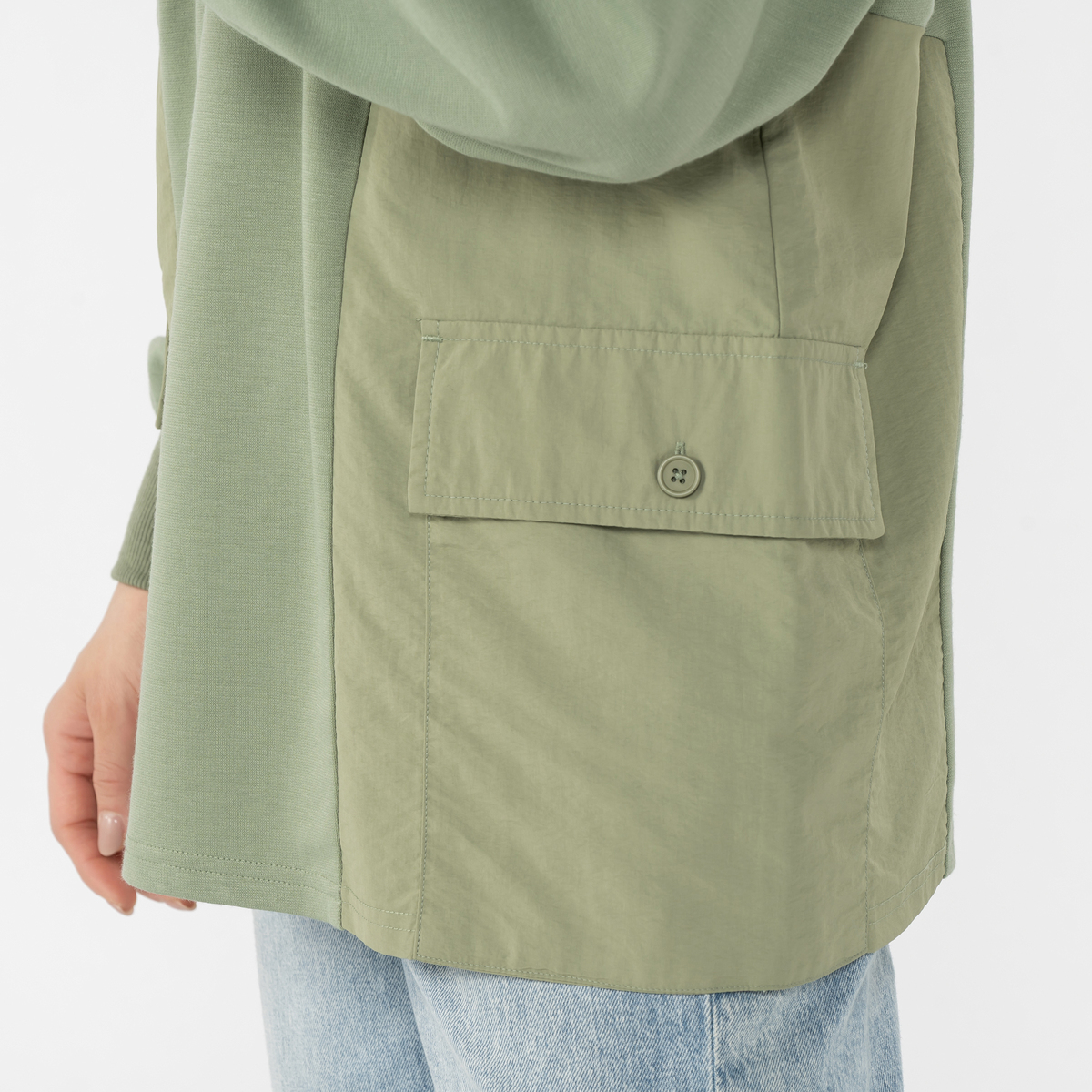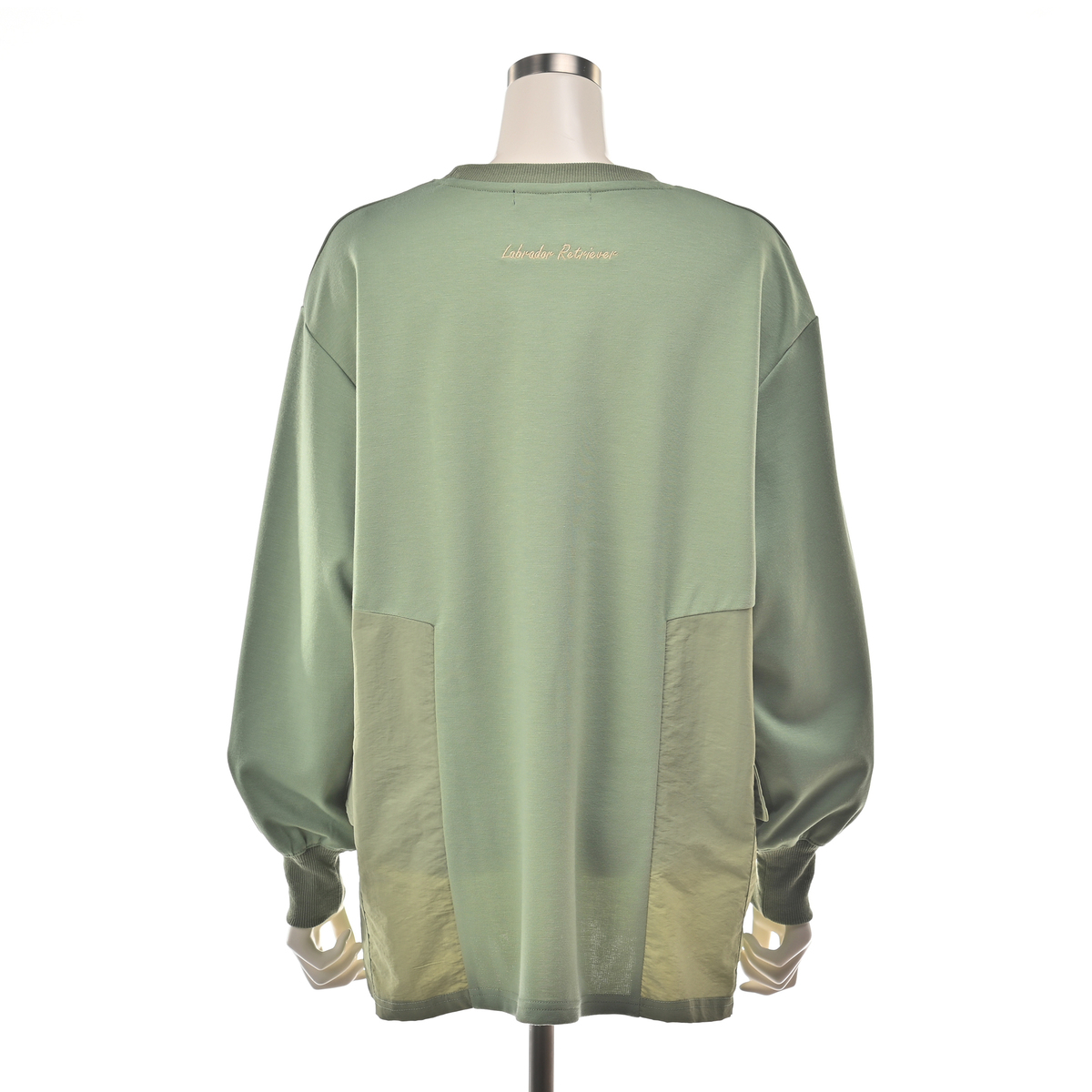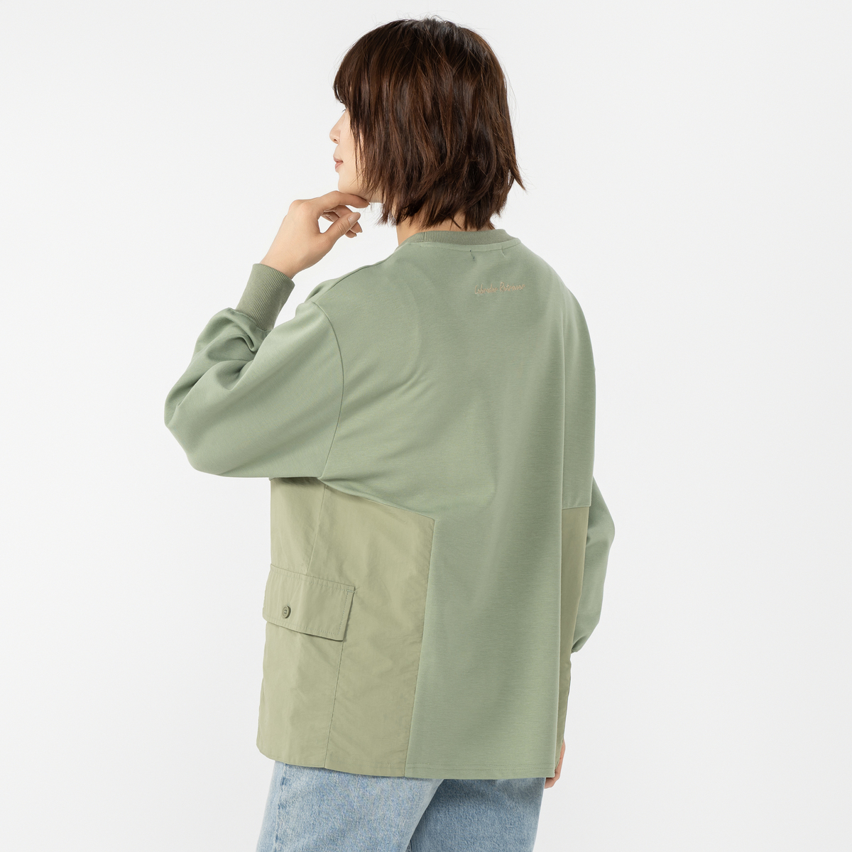 切替えに使用したタフタ生地は軽量なため、チュニック丈特有の重さを軽減。さらにタフタ素材の大きめポケットを両脇にあしらいました。後ろの襟ぐりにはロゴ刺繍を施しています