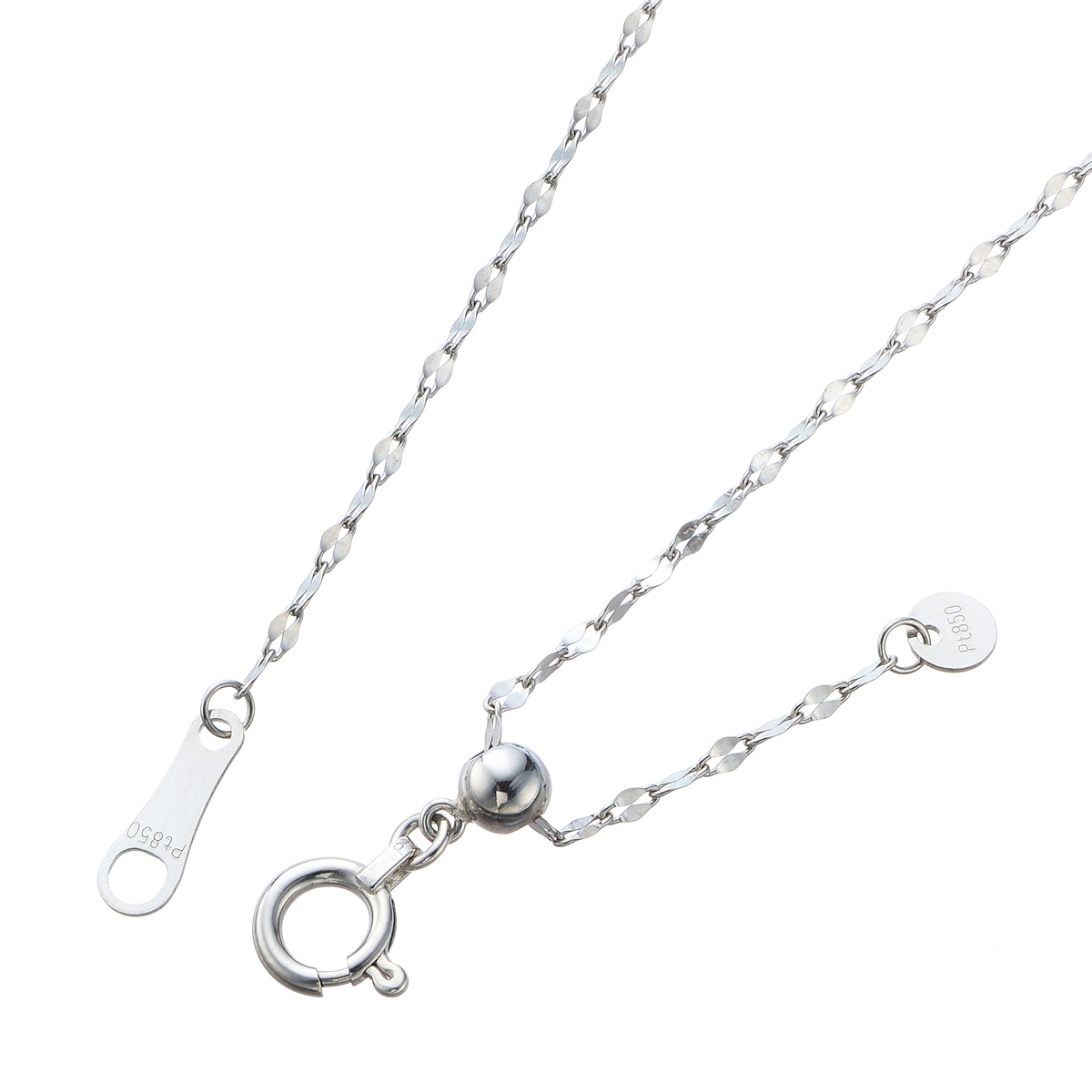 長さ調節が可能なスライド式アジャスター付き。ストーンを留める枠の素材には、プラチナ950を使用。底面の接地面を広くした、安定感のあるつくりです
