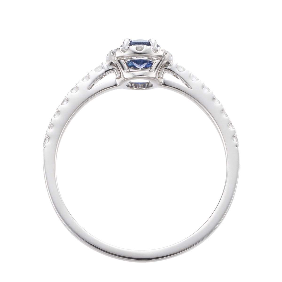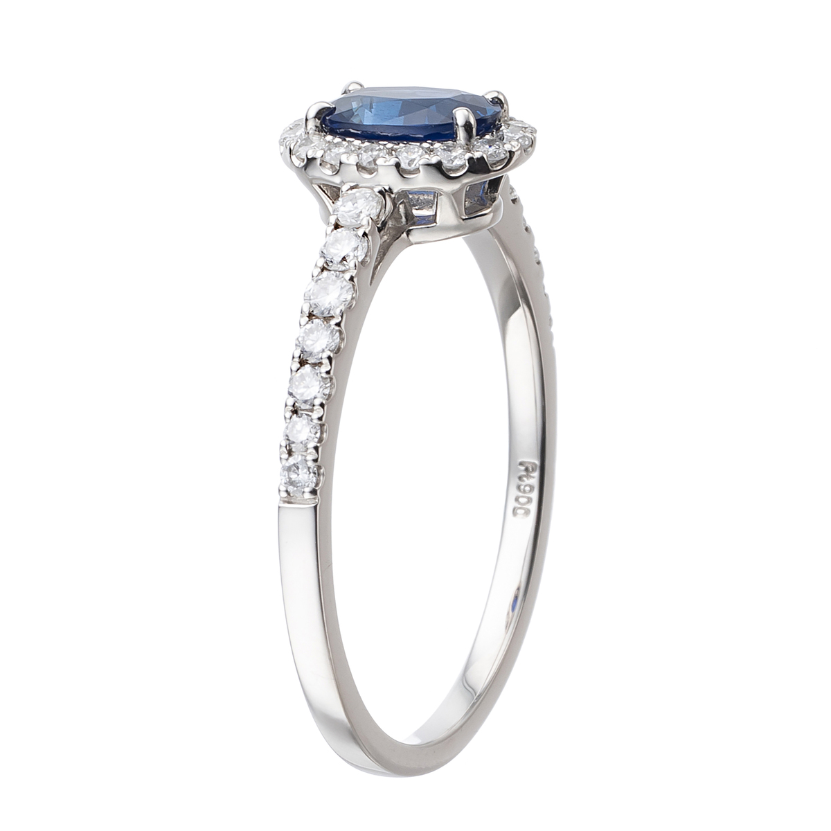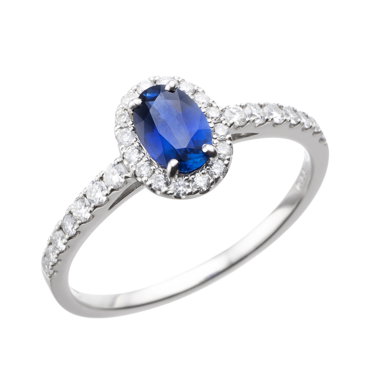 深みのある青が際立つリングです。オーバルシェイプのロイヤルブルーサファイヤを、ダイヤモンドでぐるりと取り巻いた上質なデザイン。アームにもダイヤモンドをあしらい、プラチナの澄んだ輝きが全体をすっきりと引き締めます