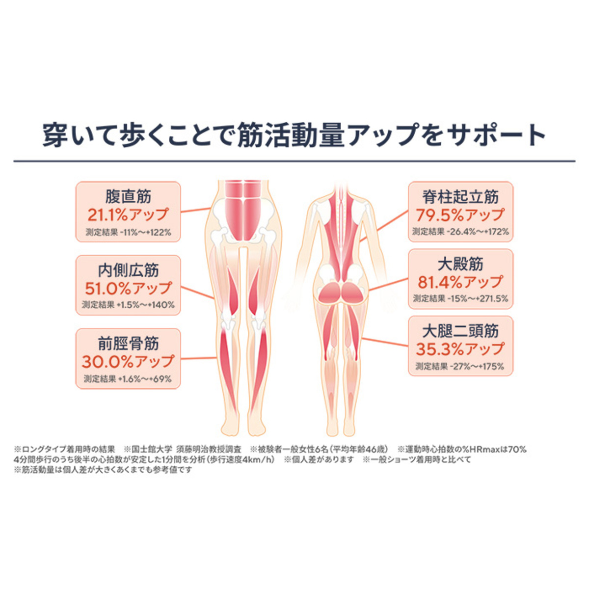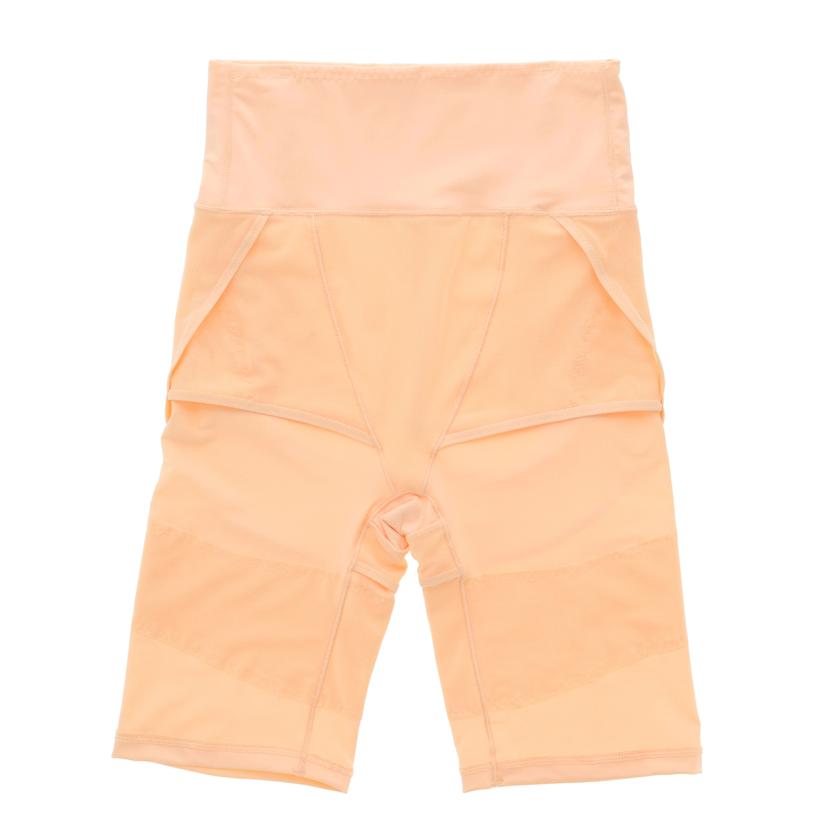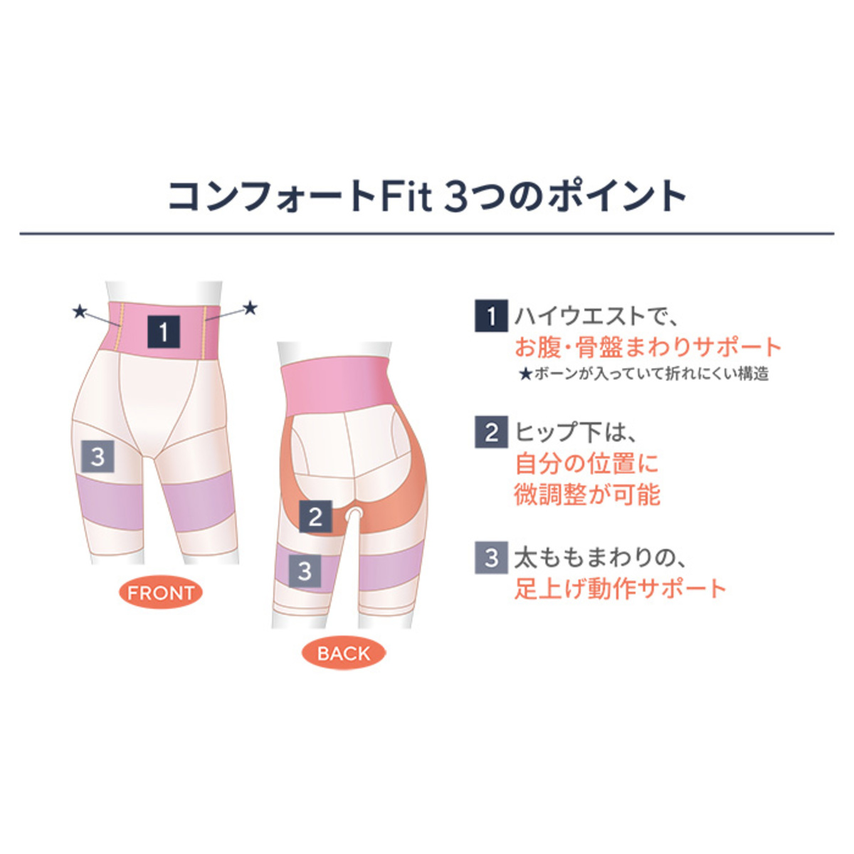 骨盤周り及びヒップ下にパワーネットを配置し、下半身全体の安定性を高めました。また、両太もも前後一周にパワーネットを配置し、足上げ動作をサポート。前ウエストの両サイドにボーンを内蔵し着用時の折れ込みを防止。ヒップパネルの立体フリー構造で、着用位置の微調整が可能になりフィット感がアップします