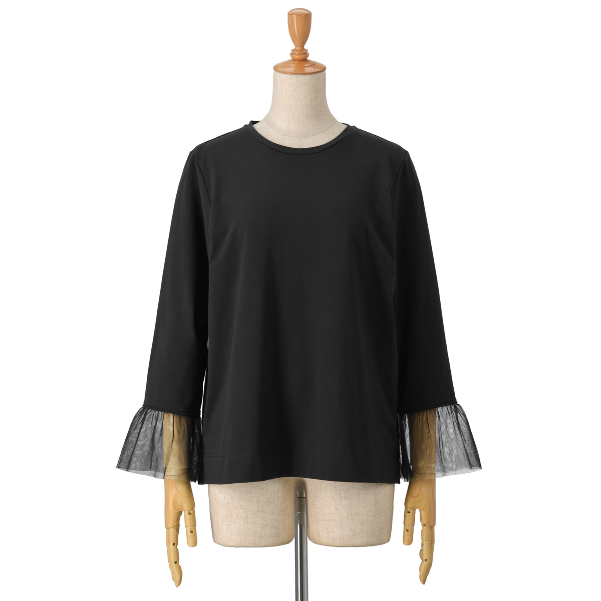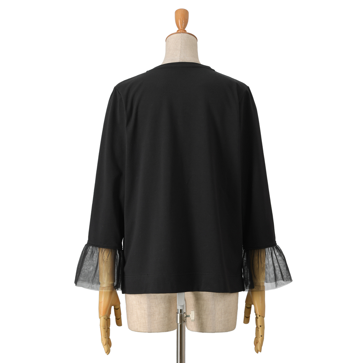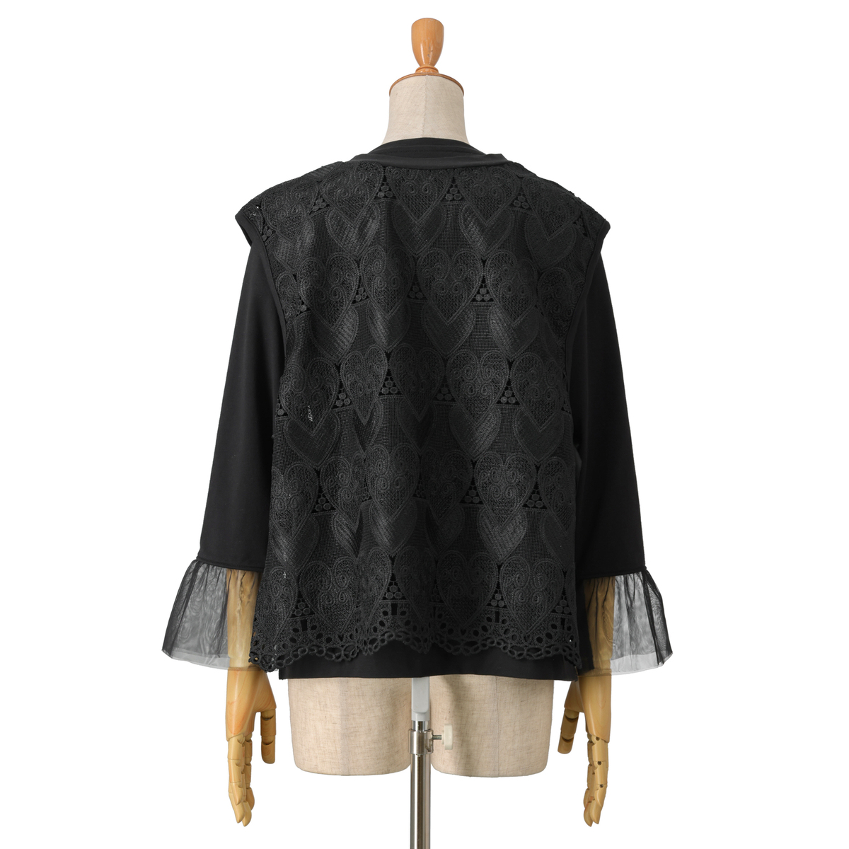 レースのスカラップは裾の山を丁寧に合わせ、着用したときのラインがまっすぐ見える設計に。チュール袖はギャザーの立体感で、手首がすっと細く上品に見えるように計算されたシルエットになっています