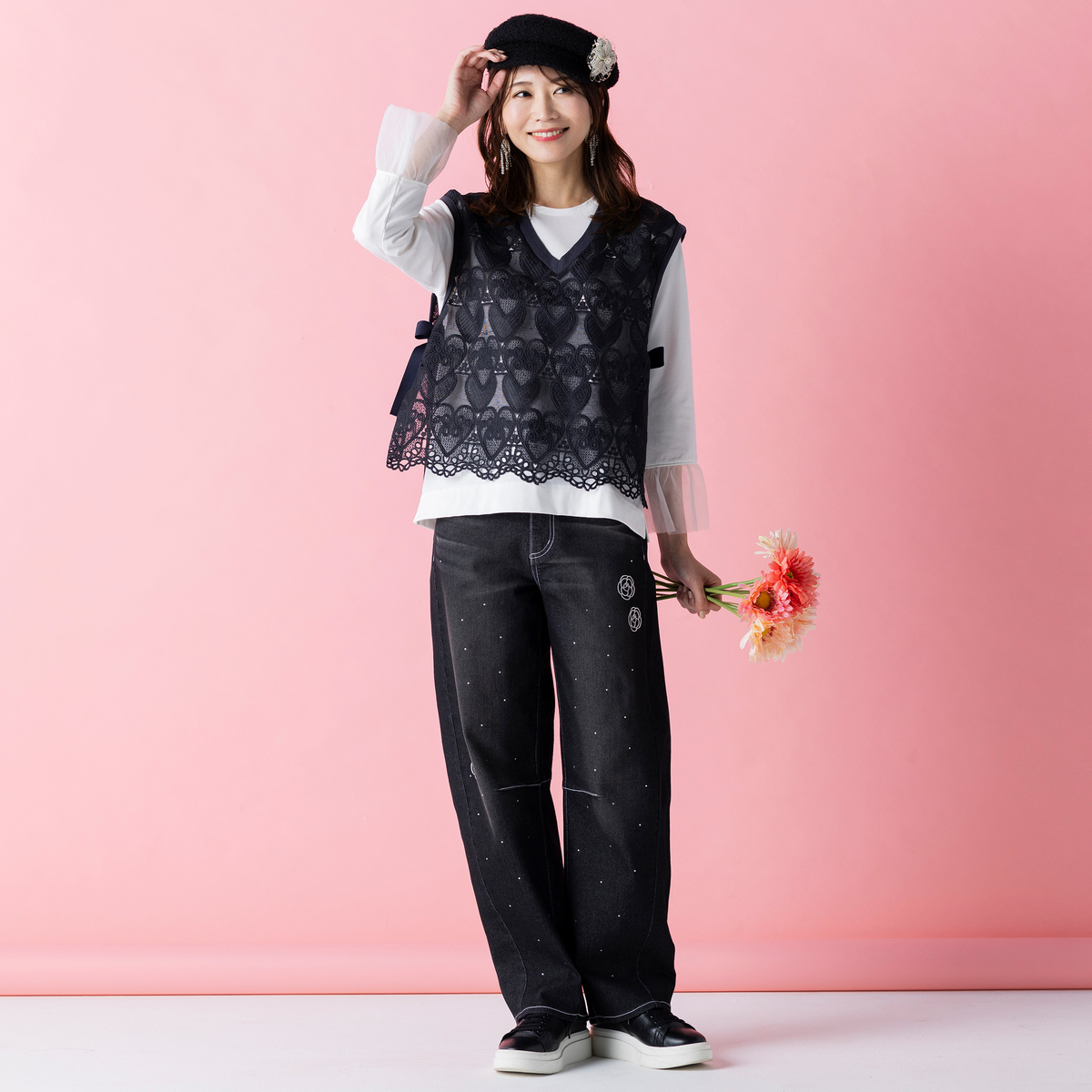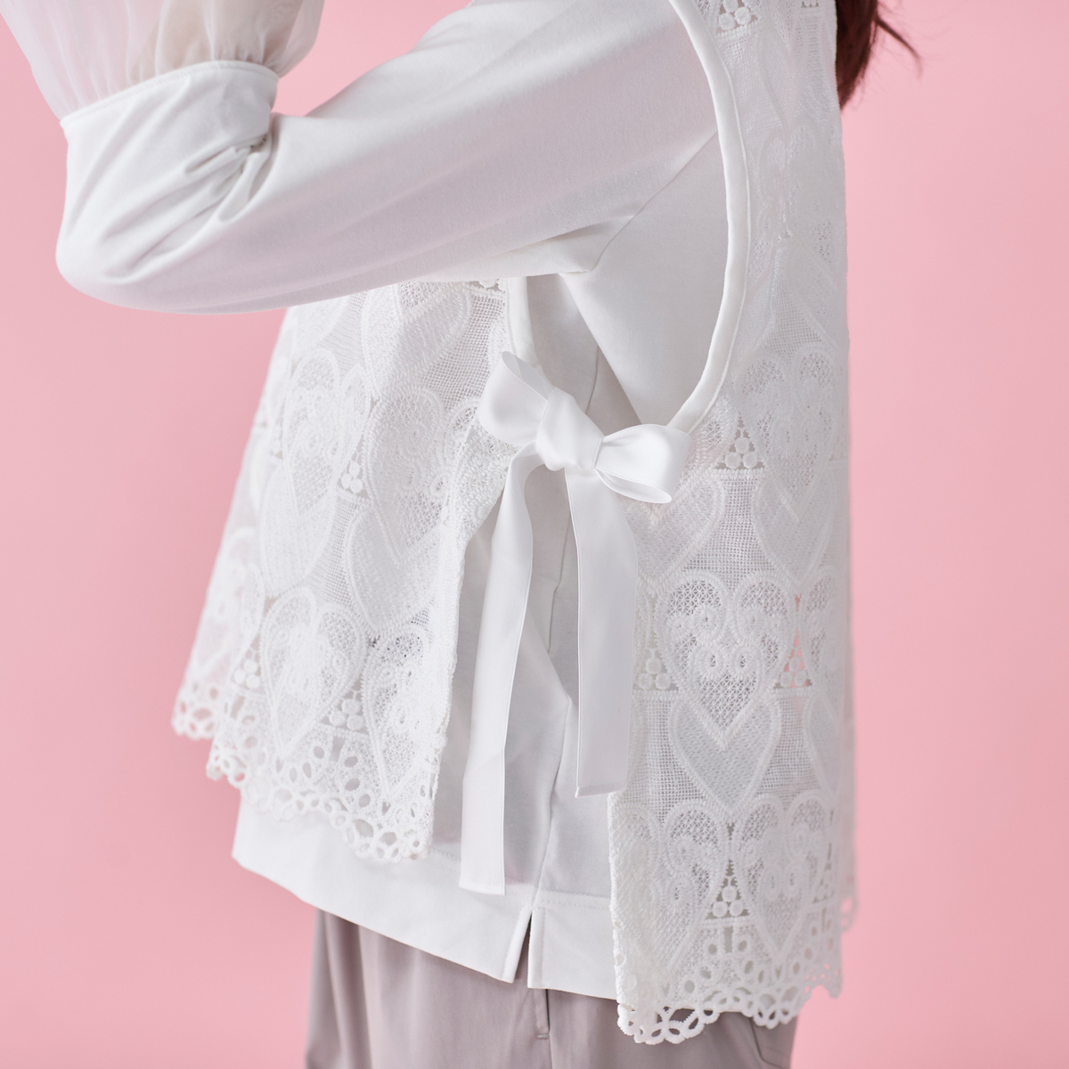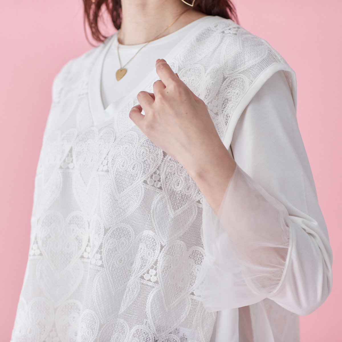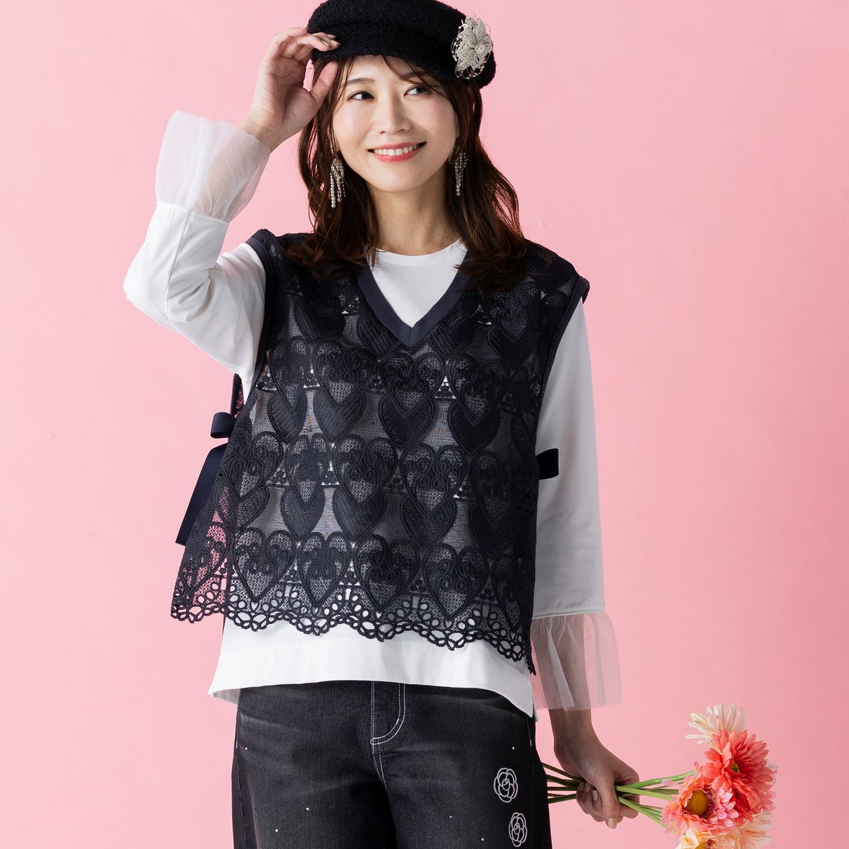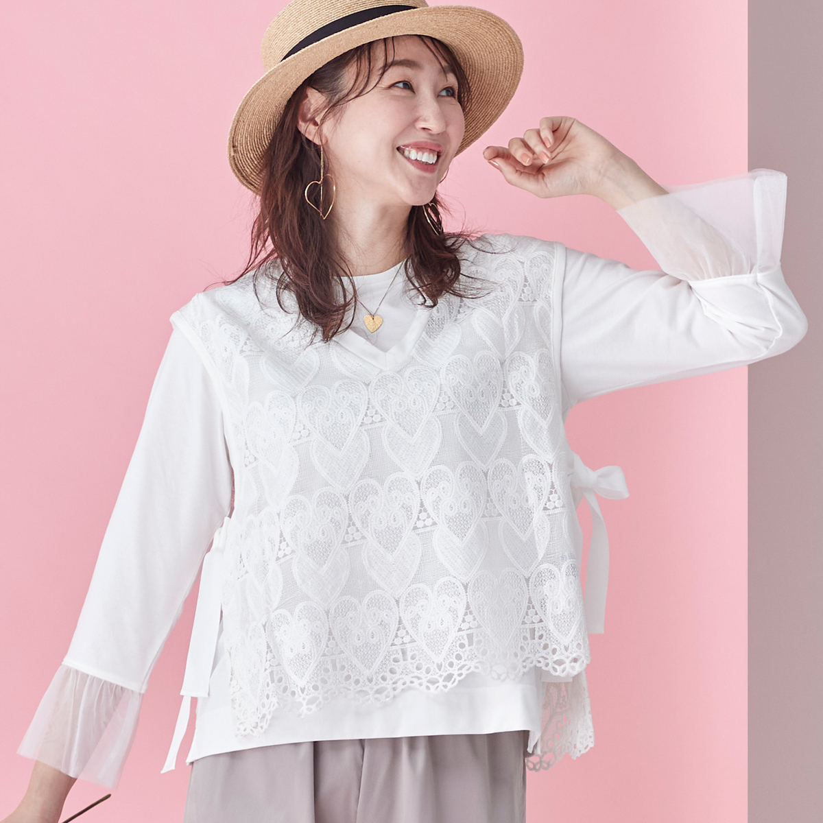 ハートレースが目を惹くベストと、袖フリルプルオーバーのセット。ベストは透けすぎない上品なレース*で、トップスに重ねるだけでコーデに立体感が生まれ、大人可愛いコーデが完成します