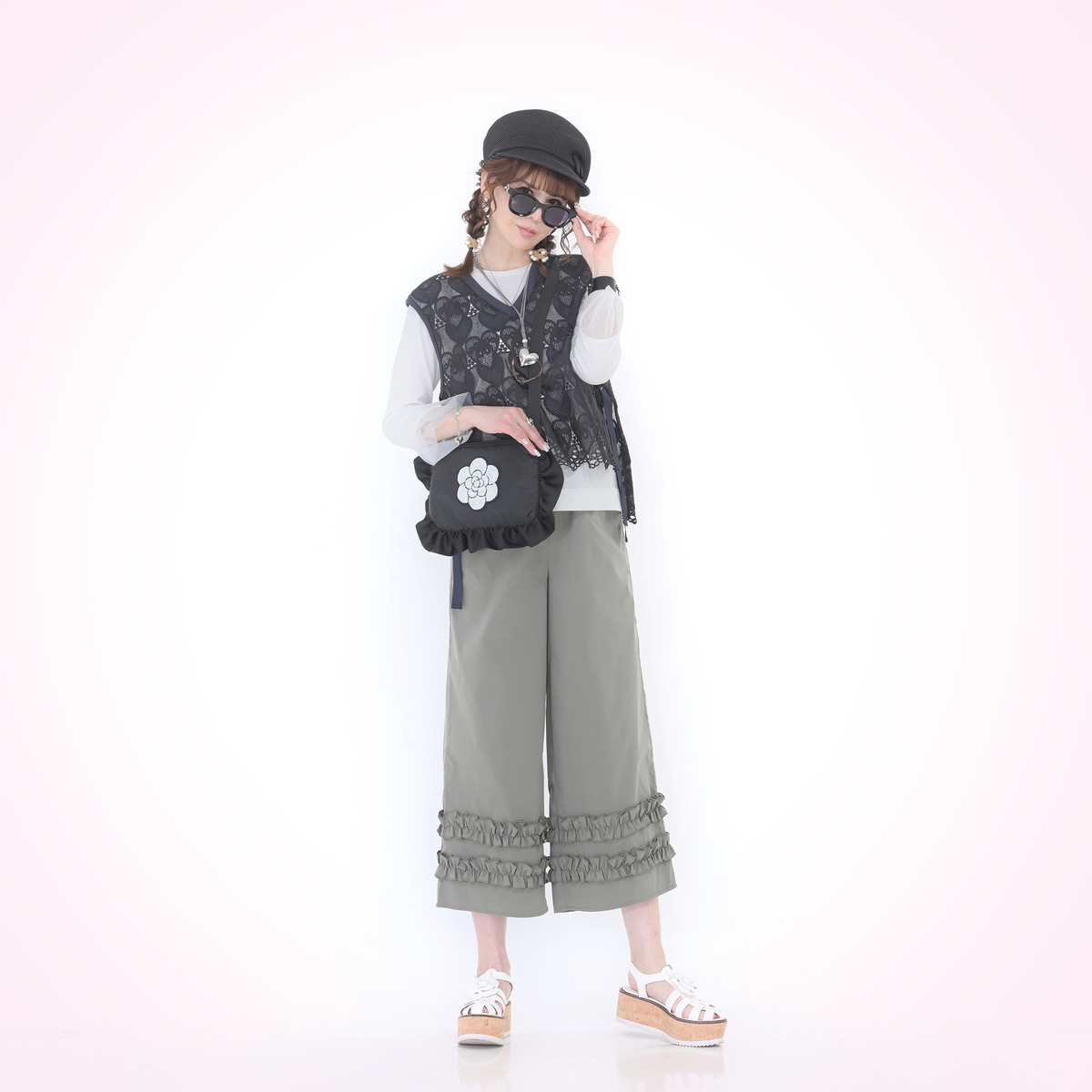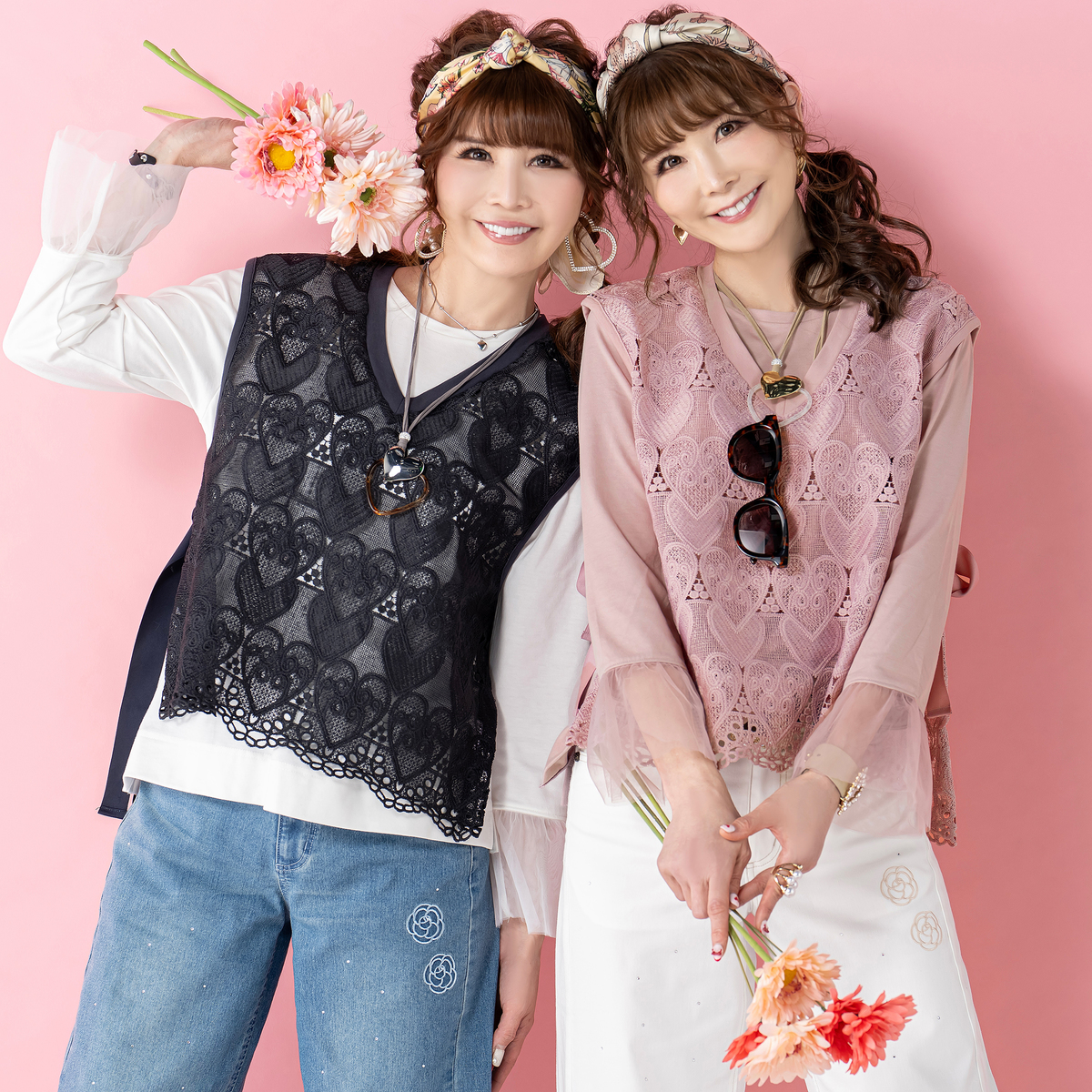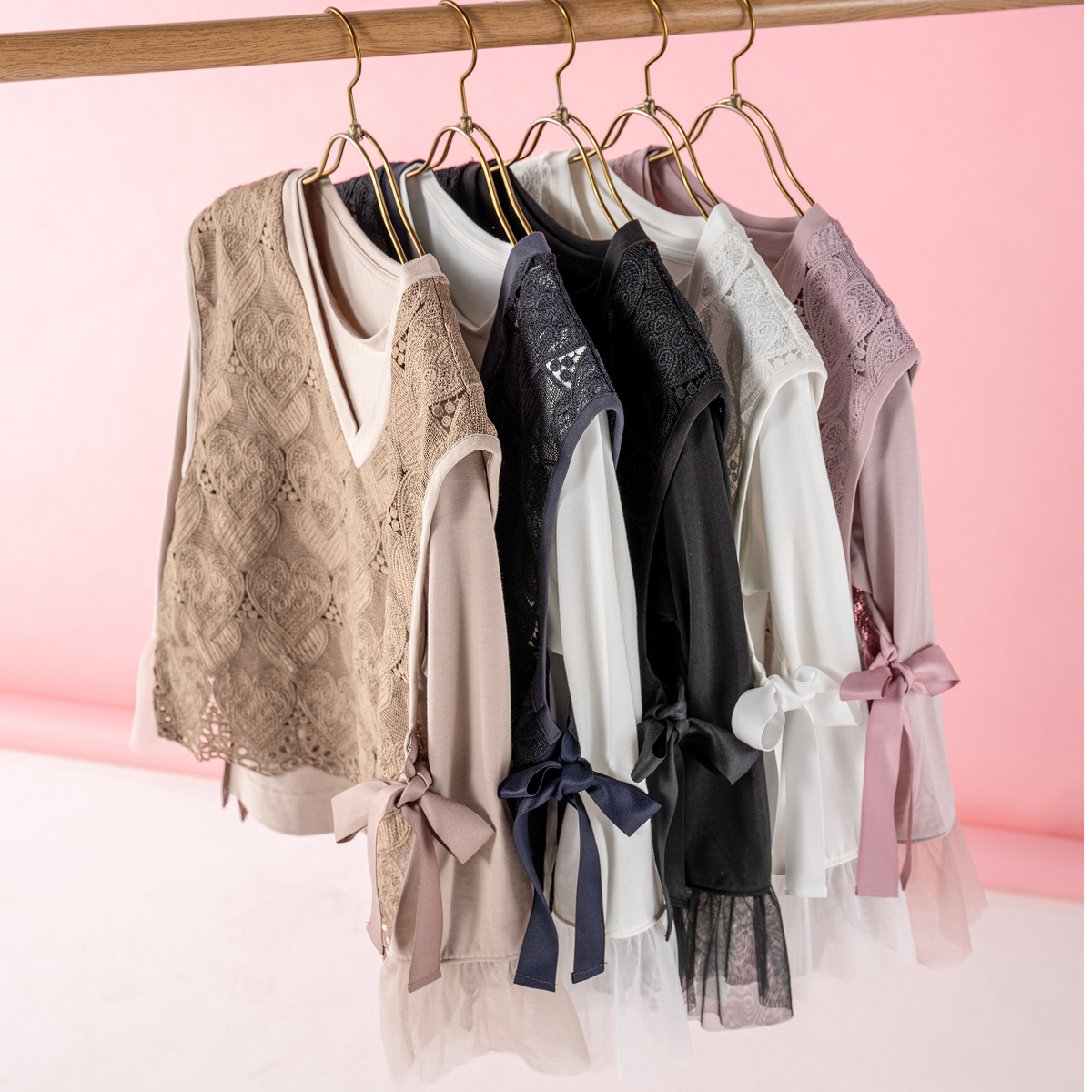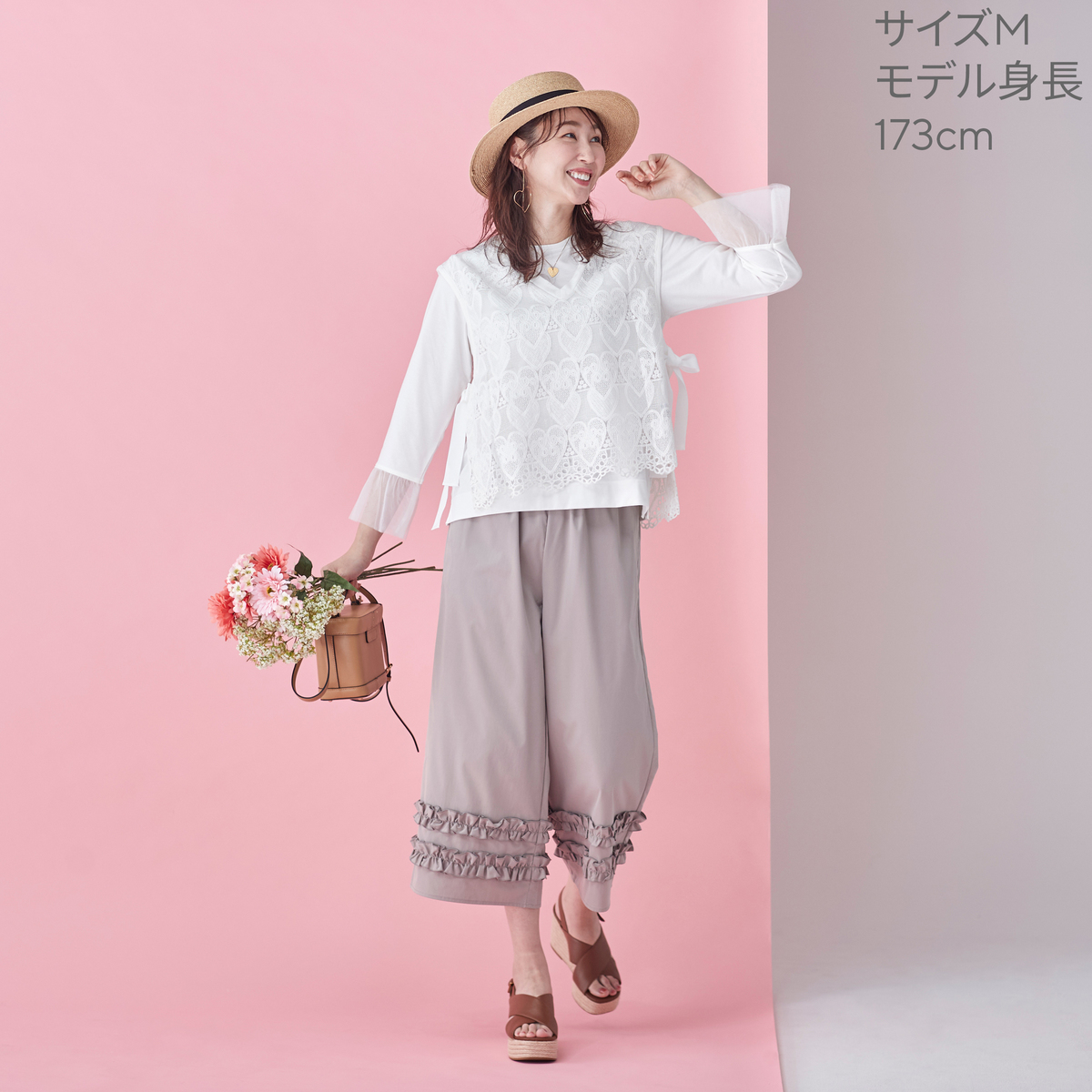 ハートレースが目を惹くベストと、袖フリルプルオーバーのセット。ベストは透けすぎない上品なレース*で、トップスに重ねるだけでコーデに立体感が生まれ、大人可愛いコーデが完成します
