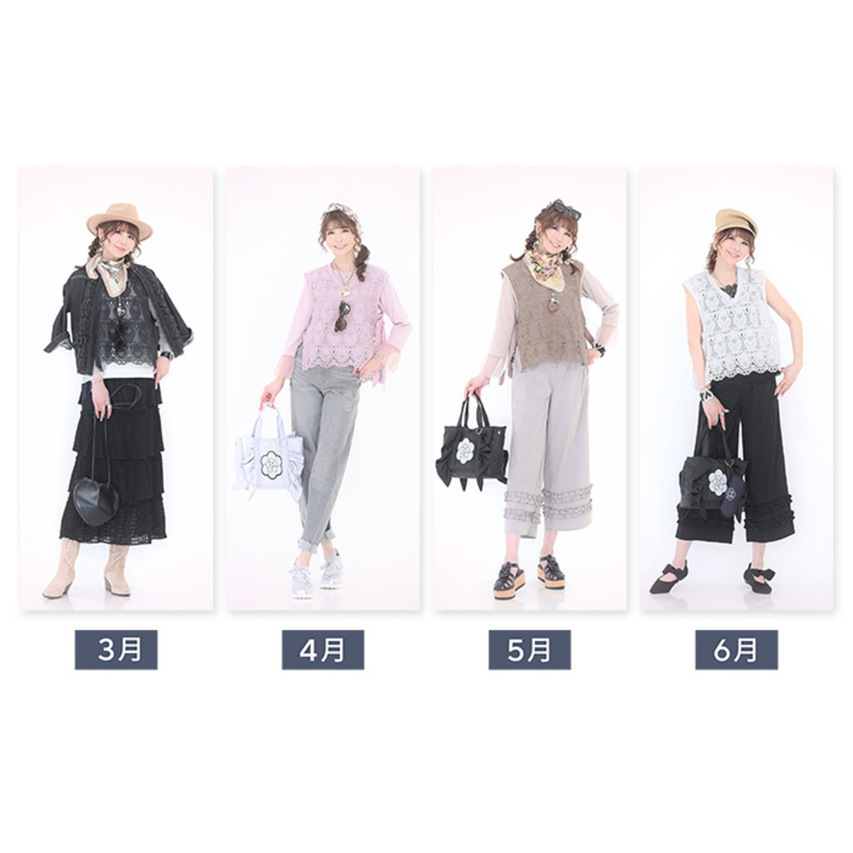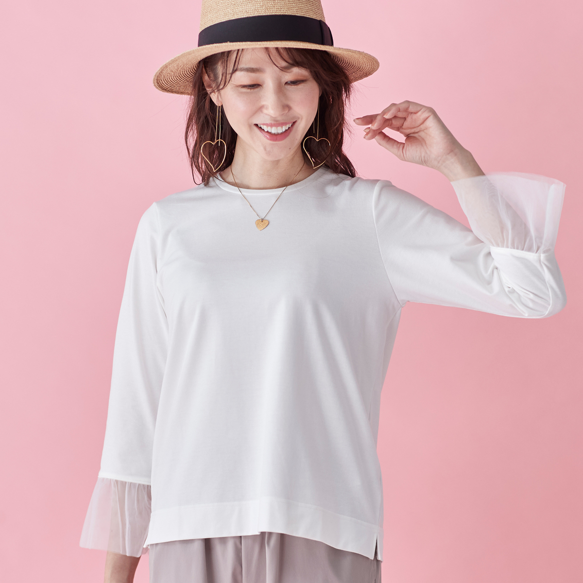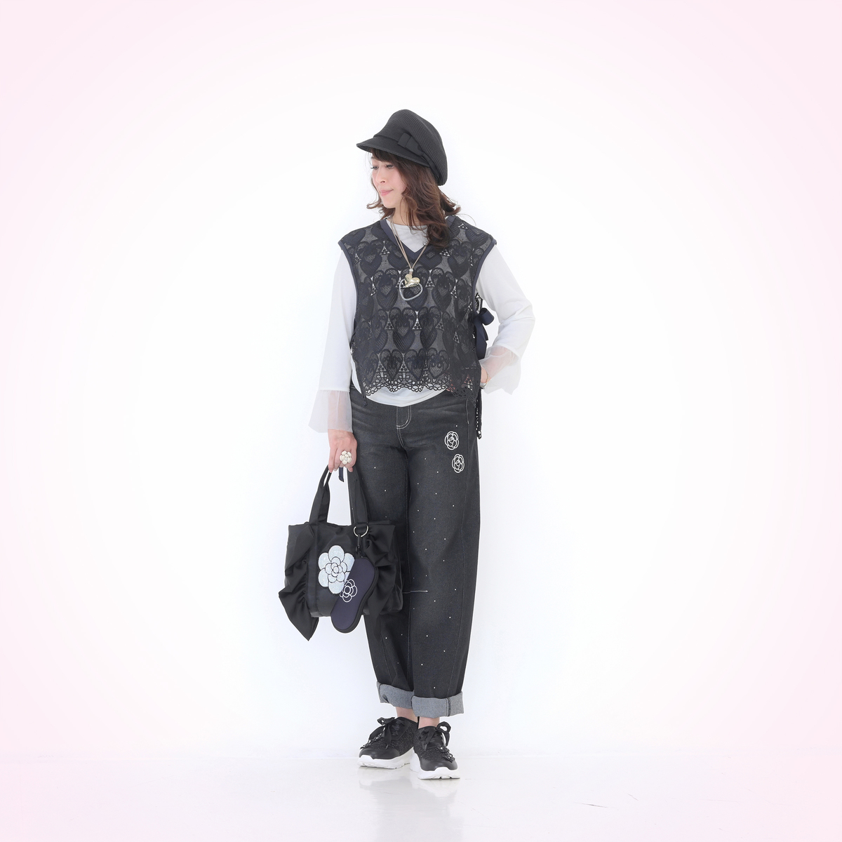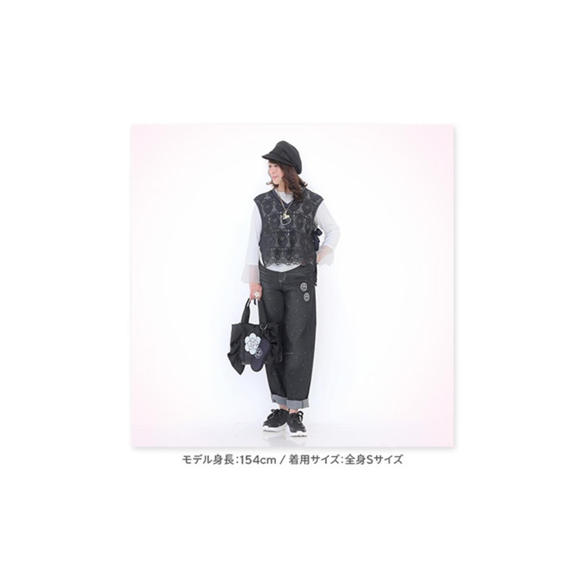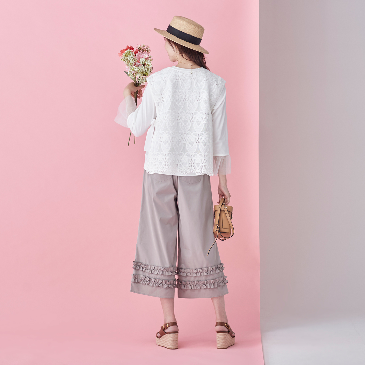 ハートレースが目を惹くベストと、袖フリルプルオーバーのセット。ベストは透けすぎない上品なレース*で、トップスに重ねるだけでコーデに立体感が生まれ、大人可愛いコーデが完成します