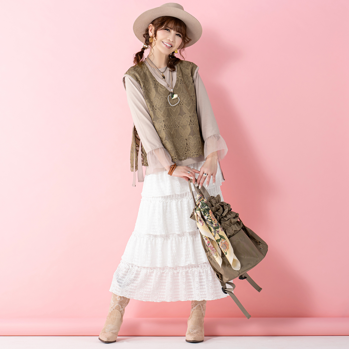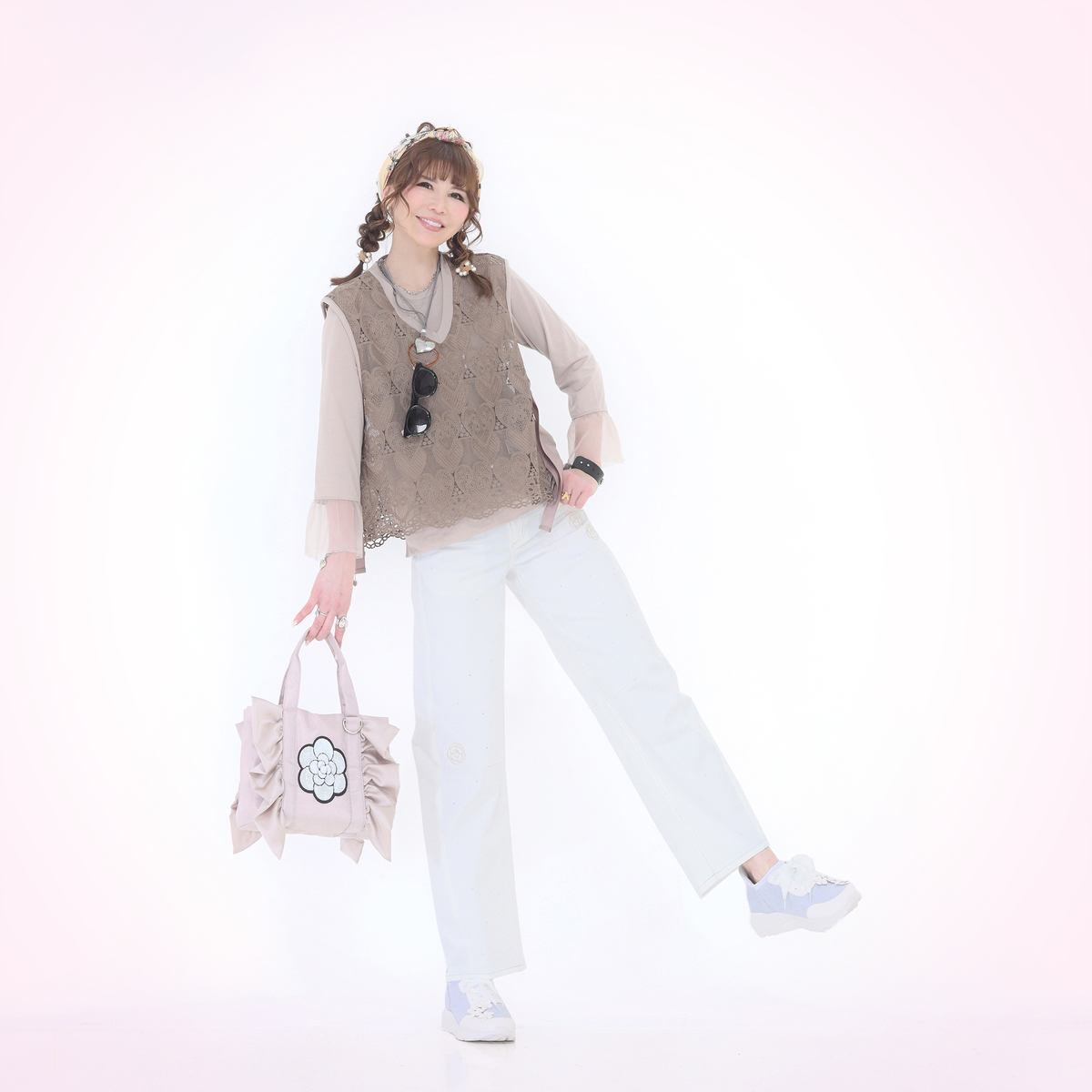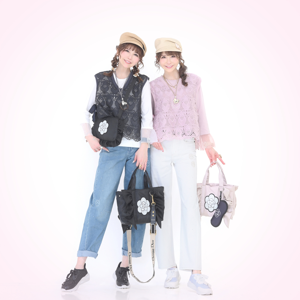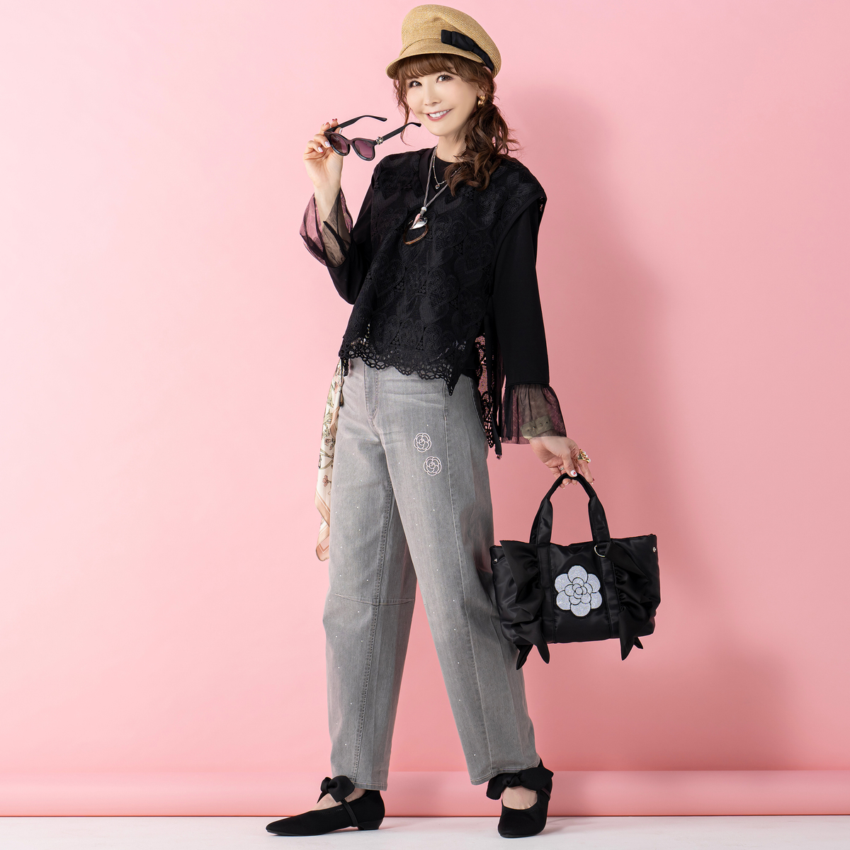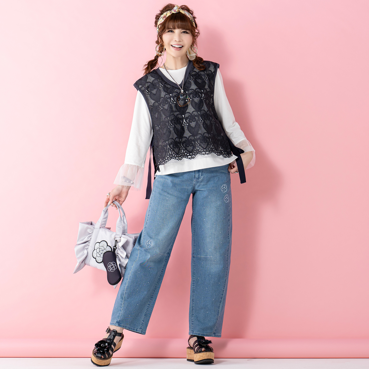 ハートレースが目を惹くベストと、袖フリルプルオーバーのセット。ベストは透けすぎない上品なレース*で、トップスに重ねるだけでコーデに立体感が生まれ、大人可愛いコーデが完成します