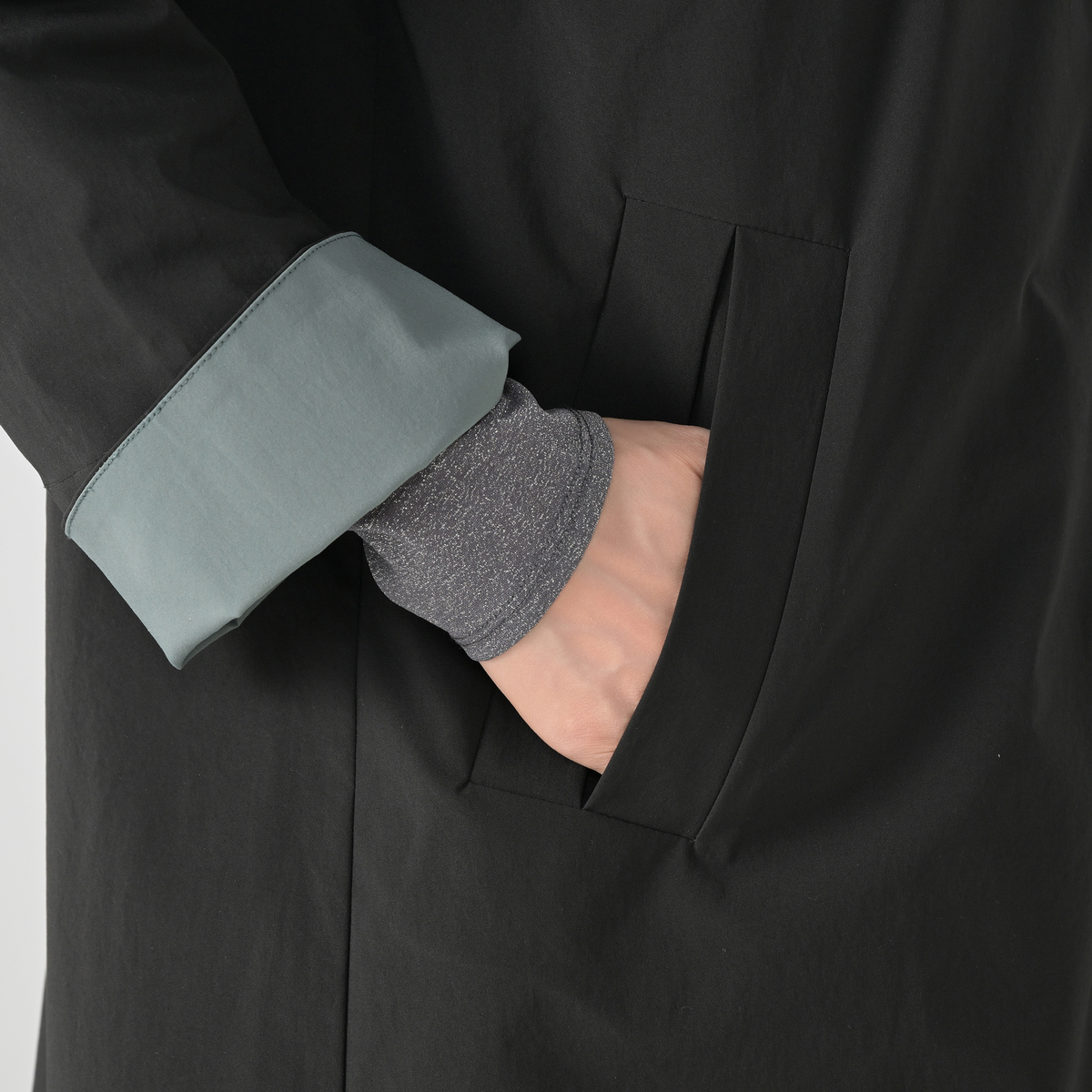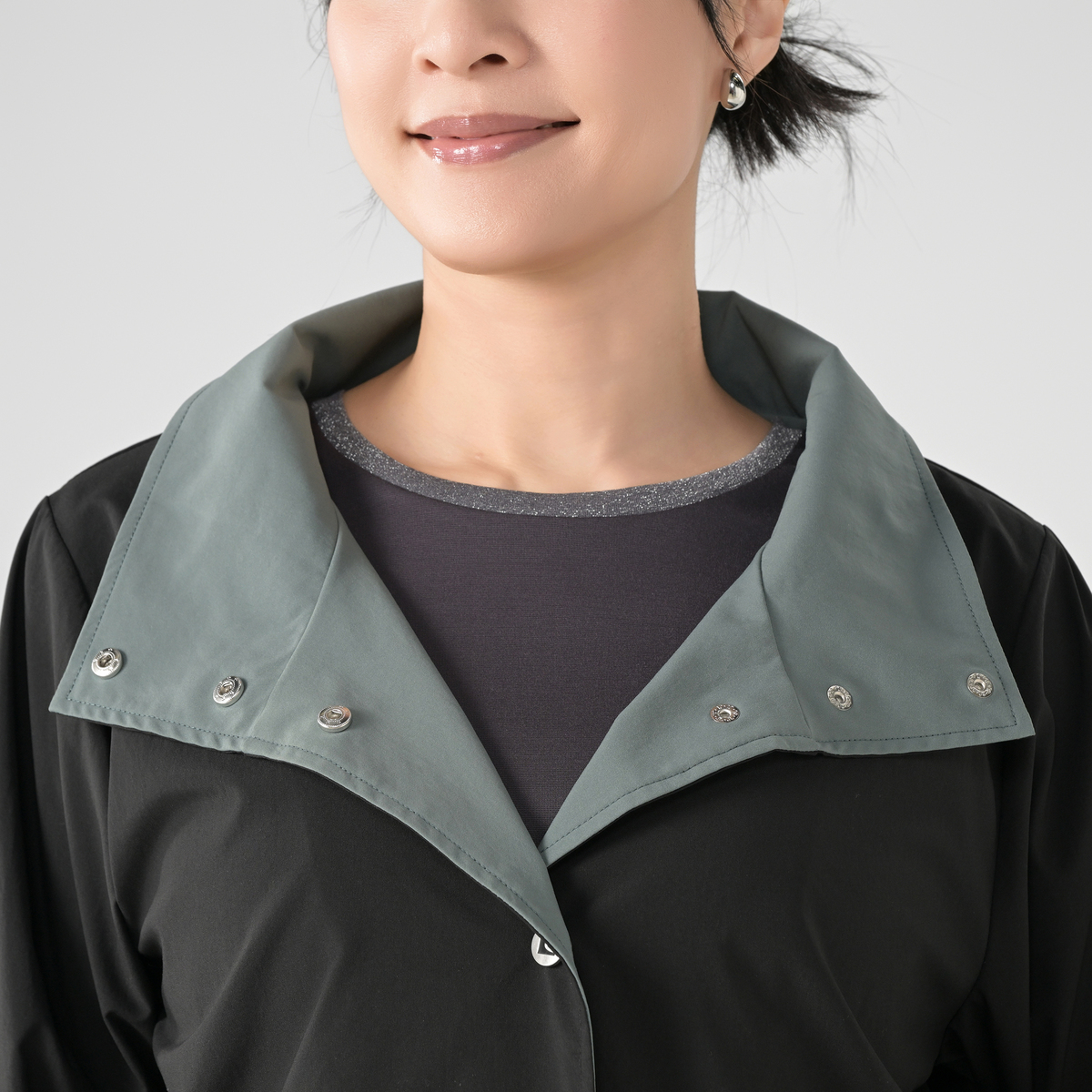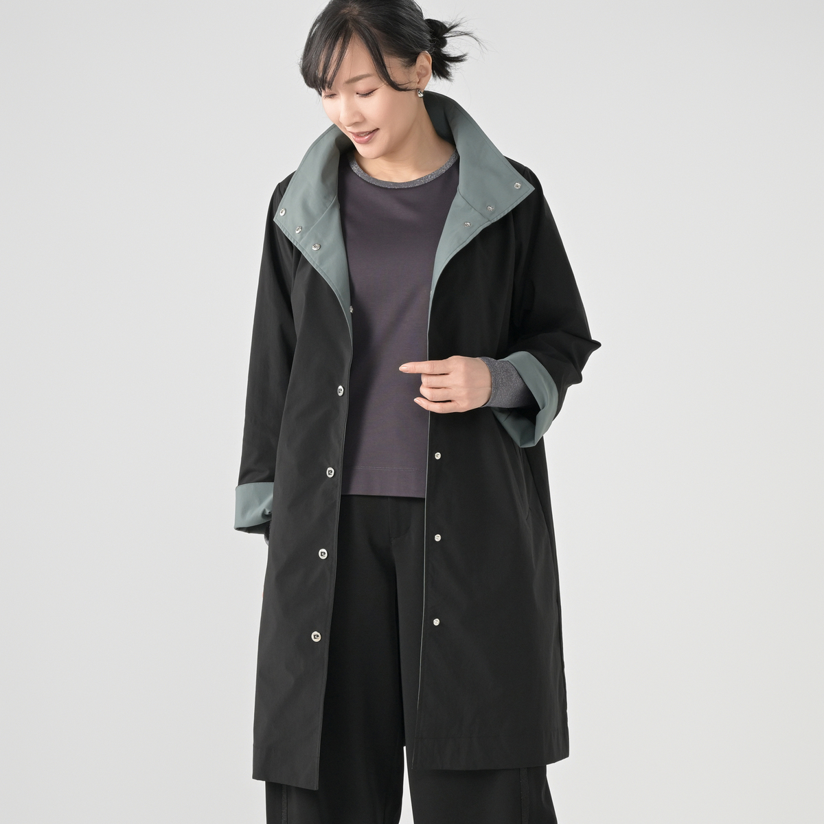 配色ディテールが印象的なスタンドデザイン。衿裏や袖口裏、前端の見返しなど内側にバイカラーを効かせ、表からは無地見えですっきりとした佇まいに。衿を開いたり袖口を折り返すことで印象が変わり、上品で洗練された印象でお召しいただけます