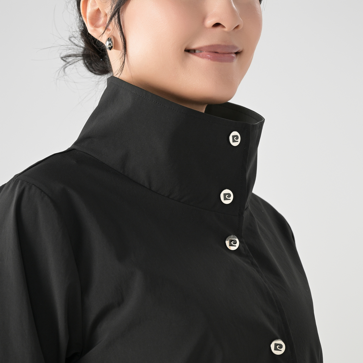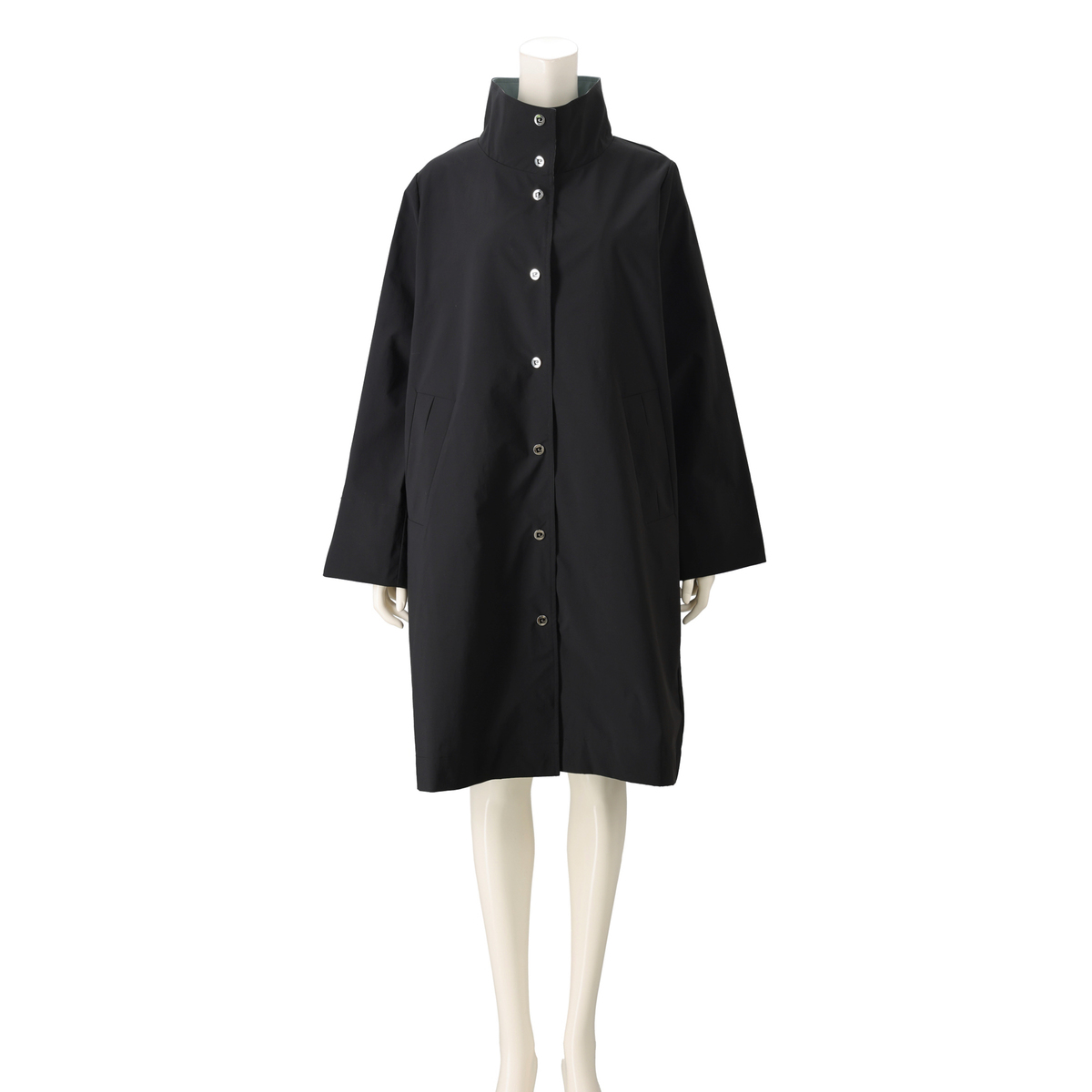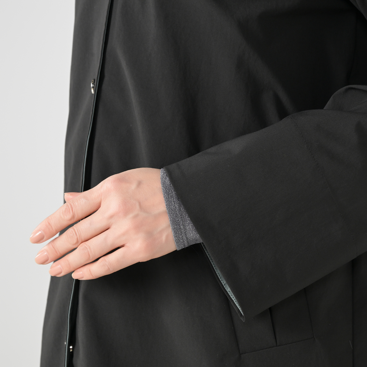 配色ディテールが印象的なスタンドデザイン。衿裏や袖口裏、前端の見返しなど内側にバイカラーを効かせ、表からは無地見えですっきりとした佇まいに。衿を開いたり袖口を折り返すことで印象が変わり、上品で洗練された印象でお召しいただけます