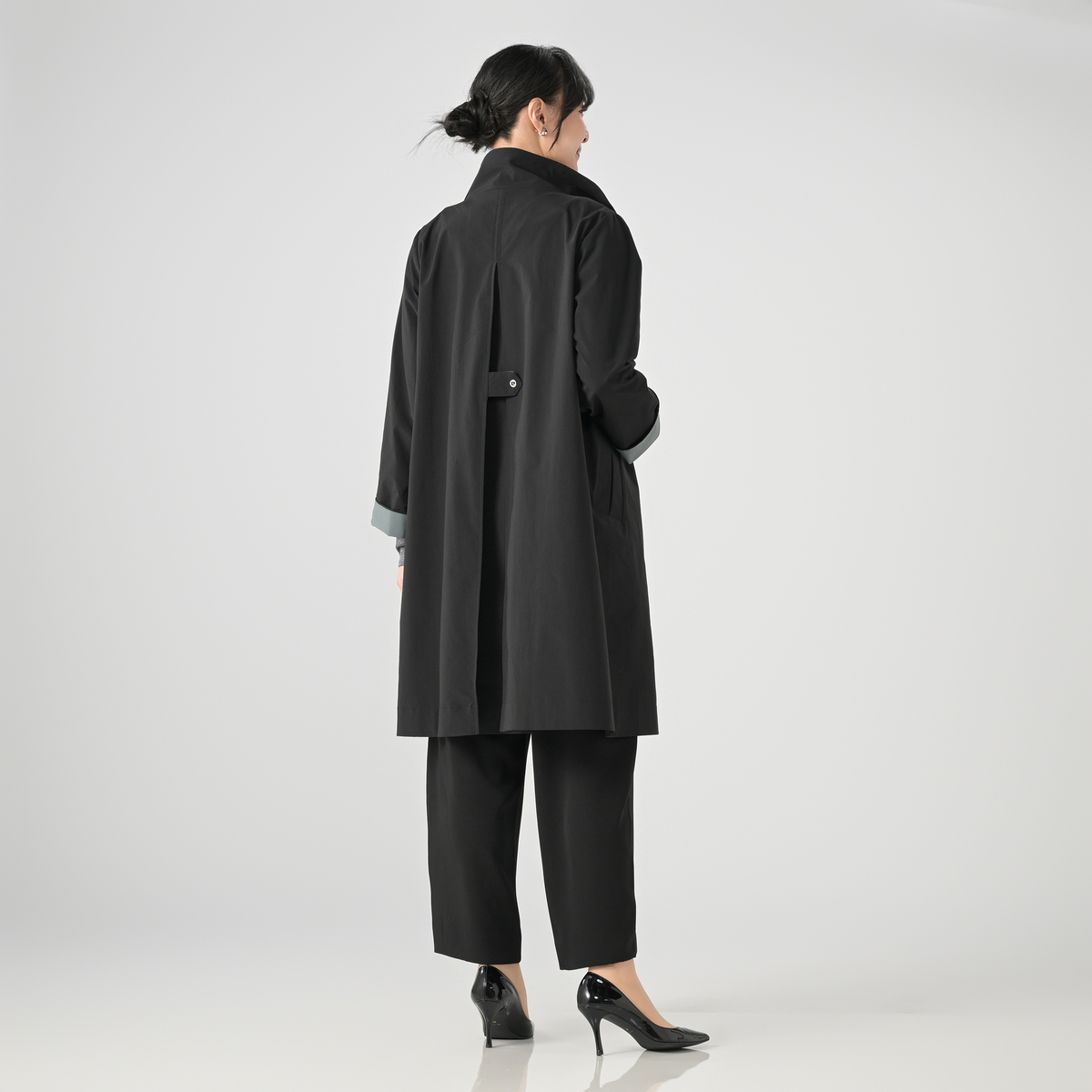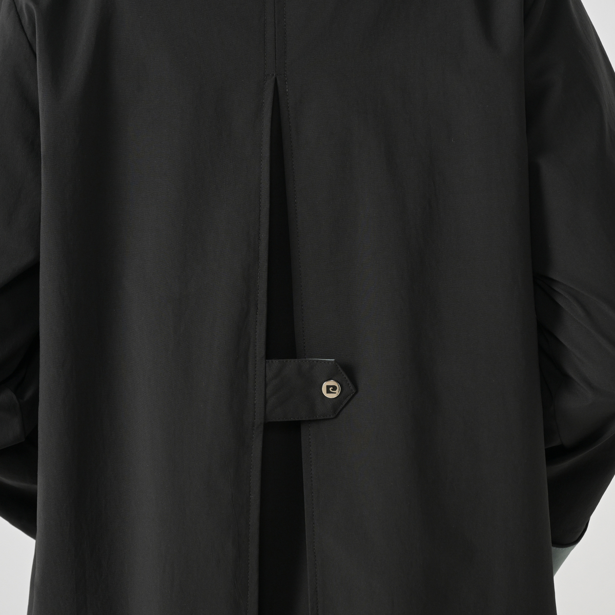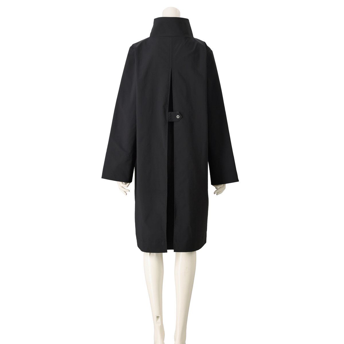 縦長のラインが際立つストレートシルエットのコート。裾幅を抑えた設計で全体をすっきり見せつつ、後ろ中心にはボックスタックを入れ、見た目以上のゆとりを両立させつつ、共地タブで広がりを抑え、背中から縦の流れを強調。玉ぶち仕様のダブルワイドポケットが立体感を加え、きちんとした印象に仕上げています