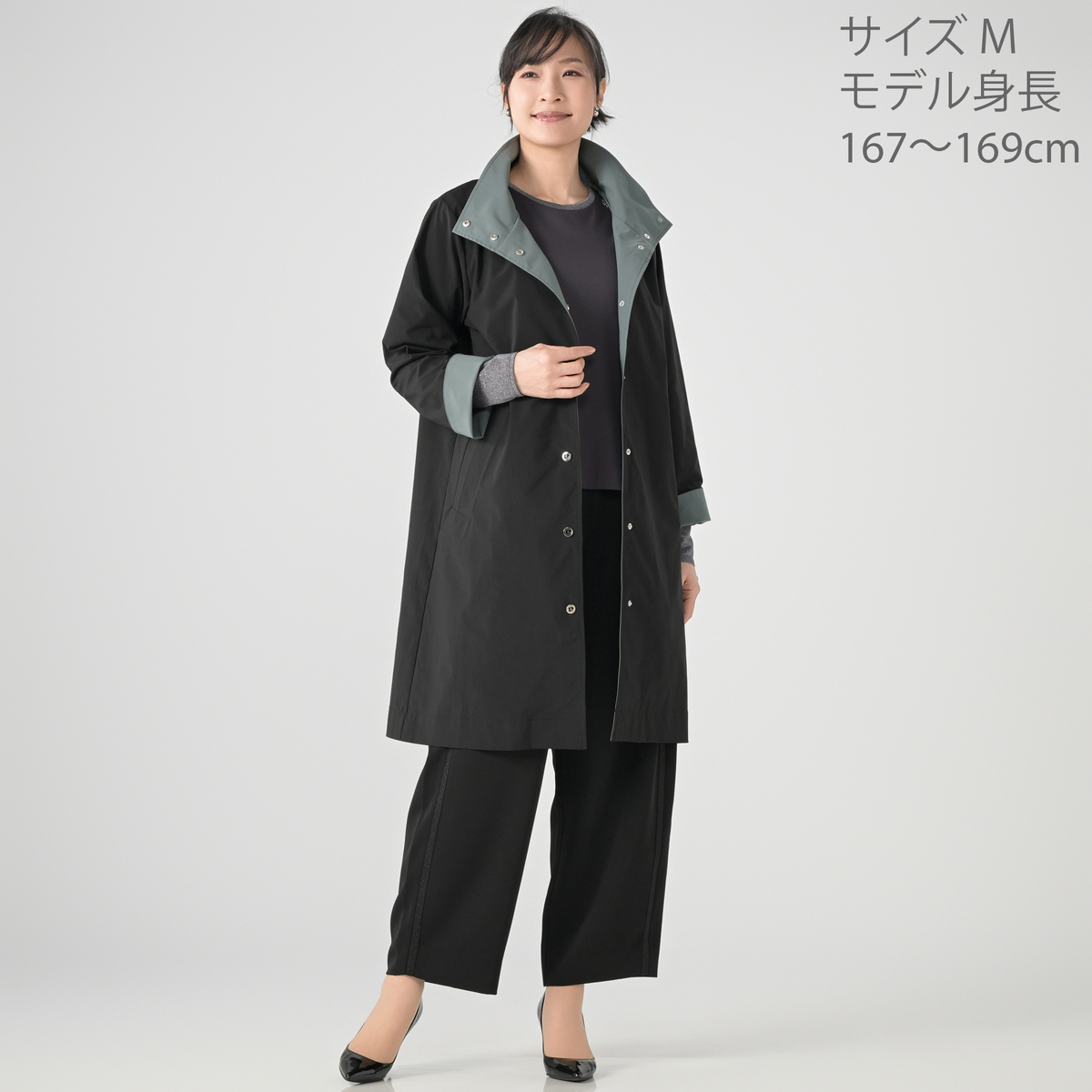 [商品寸法(ヌード)cm] サイズ バスト 着丈 肩幅 S: 102(72〜80) 94 38 M: 108(79〜87) 94 39 L: 112(86〜94) 95 41 LL: 116(93〜101) 96 43 3L: 124(100〜118) 97 47 サイズ 袖丈 S: 60 M: 60 L: 60 LL: 60 3L: 60 [素材] ポリエステル100% [お手入れ] 洗濯機洗い可 [注意事項] ※商品寸法の誤差は多少発生します。ご了承下さい ※蛍光増白剤入り洗剤を使用しないで下さい ※もみ洗いはお避け下さい ※洗濯後はすぐに脱水し、形を整えて干して下さい。長時間水につけたままにしないで下さい ※洗濯の際は裏返しにし、洗濯ネットを使用して下さい ※デリケートな素材を使用していますので、爪やアクセサリーなどの引っ掛かりによりキズがつきやすくなっております。縫目や生地を強く引っ張らないよう注意して下さい ※アイロンの際は、あて布をご使用下さい ※染色の性質上、洗濯すると色落ちする事があります。淡色や白物と組み合わせての着用や洗濯はお避け下さい ※着用中の摩擦により他の衣料やバッグ、椅子等に色移りすることがあります。淡色・白の製品と組み合わせての着用や洗濯はお避け下さい。また、雨や汗等で濡れた状態で着用すると色移りすることがあります。その際はお早めに洗濯をして下さい ※使用している装飾部分は、非常にデリケートなため、摩擦や引っ張り、衝撃などにより、脱落したり破損したりする恐れがありますので、ていねいにお取り扱い下さい ※過度な引っ張りを受けると縫い目が開くことがありますので、取り扱いには注意して下さい ※ボタン、ホックの付いているものはボタン、ホックにアイロンを当てないで下さい ※スナップボタンの開閉を無理に行うと、破損や製品の型崩れ、生地破れなどを起こす恐れがあります。着脱の際は丁寧に扱って下さい ※洗濯後は重ね置きしないで下さい ※この製品は、撥水加工を施しています。永久的なものではなく、洗濯やクリーニングを繰り返すことで効果は徐々に薄れていきます ※洗濯や使用により徐々に撥水加工効果がなくなります。その場合は市販の撥水スプレー等の使用をおすすめします 【中国製】
