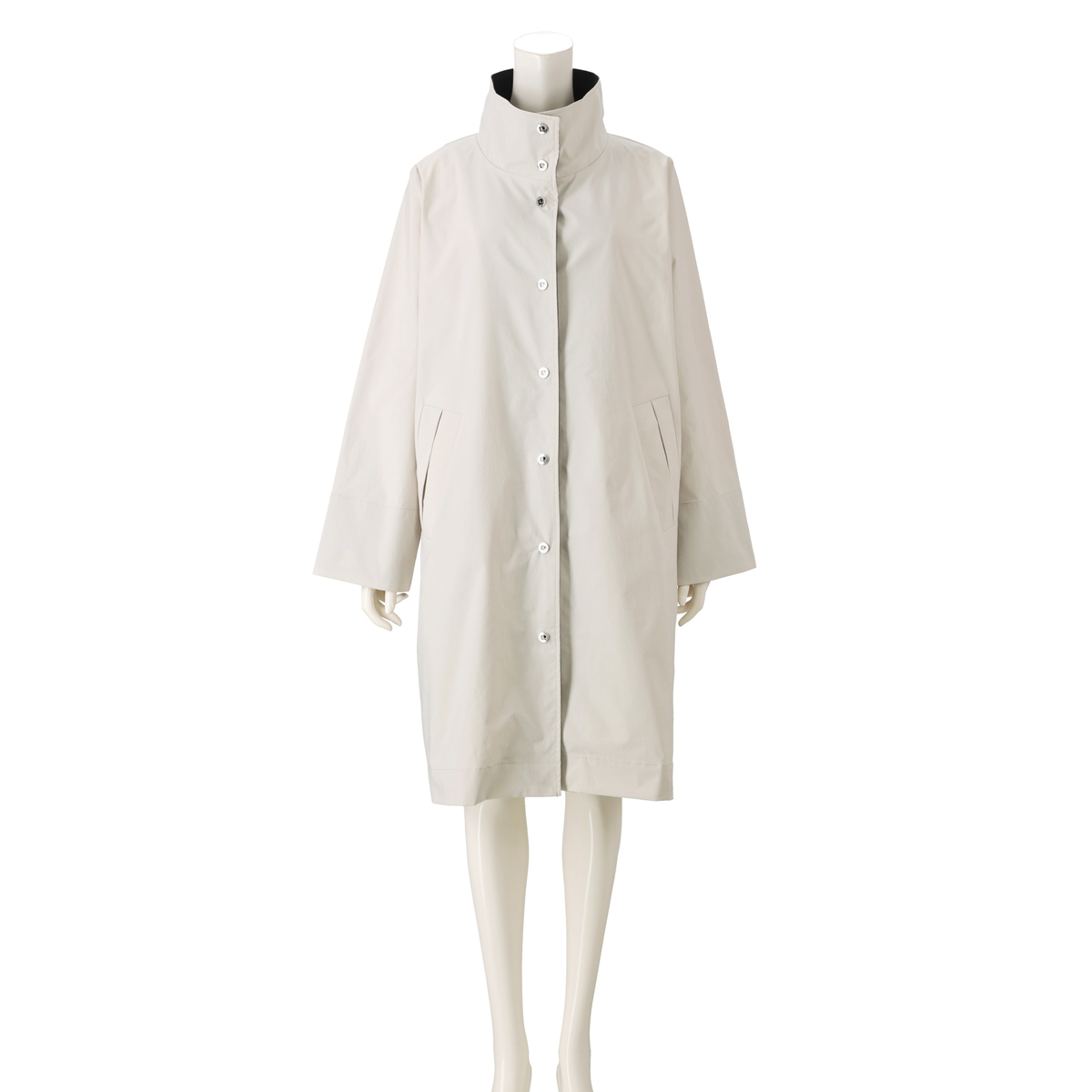 密に織られた張りのある素材を使用。体のラインを拾いにくく、さらっとした手触りとシルキーマットな表面感が上質な印象を与えます。軽やかで季節を問わず着やすく、表面には撥水加工も施しています
