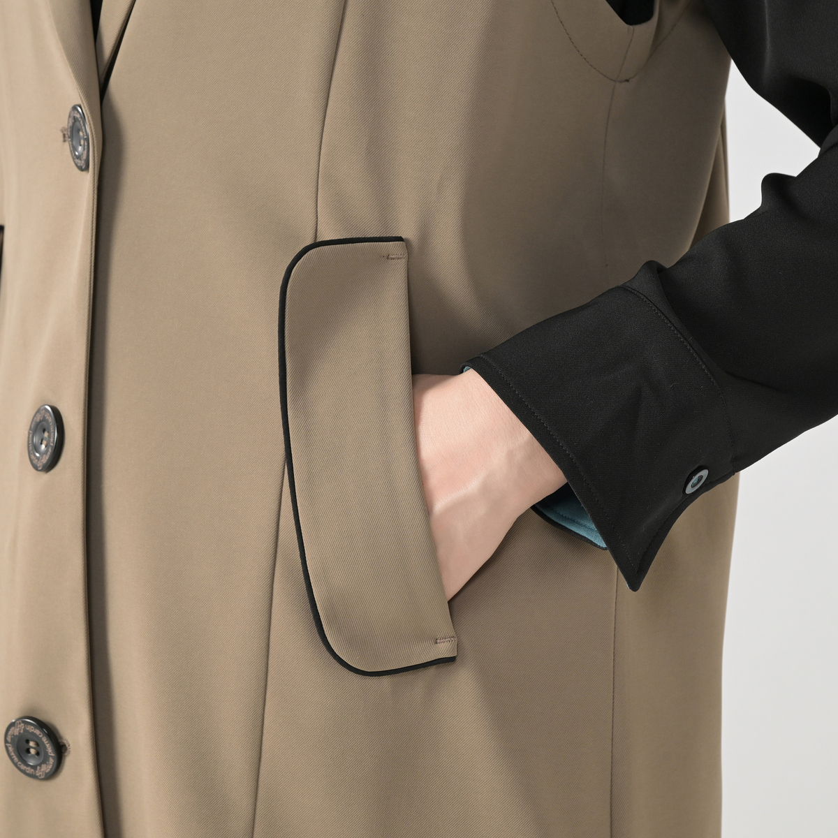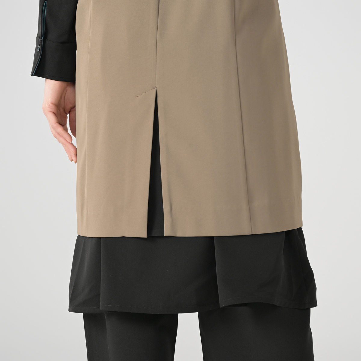 上質感のある高密度ツイルを使用。やさしい光沢と滑らかな手触りが特長の布帛素材で、クラシカルさとモダンさをあわせ持っています。裏地のない軽やかな仕立てでロングシーズン着用しやすく、見返し端やポケット袋布端に施した配色トリミングが、脱いだ瞬間まで上品さを演出します