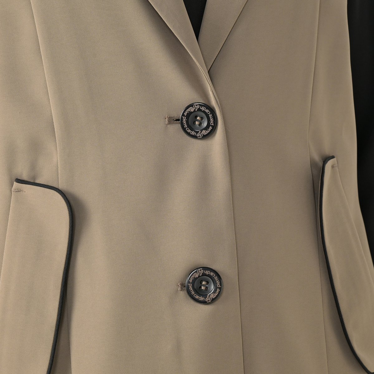 ポケット端やアームホール裏、ベンツ裏に配色を施し、上品さの中に程よいアクセントを添えています。肩から裾へ続くパネルシーム(切り替え)が縦ラインを強調し、体型をすっきりと見せながら、ブランドロゴ入りボタンが細部へのこだわりを感じさせます