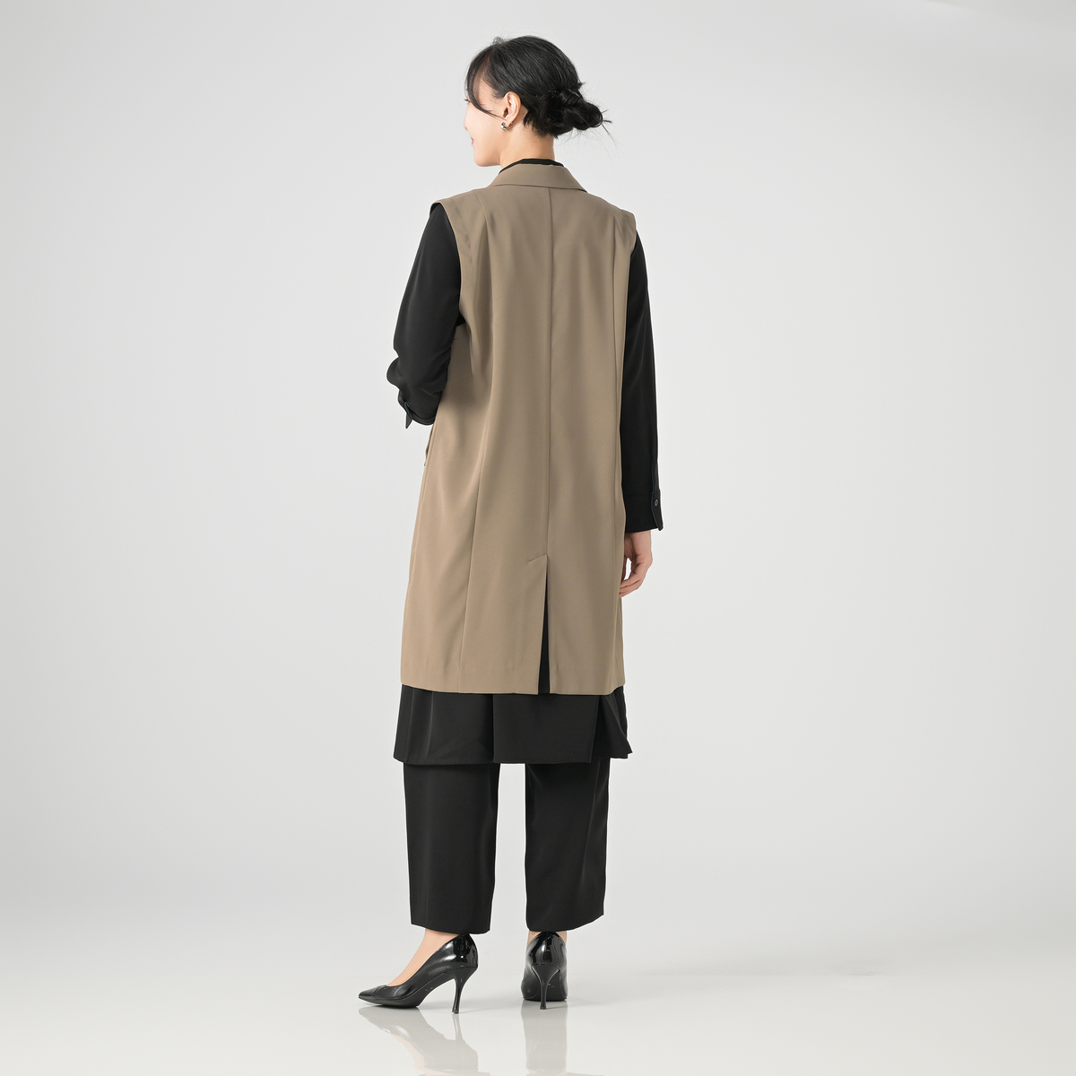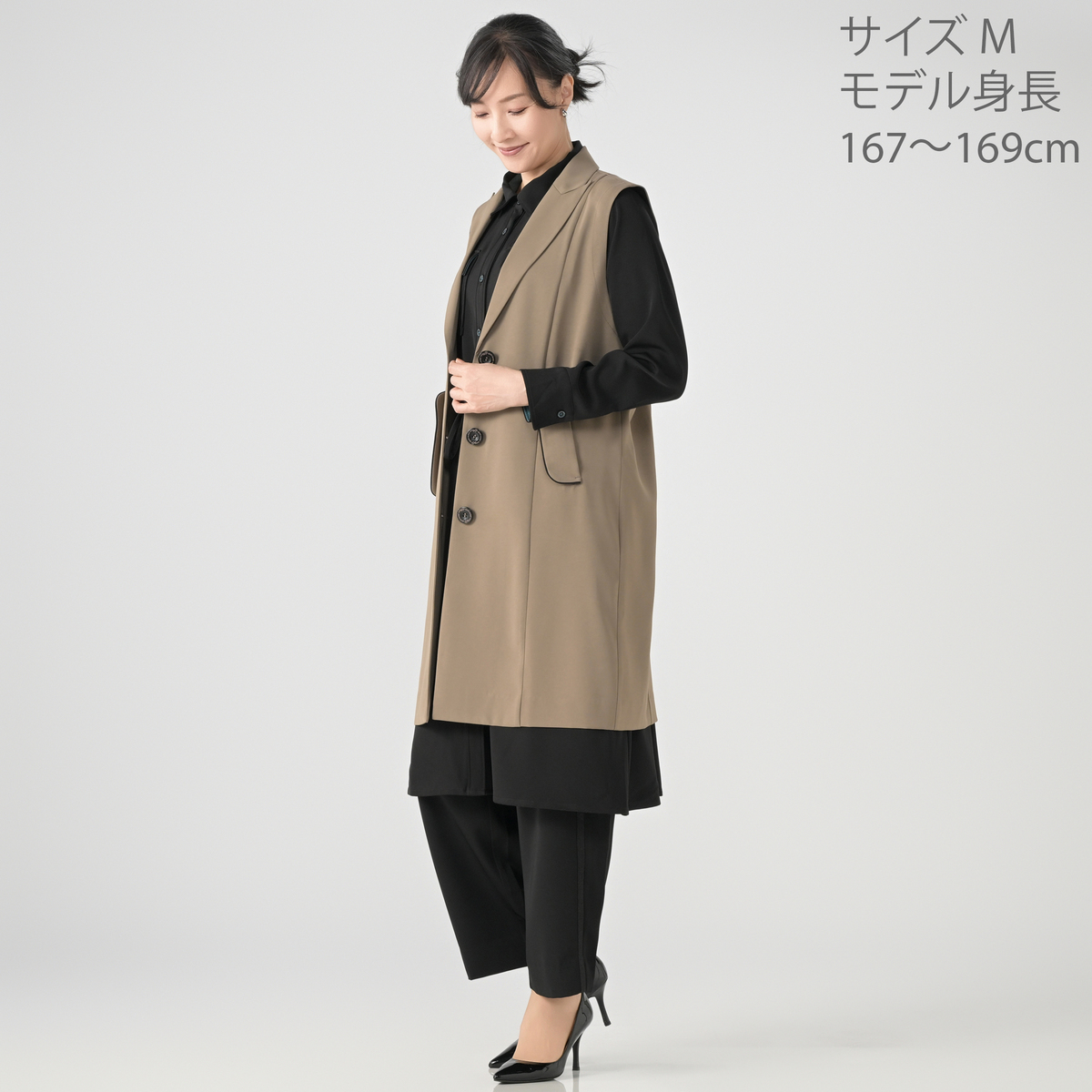 Iラインシルエットのジレ。全体を直線的に見せつつ配色を効かせることで、スタイルアップ効果が期待できます。ピークドラペルの衿元が顔まわりをすっきりと整え、羽織るだけで洗練された印象に。カジュアルからきれいめまで幅広い組合せに対応します