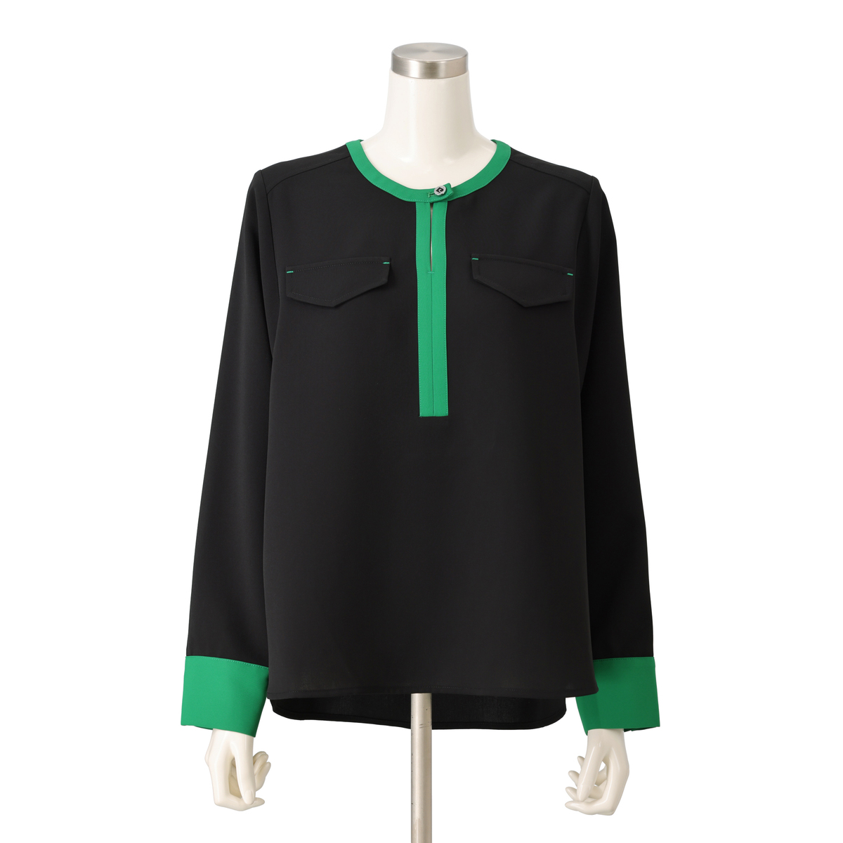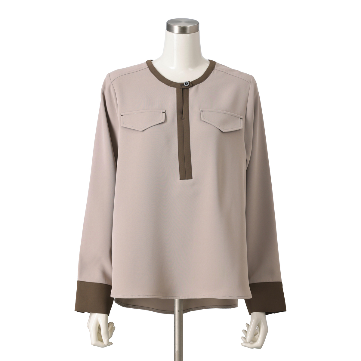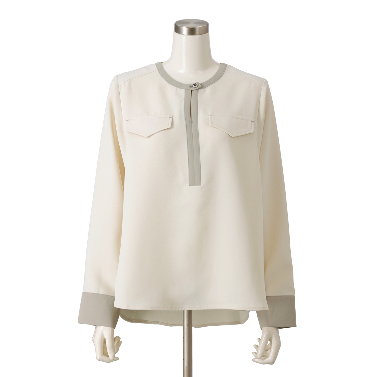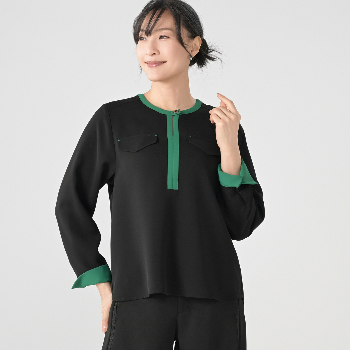 キーネック風デザインの布帛プルオーバーです。衿ぐり・前立て・袖口の配色使いが、クラシカルでスタイリッシュな印象に。シルバーカラーのオリジナルロゴボタンが装いにモード感を添えます