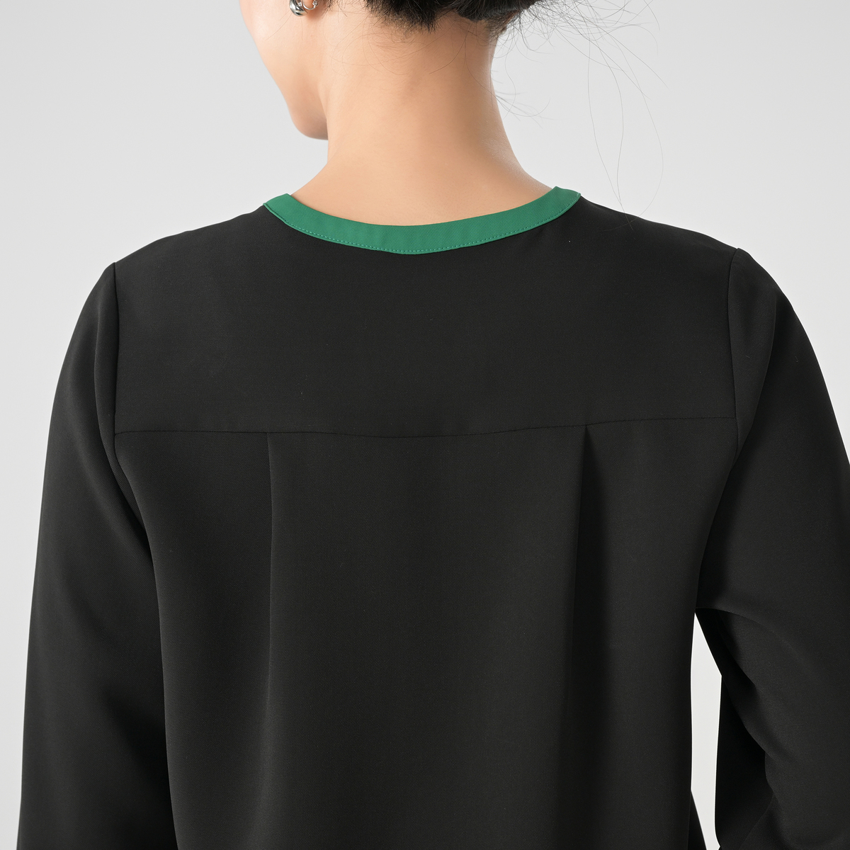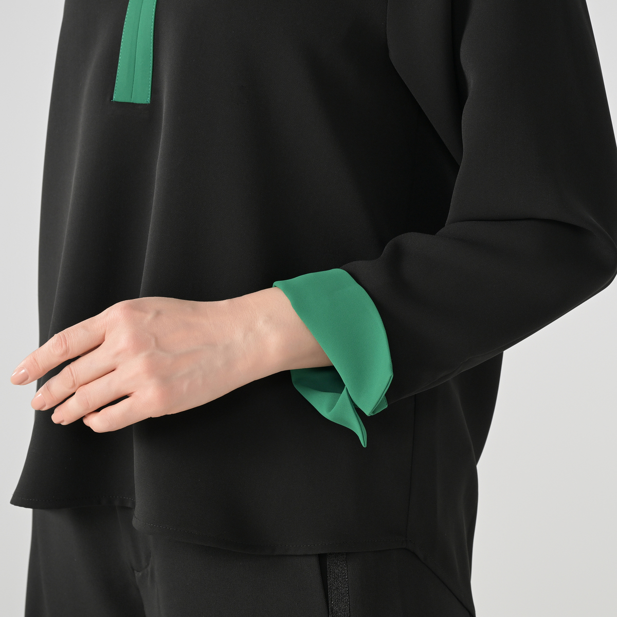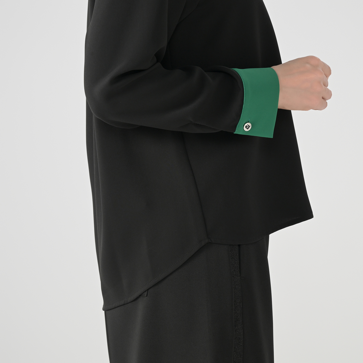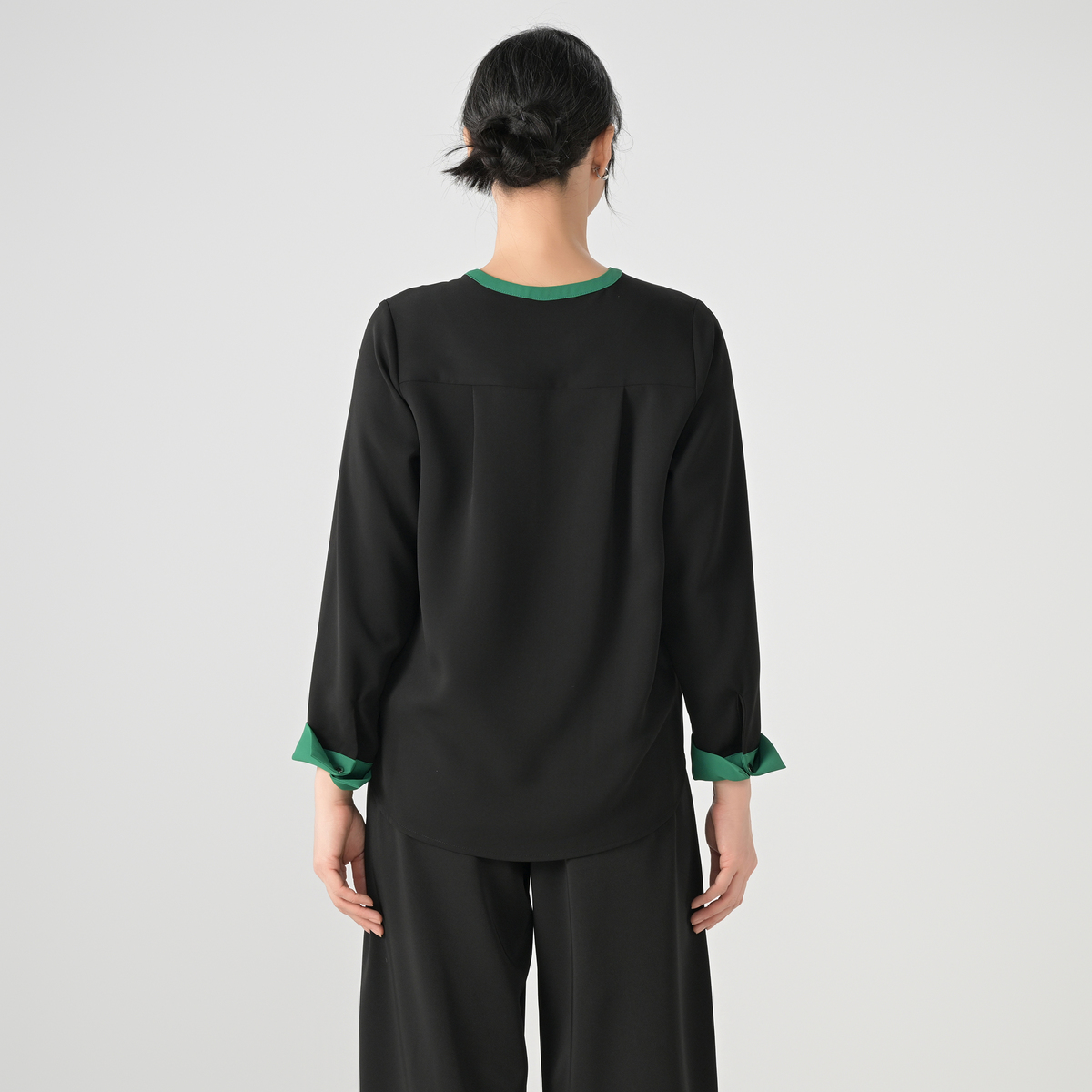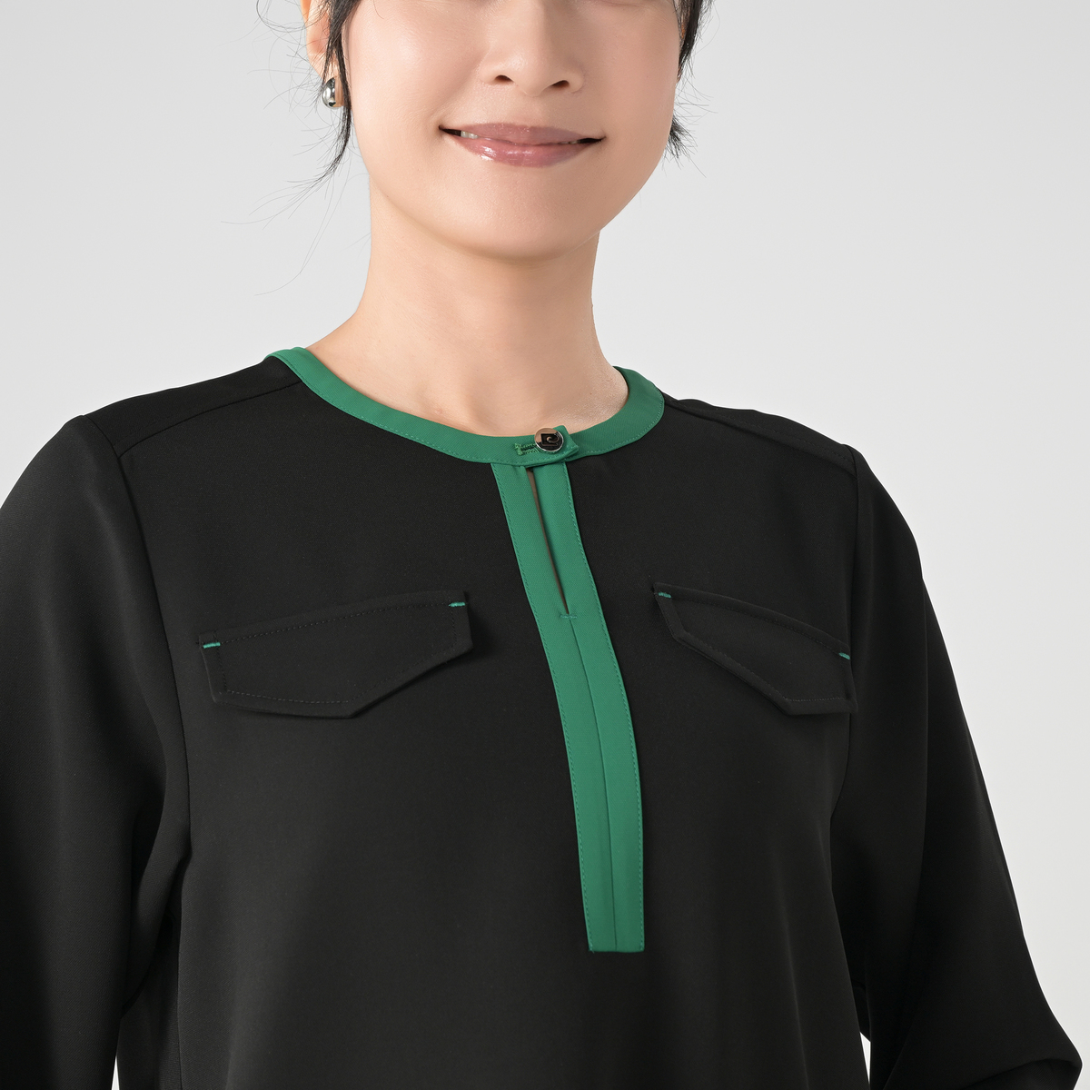 キーネック風デザインの布帛プルオーバーです。衿ぐり・前立て・袖口の配色使いが、クラシカルでスタイリッシュな印象に。シルバーカラーのオリジナルロゴボタンが装いにモード感を添えます