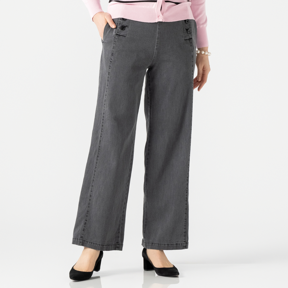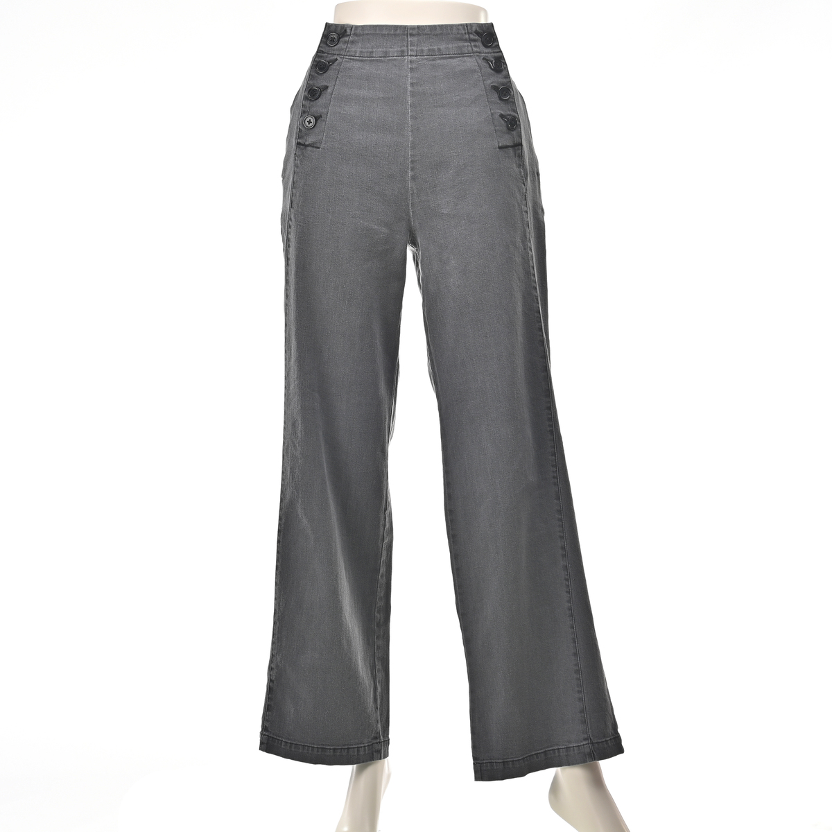 フロントサイドに並べたボタンが特徴のデニムパンツ。トレンド感のあるマリンスタイルを楽しめます