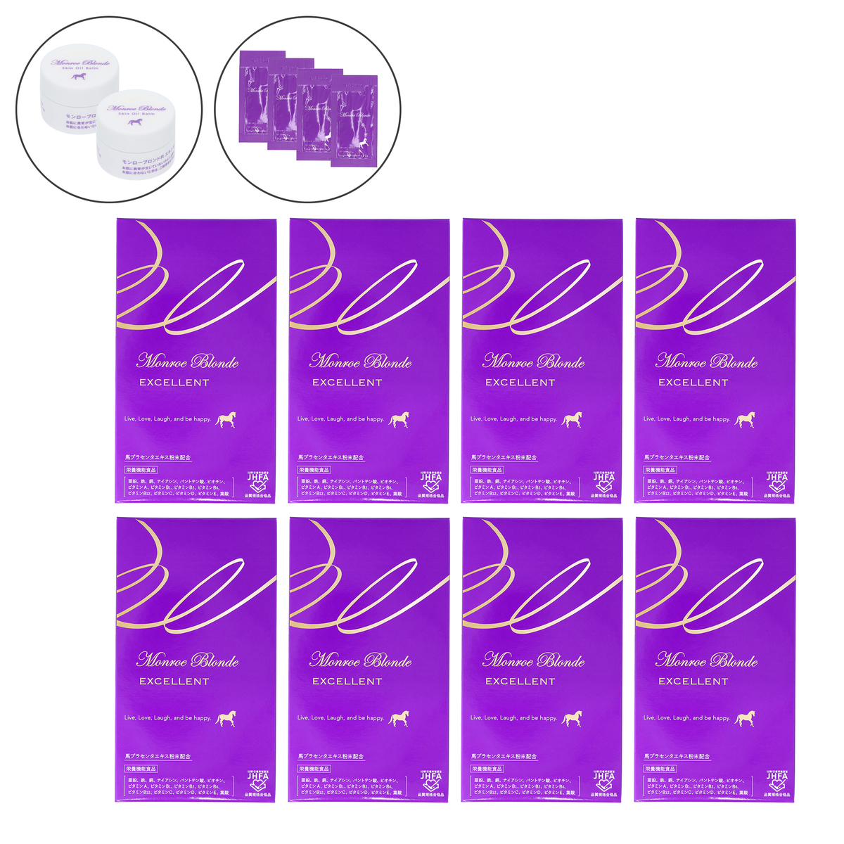 [アレルギー物質特定原材料8品目] 乳 [目安量] 1日1カプセル [栄養成分表示 1カプセル(457mg)あたり] エネルギー 1.81Kcal たんぱく質 0.22g 脂質 0.034g 炭水化物 0.16g 食塩相当量 0.006g 亜鉛 3.1mg 鉄 2.4mg 銅 0.32mg ナイアシン 4.6mg パントテン酸 1.9mg ビオチン 20μg ビタミンA 270μg ビタミンB1 0.6mg ビタミンB2 0.7mg ビタミンB6 0.65mg ビタミンB12 1.2μg ビタミンC 35mg ビタミンD 2.0μg ビタミンE 2.25mg ビタミンK 0.4μg 葉酸 120μg [保存方法] 高温、多湿及び直射日光を避けて保存してください [注意事項] ※お子様の手の届かないところに保管してください ※原材料をご確認の上、食物アレルギーのある方はお召し上がりにならないでください。体質に合わない場合は、本品の飲用をおやめください ※疾病などで治療中の方や妊娠中の方がご利用になる場合は、事前に医師にご相談ください ※本品は、多量摂取により疾病が治癒したり、より健康が増進するものではありません。妊娠3か月以内又は妊娠を希望する女性は過剰摂取にならないよう注意してください。葉酸は、胎児の正常な発育に寄与する栄養素ですが、多量摂取により胎児の発育が良くなるものではありません。亜鉛の摂りすぎは、銅の吸収を阻害するおそれがありますので、過剰摂取にならないよう注意してください ※1日の摂取目安量を守ってください。乳幼児・小児は本品の摂取を避けてください ※本品は、特定保健用食品と異なり、消費者庁長官による個別審査を受けたものではありません ※食生活は主食、主菜、副菜を基本に、食事のバランスを ■栄養機能食品(亜鉛、鉄、銅、ナイアシン、パントテン酸、ビオチン、ビタミンA、ビタミンB1、ビタミンB2、ビタミンB6、ビタミンB12、ビタミンC、ビタミンD、ビタミンE、葉酸) [原料原産地] プラセンタエキス純末(馬由来)(国内製造) 【日本製】 [セット内容] ・モンローブロンド100Rエクセレント120日分スキンケア付セット×2 [原材料] モンローブロンド100Rエクセレント120日分:プラセンタエキス純末(馬由来)(国内製造)、コーンスターチ、ビタミンE含有植物油、ビタミンK2含有食用油脂粉末/プルラン、ビタミンC、ステアリン酸Ca、グルコン酸亜鉛、ピロリン酸第二鉄、微粒二酸化ケイ素、 ナイアシンアミド、リン酸Ca、グルコン酸銅、パントテン酸Ca、塩化カリウム、ベタイン、ビタミンB2、ビタミンB6、ビタミンB1、キビ色素、カラギナン、ビタミンA、葉酸、ビオチン、ビタミンD、ビタミンB12、(一部に大豆・乳成分を含む) [成分1] モンローブロンドRセラムローション:水、BG、グリセリン、ジグリセリン、プラセンタエキス(ウマ)、サイタイエキス(ウマ)、マンダリンオレンジ果皮エキス、グアイアズレンスルホン酸Na、ヒト遺伝子組換オリゴペプチド-1、ヒト遺伝子組換ポリペプチド-11、水溶性コラーゲン、加水分解コラーゲン、ヒアルロン酸Na、アセチルヒアルロン酸Na、セラミドEOP、セラミドNG、セラミドNP、セラミドAP、ビオチン、 パンテニルエチル、3-O-エチルアスコルビン酸、パルミチン酸レチノール、トコフェロール、オタネニンジン根エキス、ローヤルゼリーエキス、ゴボウ根エキス、レモン果実エキス、セイヨウキズタ葉/茎エキス、オランダガラシ葉/茎エキス、セージ葉エキス、サボンソウ葉エキス、ニンニク根エキス、ローマカミツレ花エキス、アルニカ花エキス、 オドリコソウ花/葉/茎エキス、セイヨウアカマツ球果エキス、ローズマリー葉エキス、キュウリ果実エキス、セイヨウニワトコ花エキス、ゼニアオイ花エキス、パリエタリアエキス、トウキンセンカ花エキス他 モンローブロンドRスキンオイルバーム:スクワラン、オリーブ果実油、キャンデリラロウ、セスキイソステアリン酸ソルビタン、ホホバ種子油、コメヌカロウ、カルナウバロウ、プラセンタエキス(ウマ)、サイタイエキス(ウマ)、マンダリンオレンジ果皮エキス、 グアイアズレン、パルマローザ油、セージ油、ローズマリー葉油、ラベンダー油、ニオイテンジクアオイ油、グレープフルーツ果皮油、マンダリンオレンジ果皮油、イタリアイトスギ葉油、ダマスクバラ花油、ジパルミトイルヒドロキシプロリン、イソステアリン酸、ポリクオタニウム-61、グリチルレチン酸ステアリル、ペンチレングリコール、トコフェロール、エタノール、水、BG