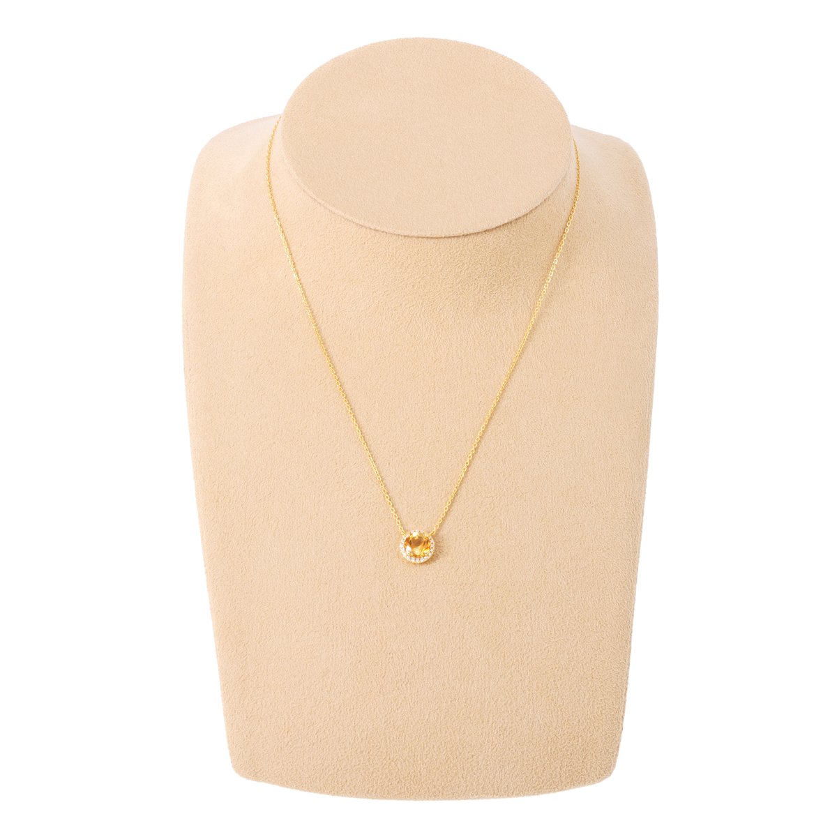 シトリンの鮮やかなイエローが際立つラウンドペンダント。メインストーンを細かなキュービックジルコニアで囲み、シンプルながら存在感ある仕上がりです。シトリンは富や繁栄、自信、希望の石言葉を持っています