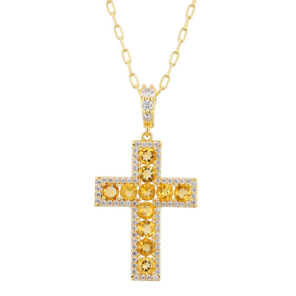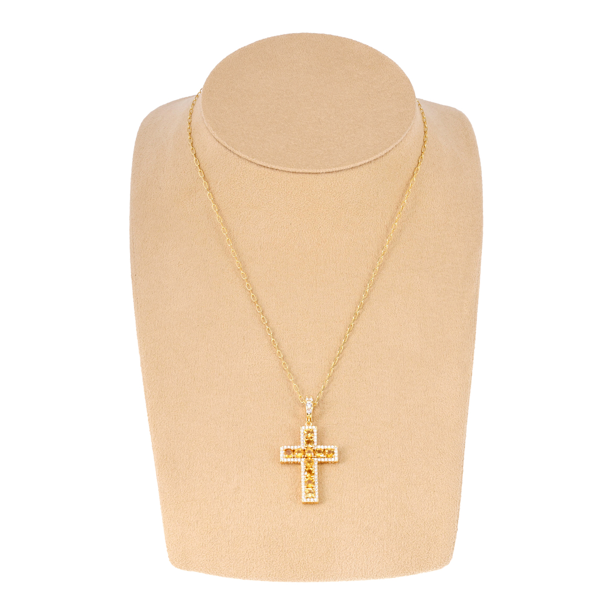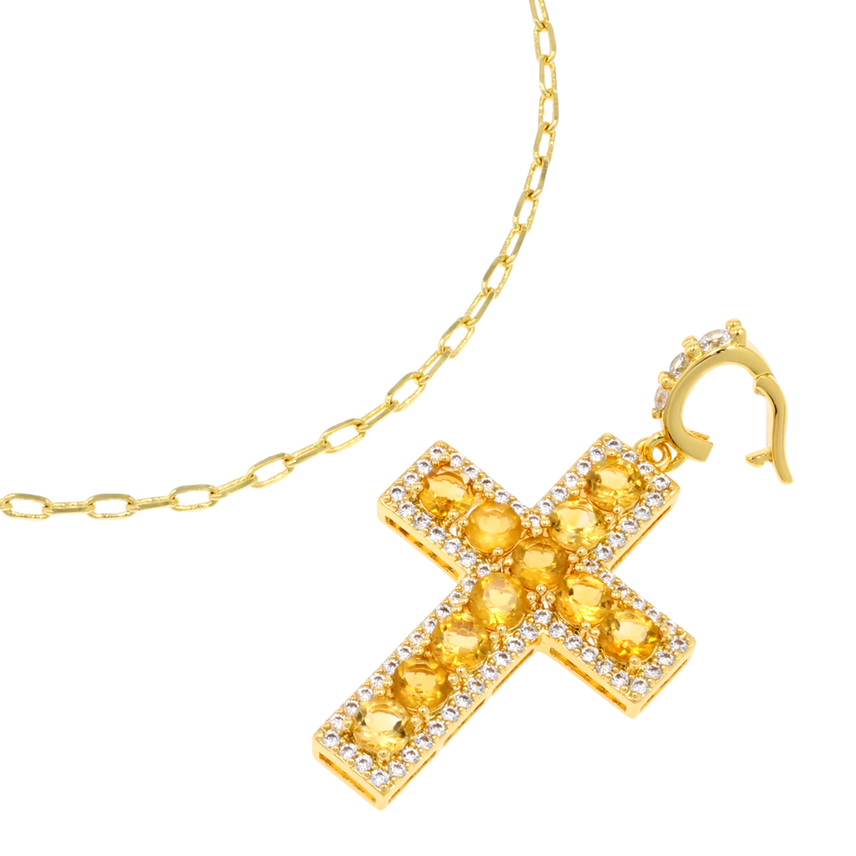 シトリンとキュービックジルコニアをライン状に敷き詰めたクロスモチーフのペンダント。爽やかなイエローとゴールドカラーの組合せが目を惹きます