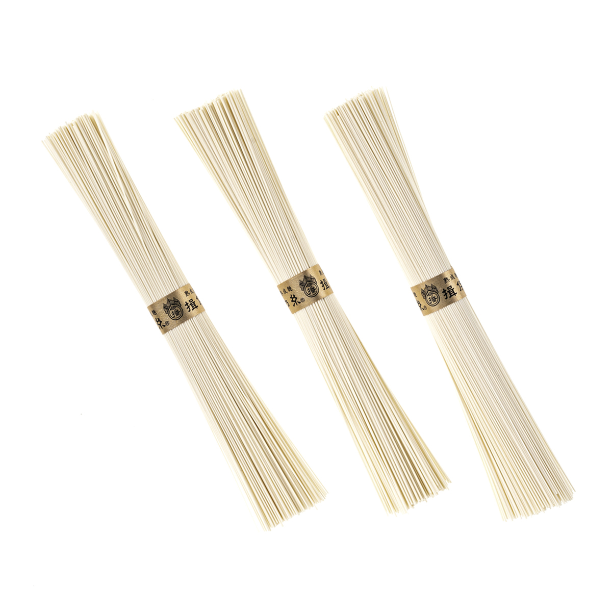 兵庫県龍野市を中心に、室町時代から始まり、600年以上の伝統がある播州手延素麺「揖保乃糸」*。熟成麺(金帯)は、12月〜翌年3月の製造後、1年間倉庫で保管して熟成させた、あじわい深い逸品です(麺の太さ:0.70〜0.90mm)