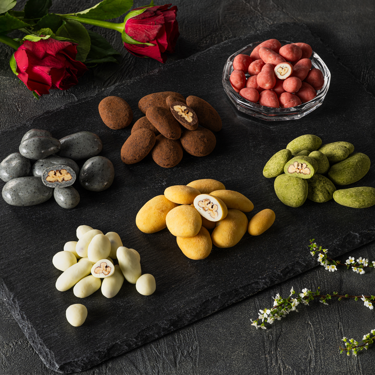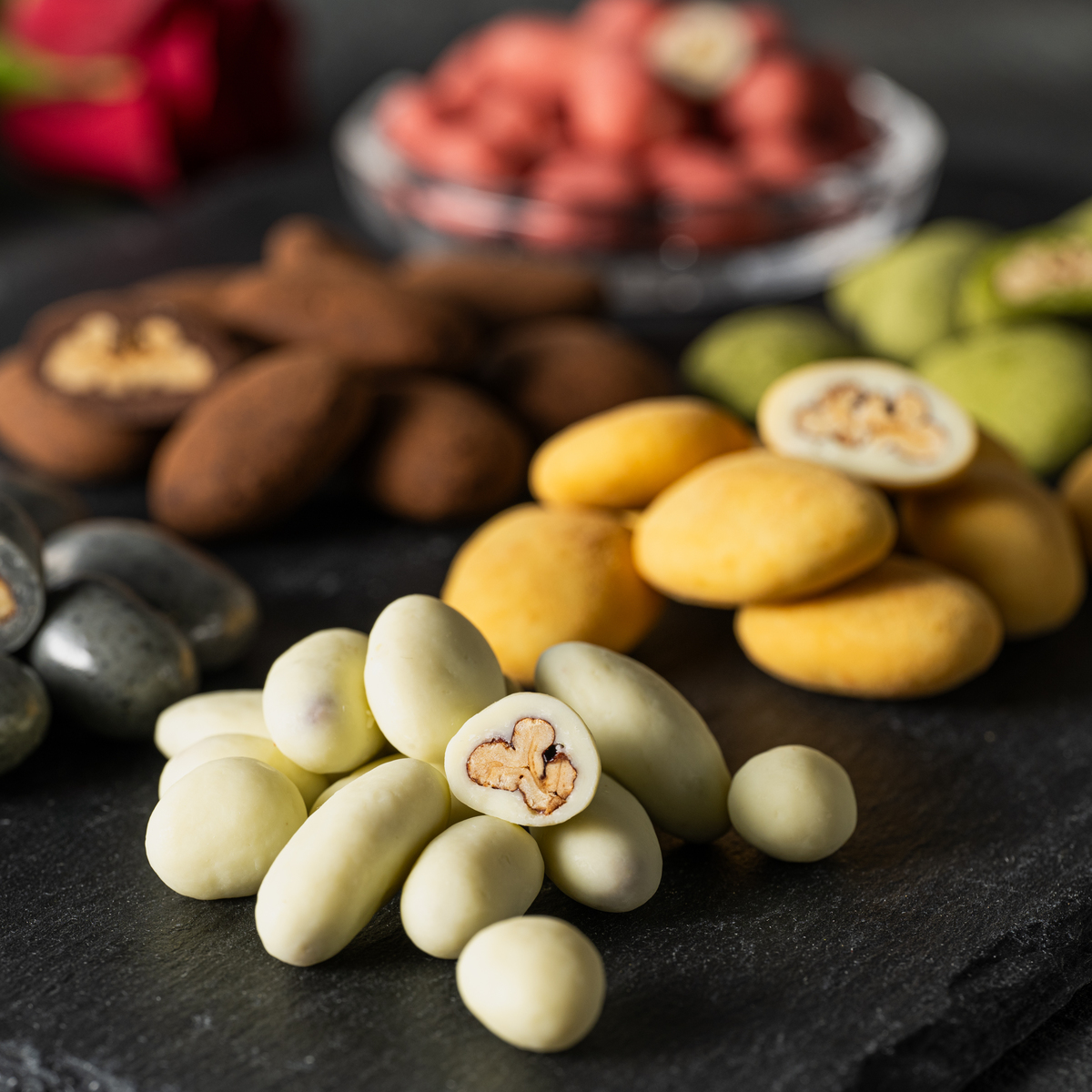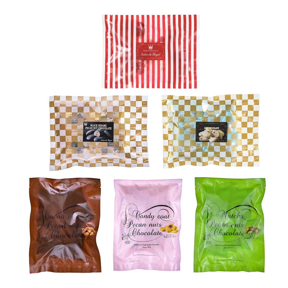*キャンディコートピーカンナッツチョコ、抹茶ピーカンナッツチョコ、黒ゴマピーカンナッツチョコ、ストロベリーピーカンナッツチョコ