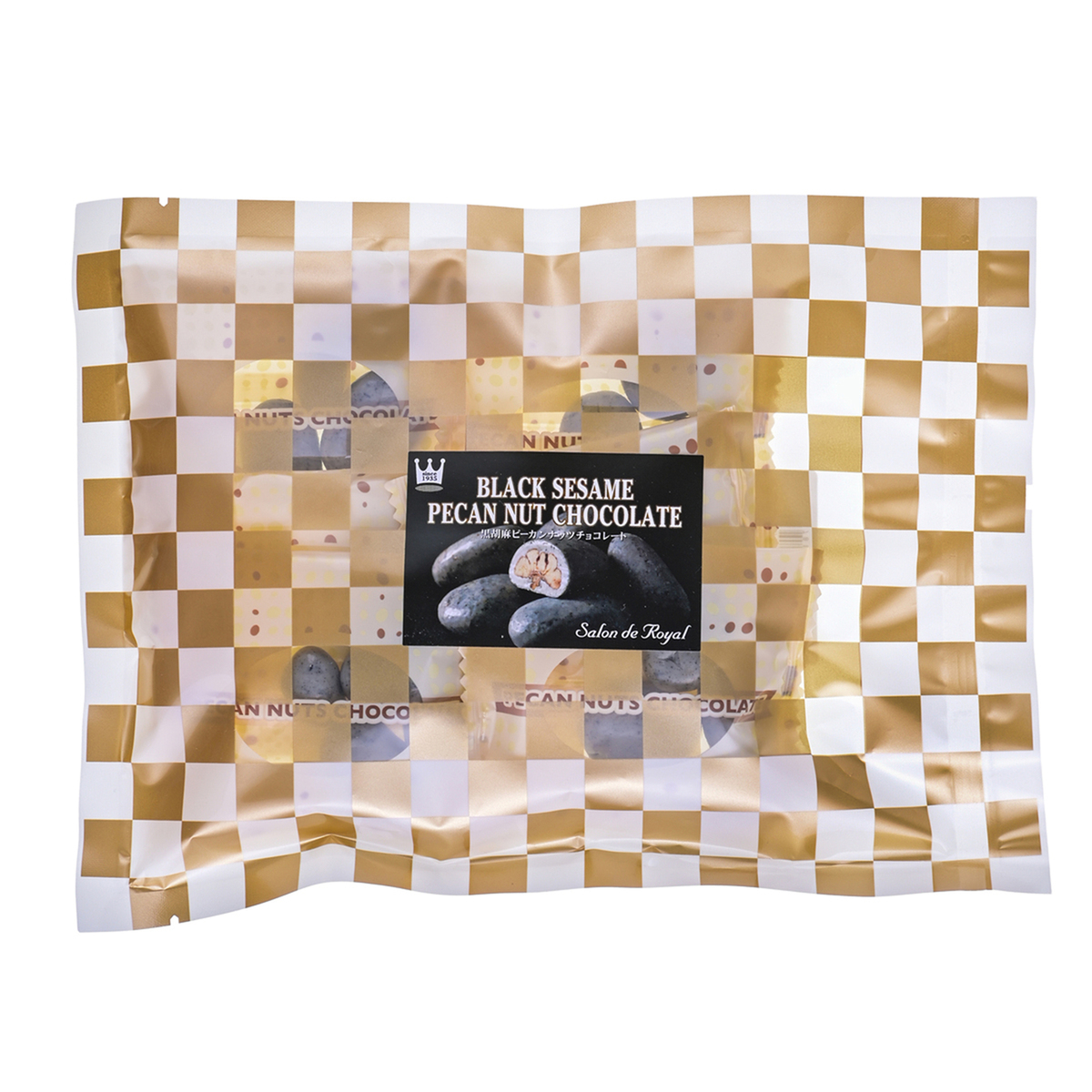 キャンディコーティングされたピーカンナッツに、ホワイトチョコレートに黒ゴマペーストを丹念に練りこんだものをコーティング。さらに黒ゴマ粉末を使用しました