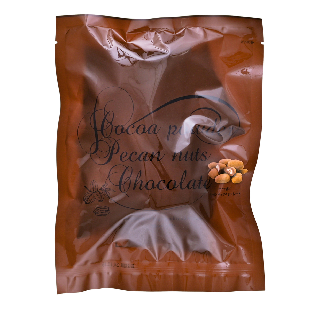 キャンディコーティングされたピーカンナッツをミルクチョコレートでコーティング。最後にほろ苦いココアパウダーをかけました