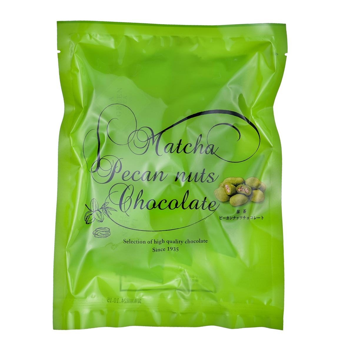 キャンディコーティングされたピーカンナッツを、抹茶とホワイトチョコを混ぜた抹茶チョコでコーティング。最後に抹茶パウダーをまぶしました