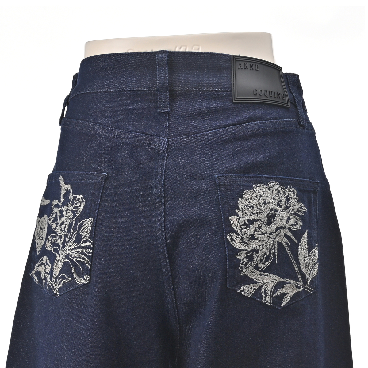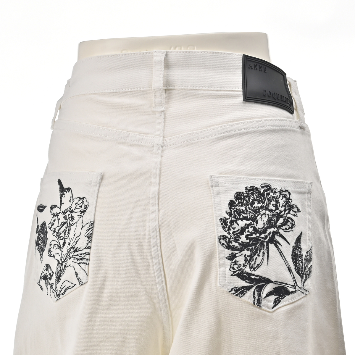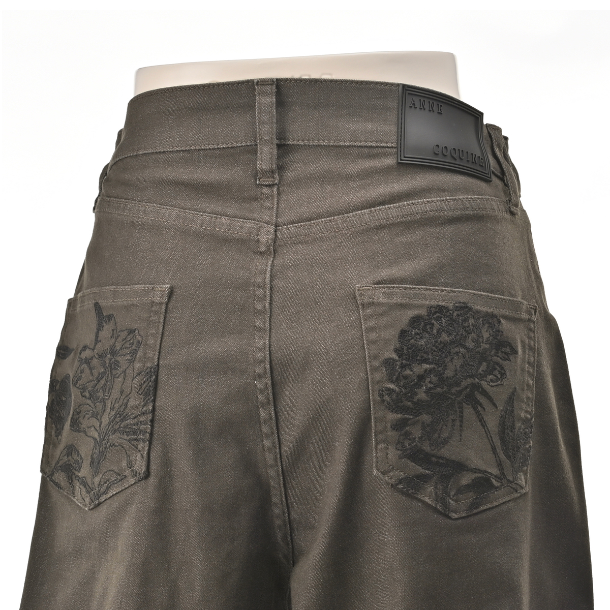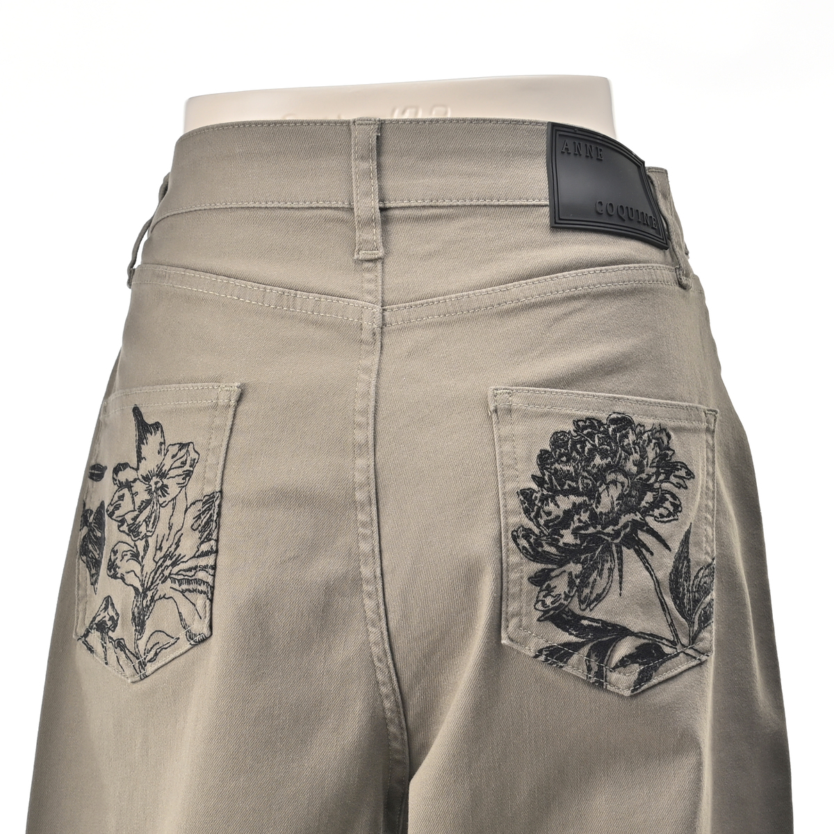 アンコキーヌで大人気のカーヴィーパンツ。裾にダーツ切り替えを入れた立体的なシルエットで、両脇ウエストは平ゴム入りに。後ろ左右パッチポケットにはフラワー柄の刺繍を施し、オリジナルタックボタン・リベットに加え、右腰部分にはオリジナルのシリコンパッチをたたき、こだわりのディテールを細部に散りばめました
