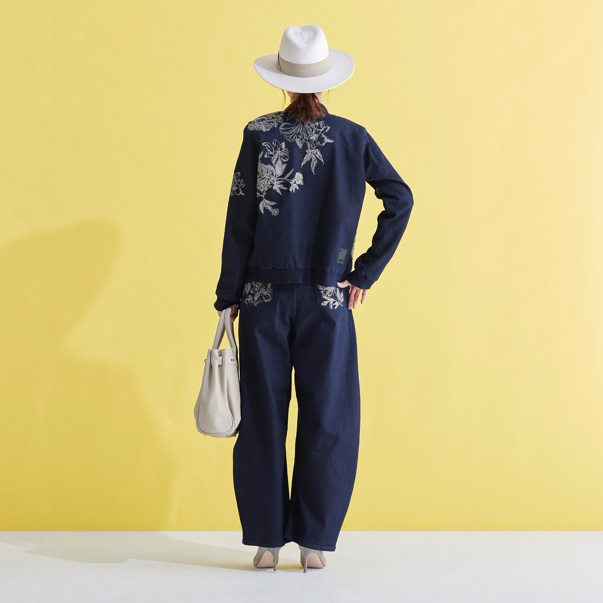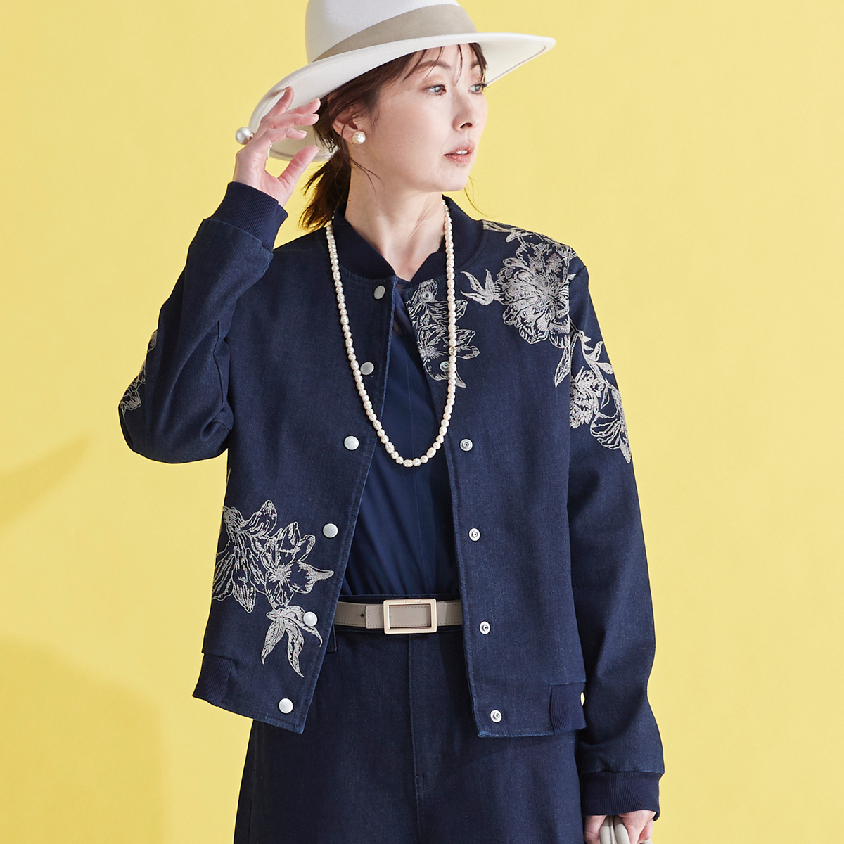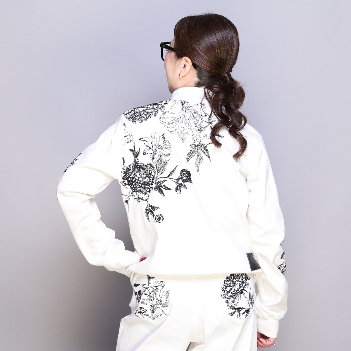 オリジナルフラワー柄の大胆な刺繍が目を惹くブルゾン。衿や袖口にはリブを使い、MA-1をイメージしたデザインに仕上げました