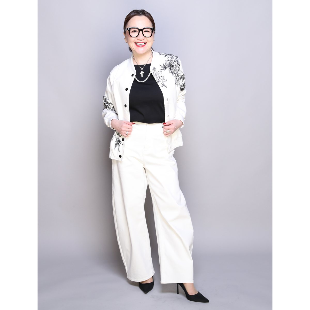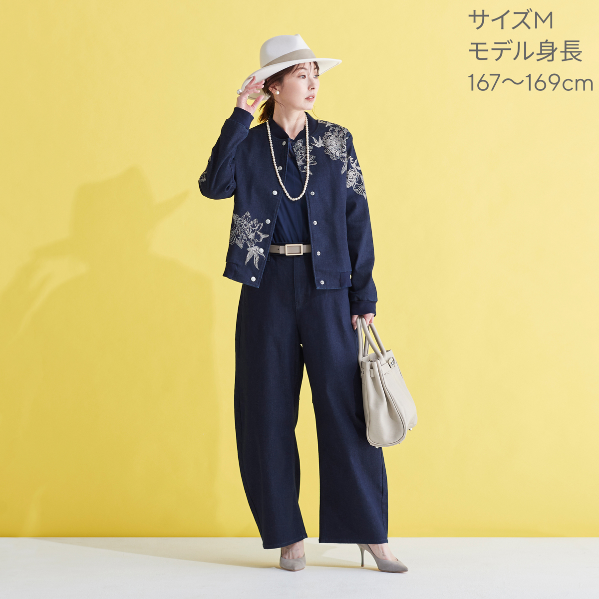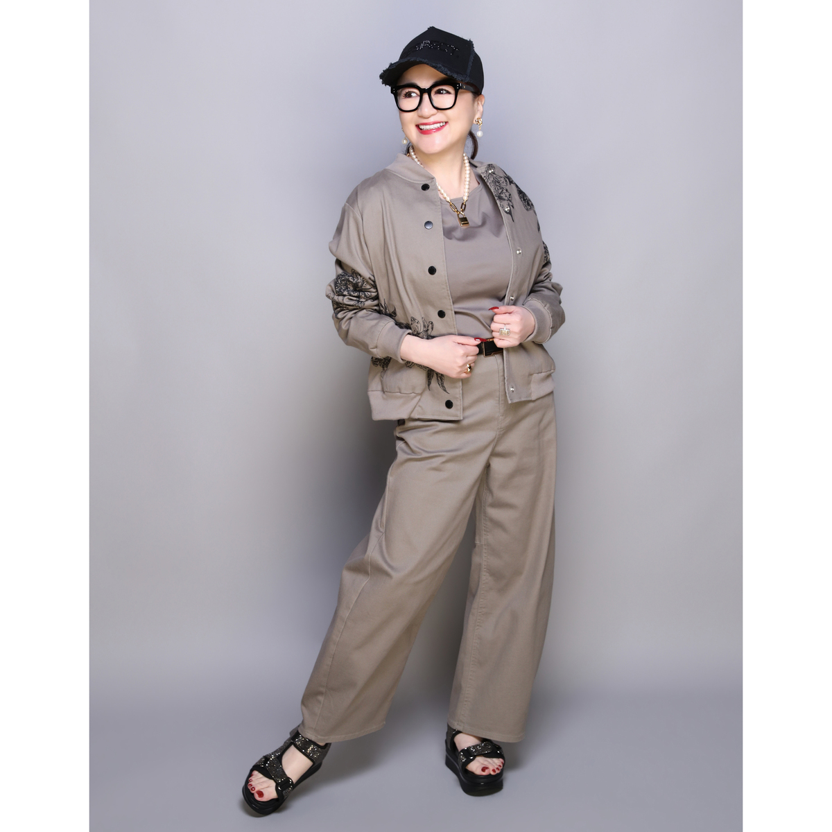 パンツ合わせでおしゃれ感のあるスタイリングに。同素材のカーヴィーパンツと組合せたセットアップコーデもおすすめです